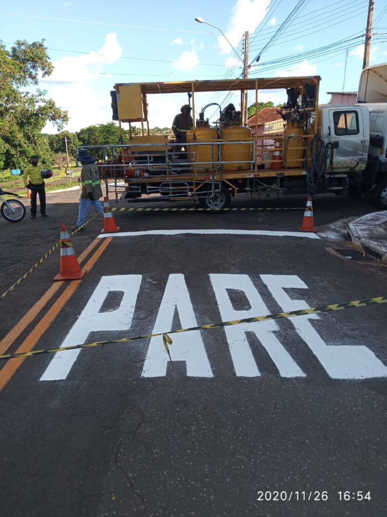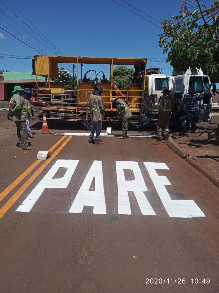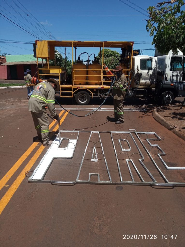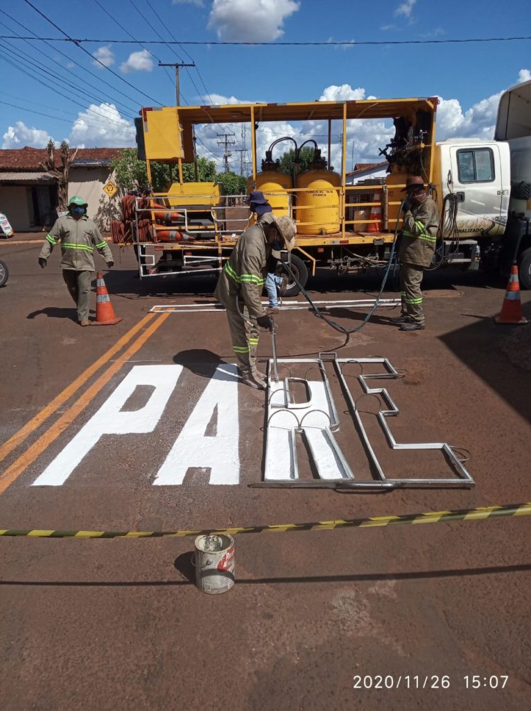 Homens estão trabalhando tanto na sinalização horizontal quanto na vertical. É necessário que os cidadãos santelenenses colaborem enquanto o serviço está sendo feito. Evite trafegar temporariamente pelas vias.