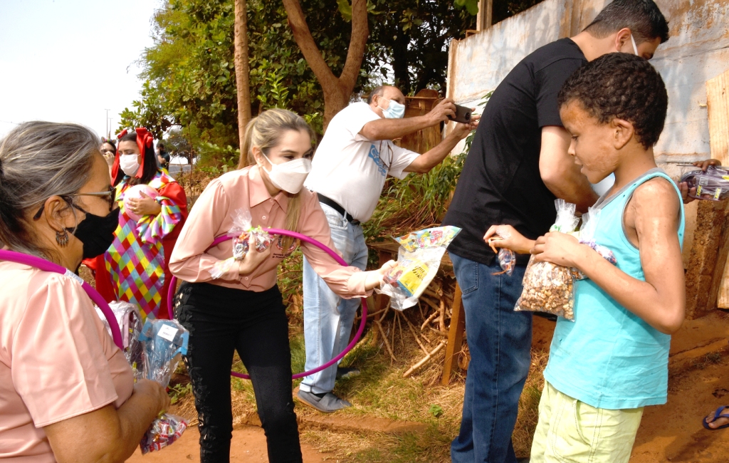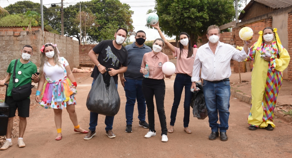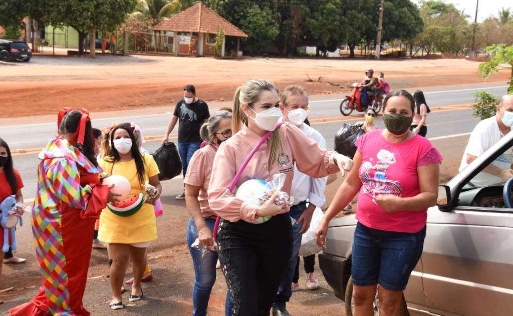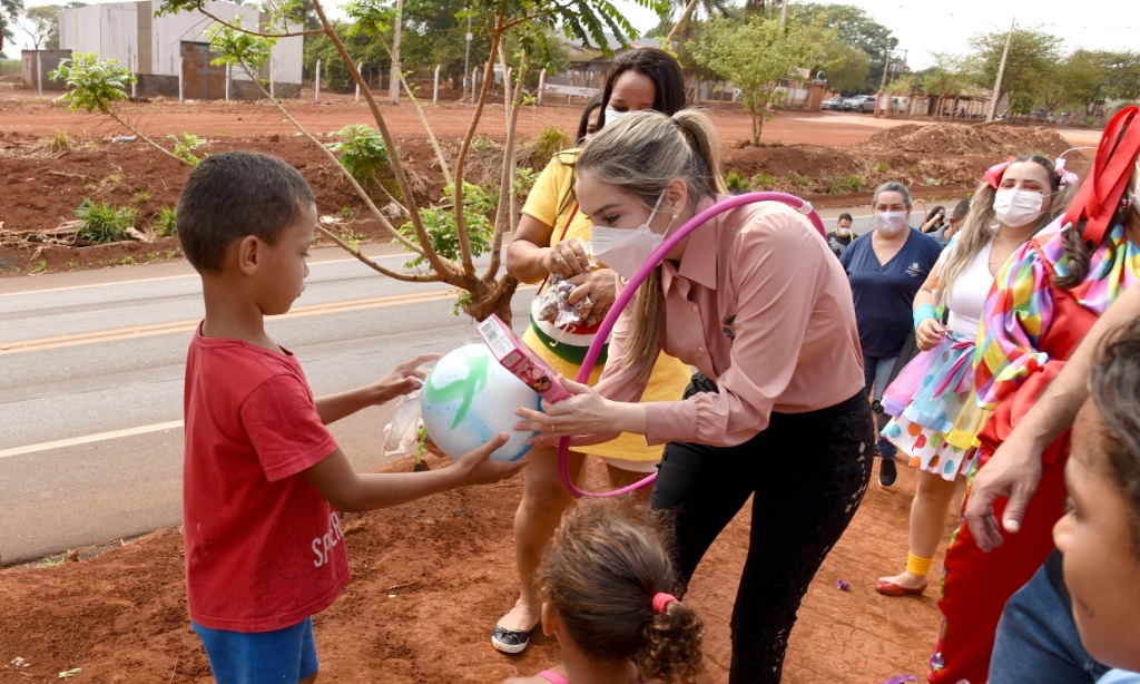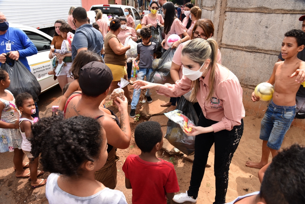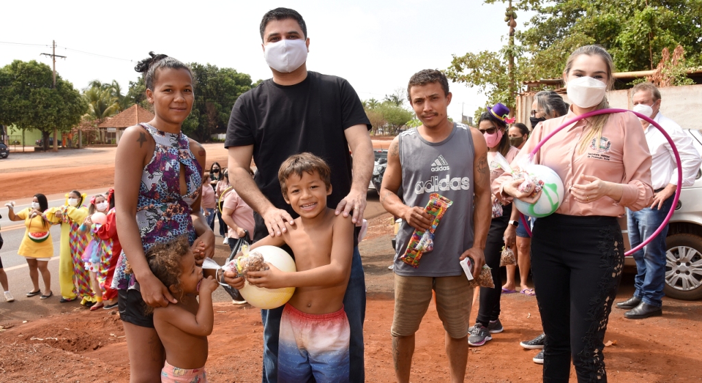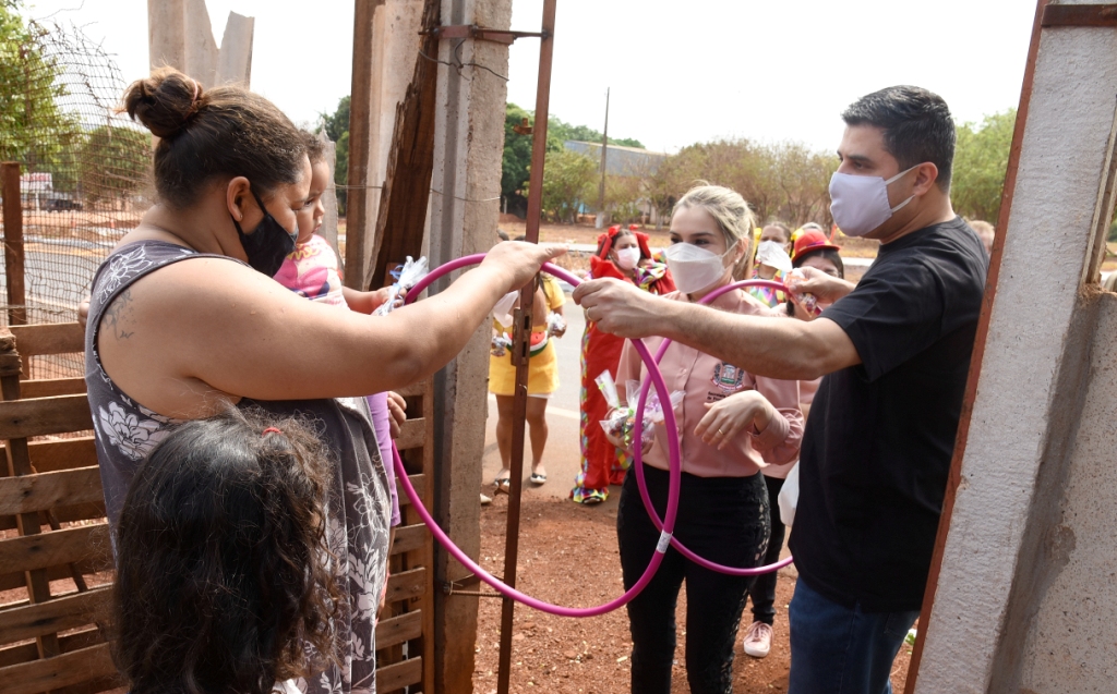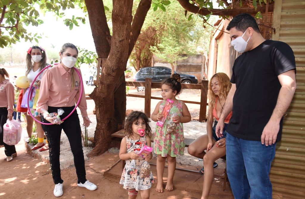 Foi feita a distribuição de bolas, bonecas, pipoca, balas, pirulitos, bambolês, instrumentos musicais, com muita música, alegria, diversão e até personagens caracterizados.