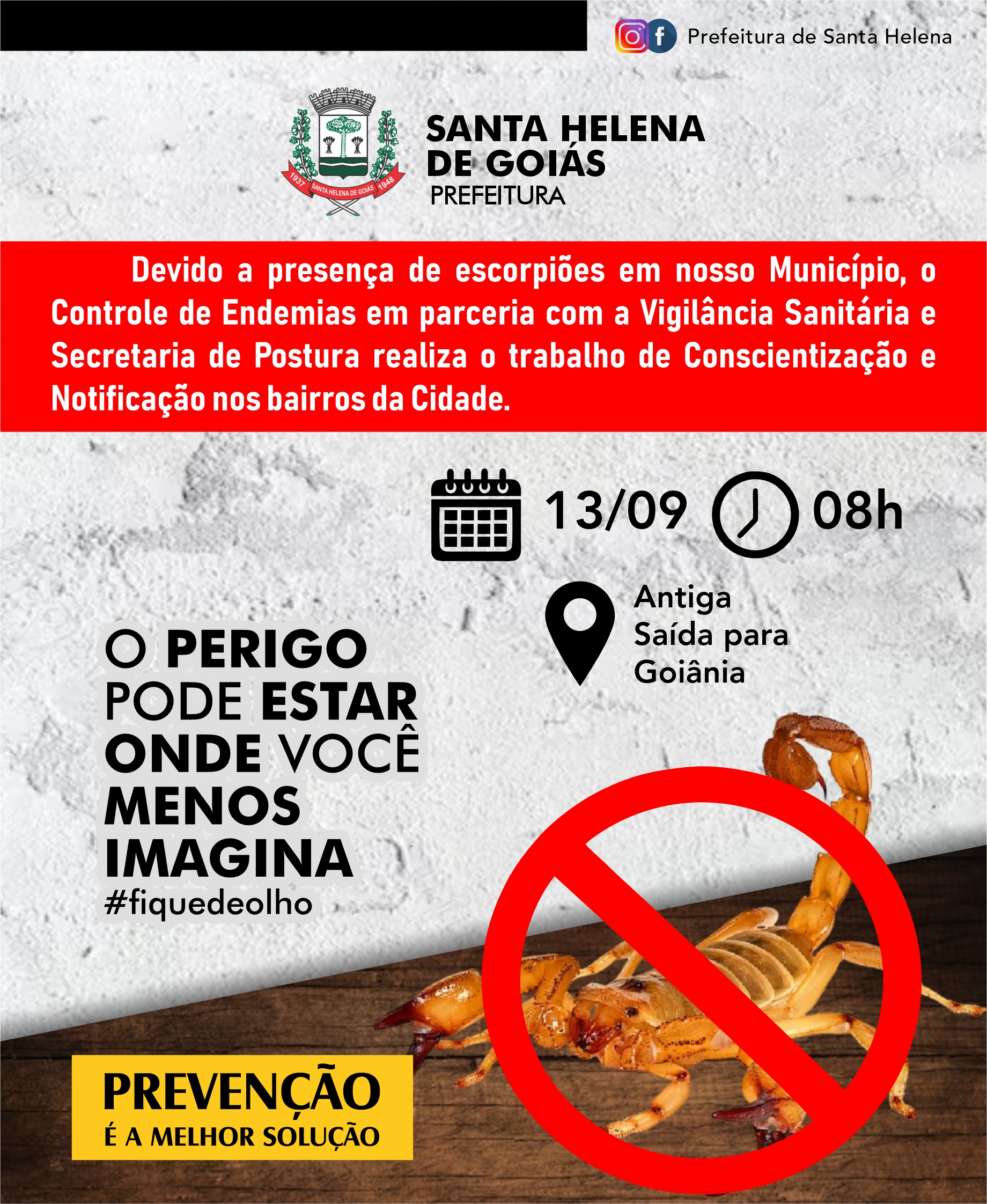 Combater o escorpião é missão de todos nós! Em parceria com a Vigilância Sanitária e Secretaria de Postura, o Controle de Endemias de Santa Helena está em ação, e no dia 13 de setembro (quarta-feira) convida todos os moradores para colaborarem nessa ação de conscientização de combate ao escorpião.