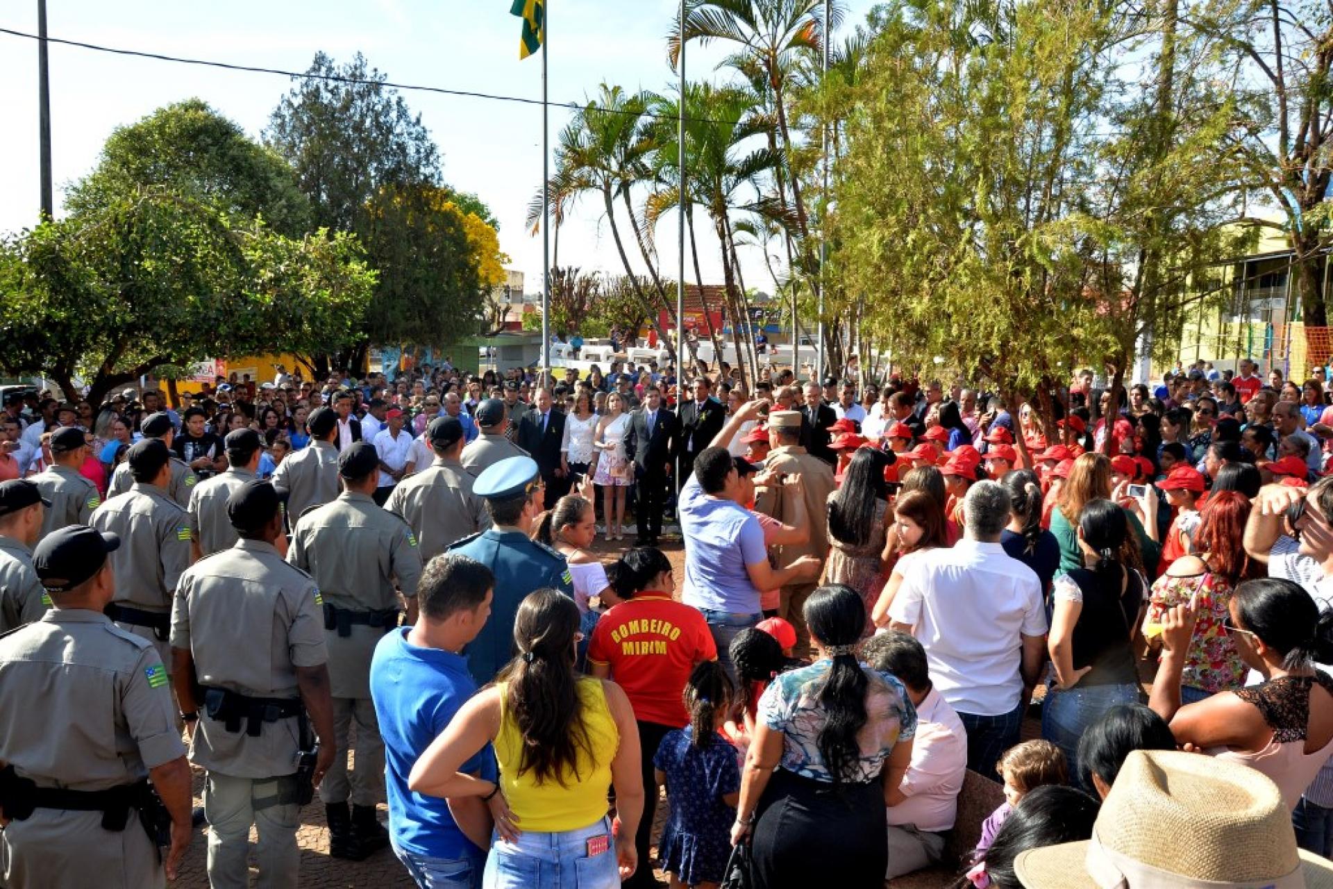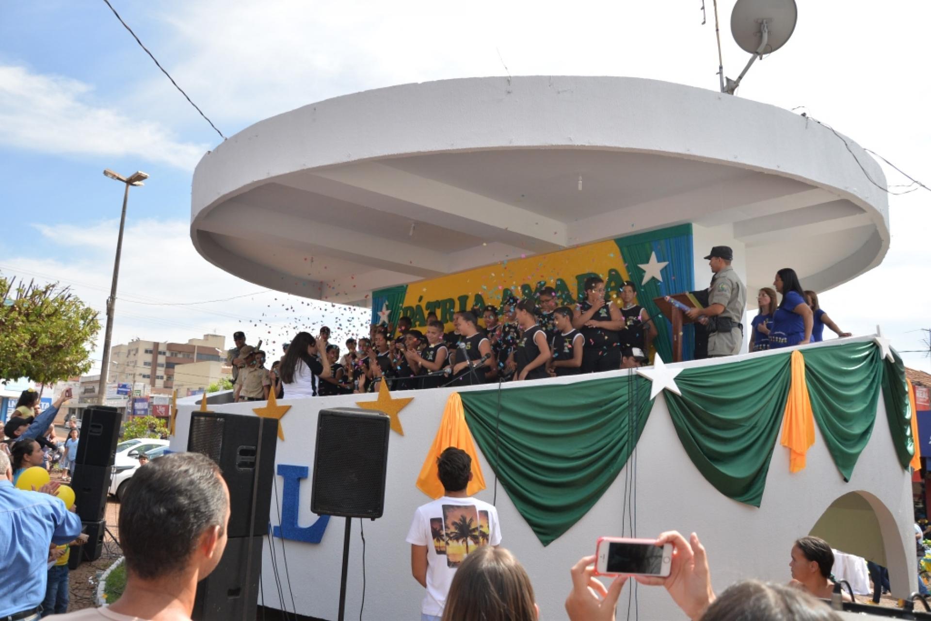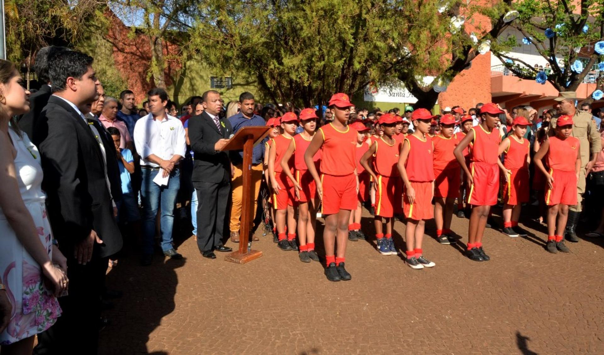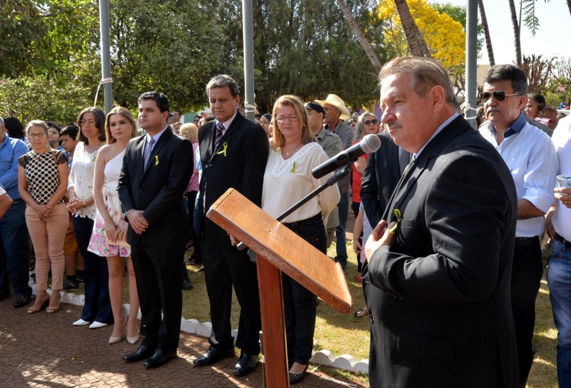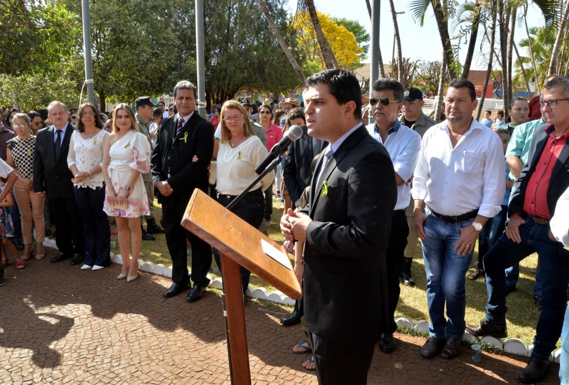 Já Dr. João Alberto, iniciou seu discurso parabenizando a PM pela segurança prestada ao município e aos Bombeiros pelo excelente trabalho prestado, principalmente, ao combate às queimadas que assolam nossa região nesta época. Incluindo também em suas palavras “Bom dia a todos. Cumprimento em especial, estas crianças que nos despertam o espírito cívico e por encher este local e também trazer os representantes de todas as classes. Muito me enche de orgulho, por me lembrar de que também já estive aqui no lugar de vocês. É isso que se espera de uma coletividade, de uma cidade. É assim que se implanta a pátria que representamos e que queremos. Minhas congratulações e agradecimentos vão também a todos os professores que desempenham o papel fundamental do ensino e hoje estamos num bom patamar e apresentando resultados de referência. Também a todos os funcionários e colaboradores, vejo que foram muito bem escolhidos e trabalham com compromisso para com a população, demonstrando que servimos o município e o Brasil. É fundamental que edificamos com consciência a nossa função de cidadãos, é isto que representa este evento e tantos outros que virão. Apresento também mais dois novos veículos que comporão a frota do município e nova iluminação noturna com lâmpadas de led. Mais uma vez, meu muito obrigado a todos e que prossigamos com as bênçãos divina”, declarou o Prefeito.