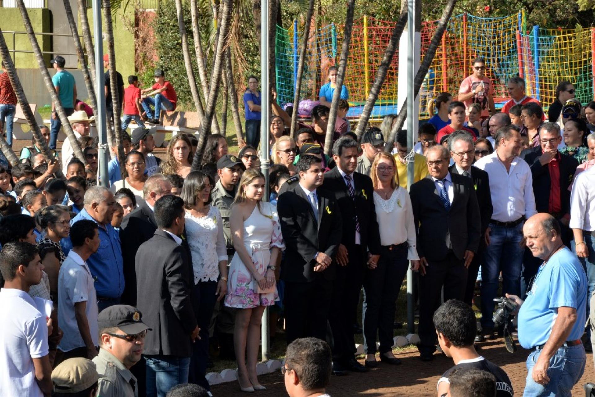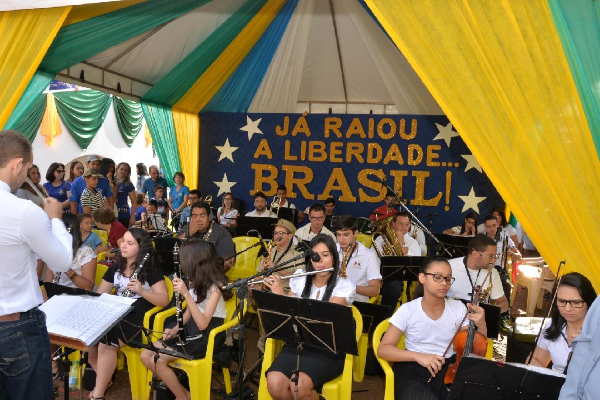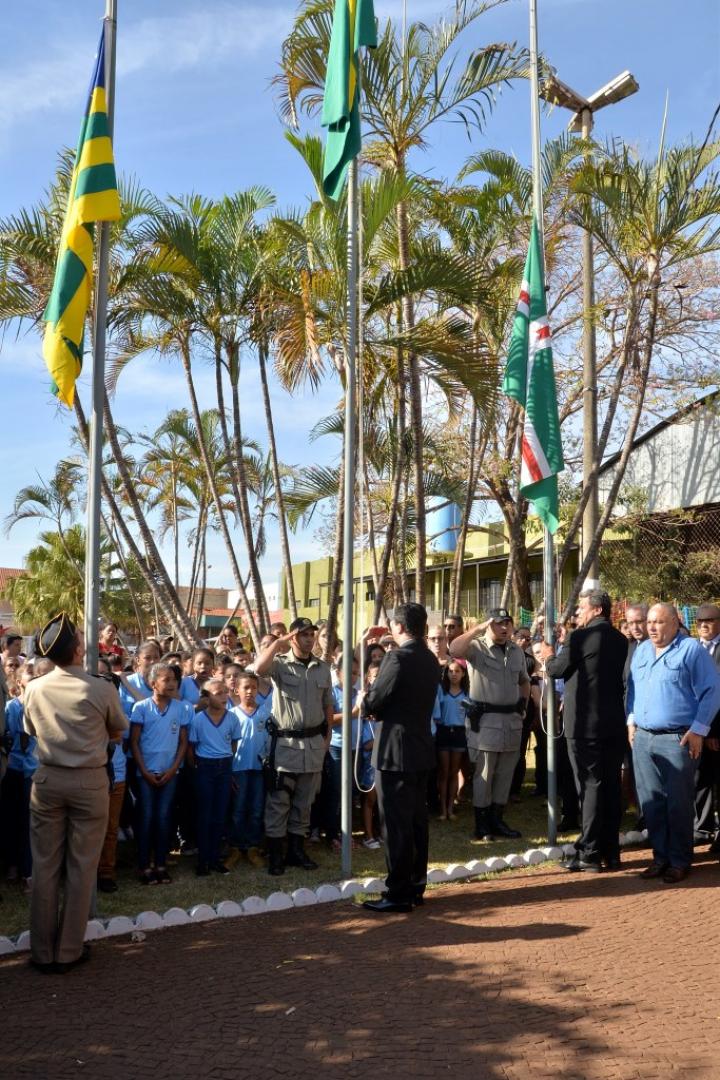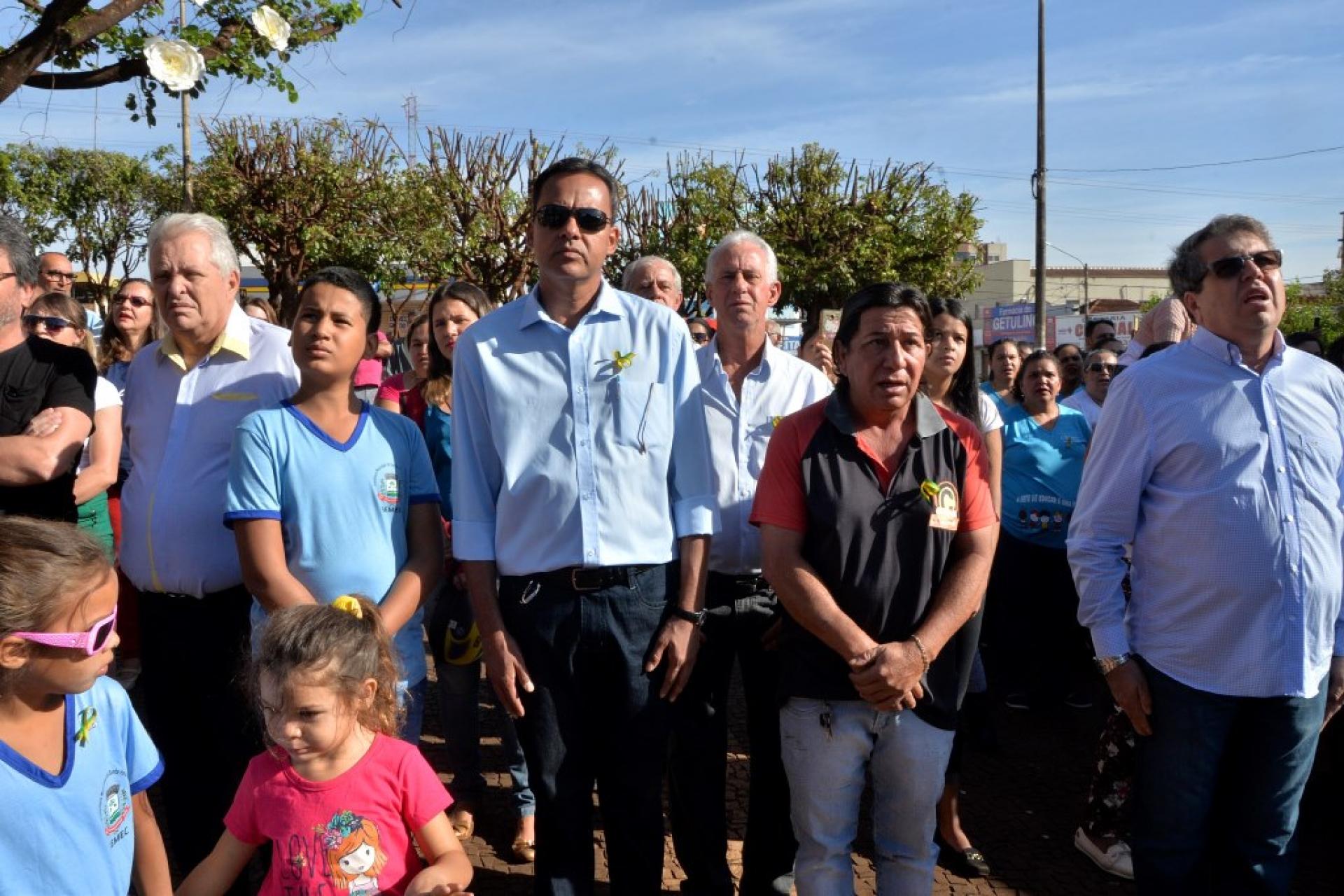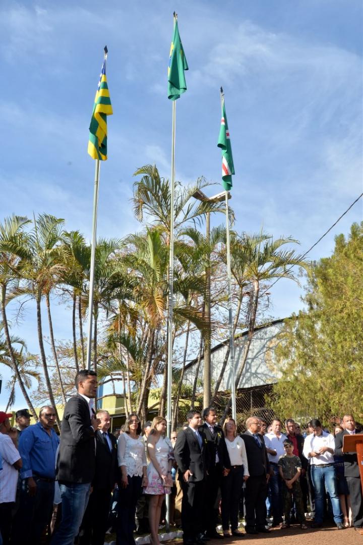 Primeiramente, houve o hasteamento das bandeiras (Brasil – Prefeito Dr. João Alberto, Estado – Major Jeovaldo e Município – Pres. da Câmara Gilmar) acompanhado pelo Hino Nacional acompanhado pela orquestra Lira Real da Igreja Evangélica Assembleia de Deus, seguidos pelos hinos de Goiás e da Independência.