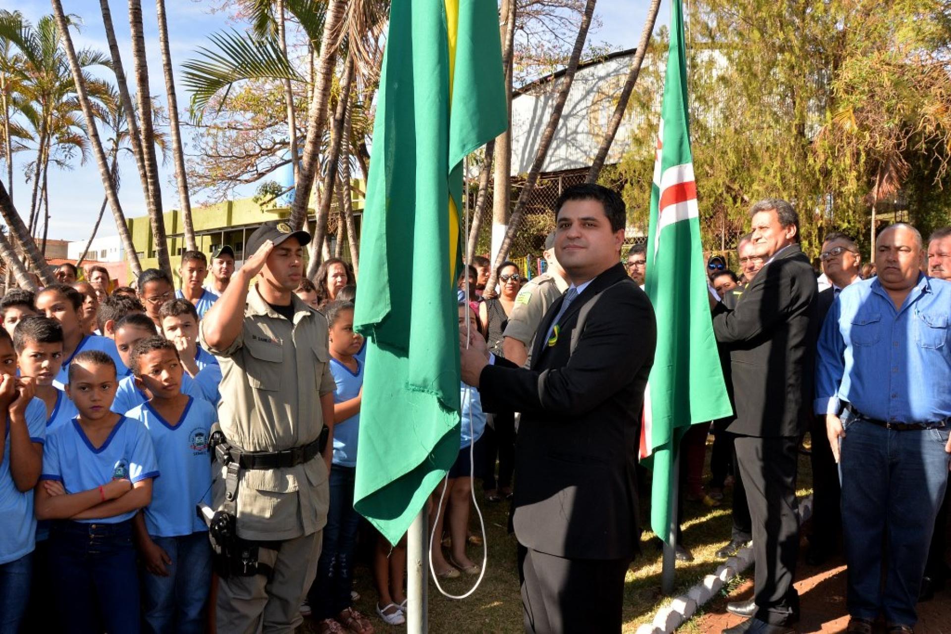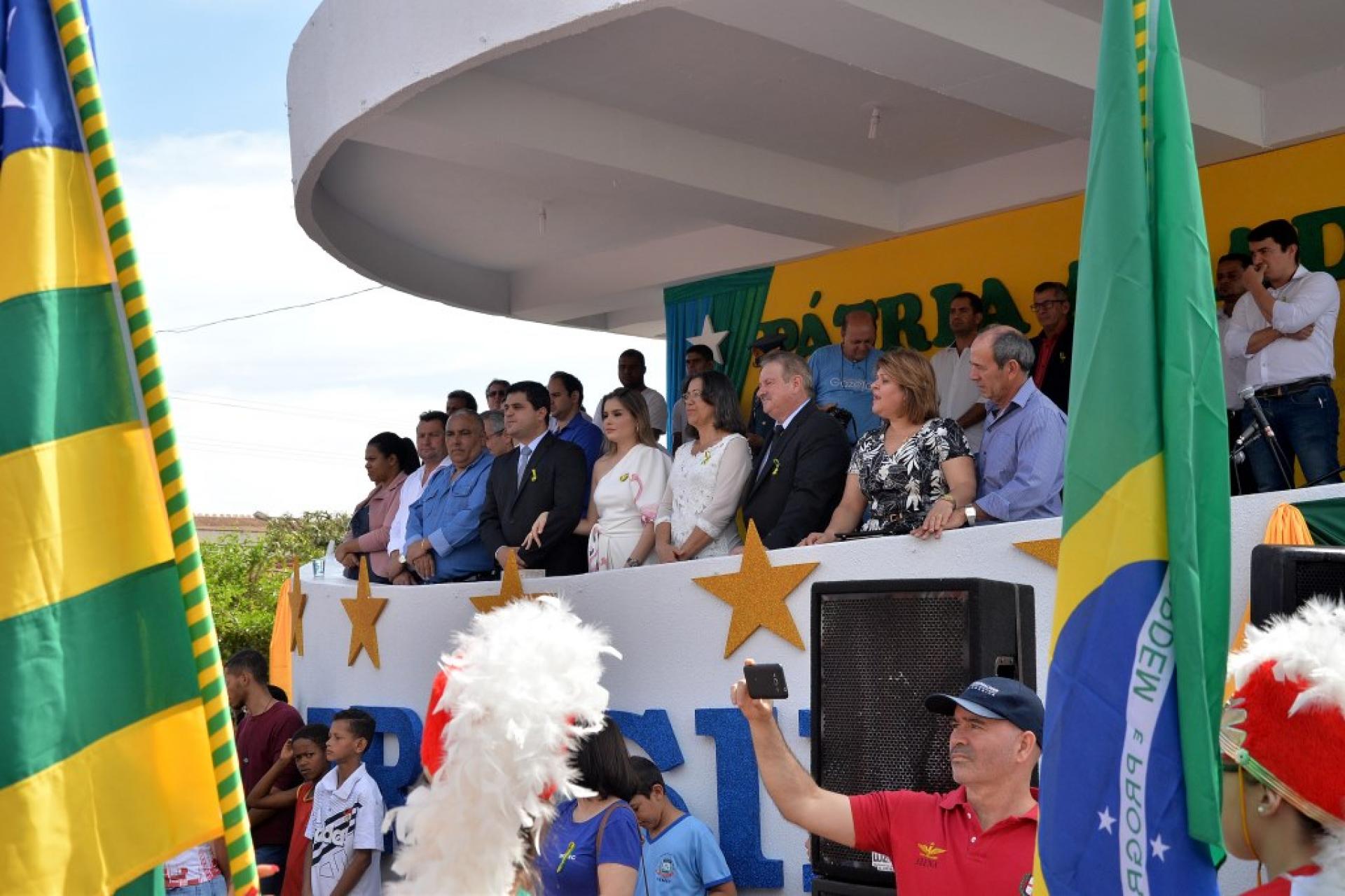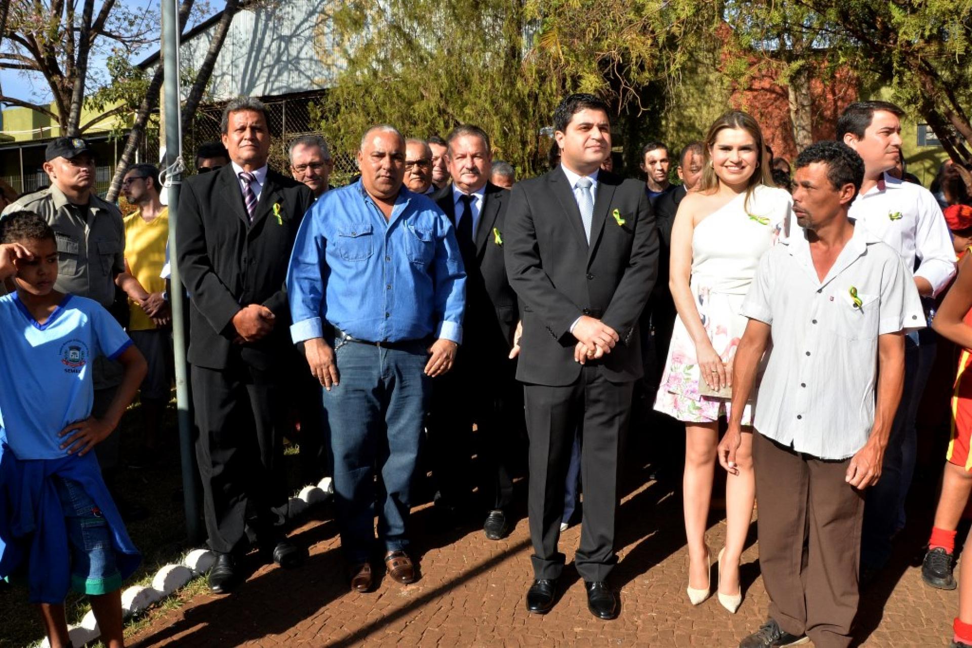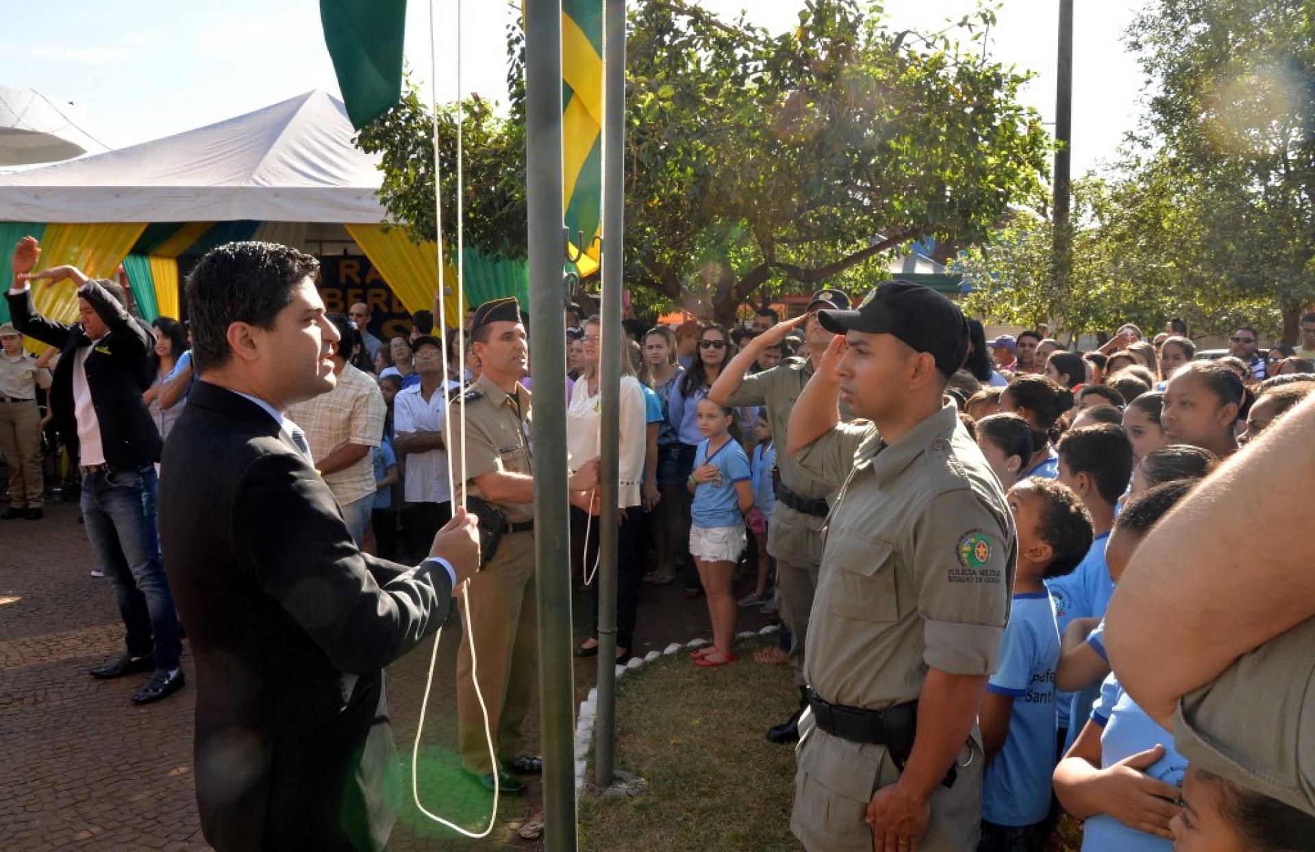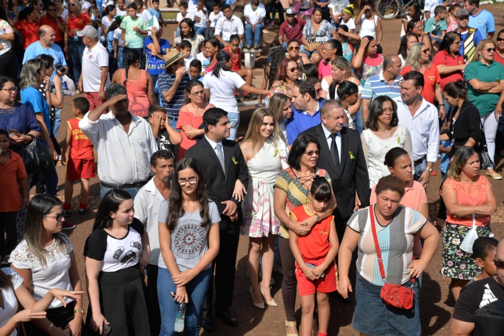 Primeiramente, houve o hasteamento das bandeiras (Brasil – Prefeito Dr. João Alberto, Estado – Major Jeovaldo e Município – Pres. da Câmara Gilmar) acompanhado pelo Hino Nacional acompanhado pela orquestra Lira Real da Igreja Evangélica Assembleia de Deus, seguidos pelos hinos de Goiás e da Independência.