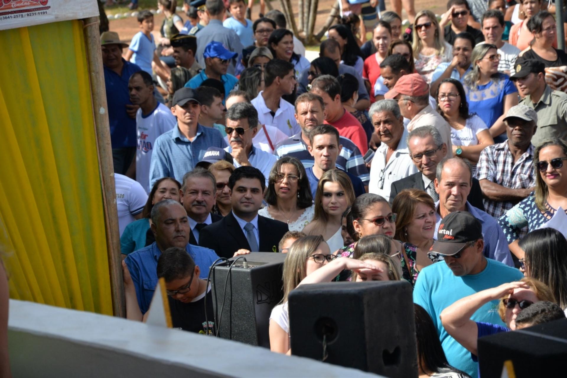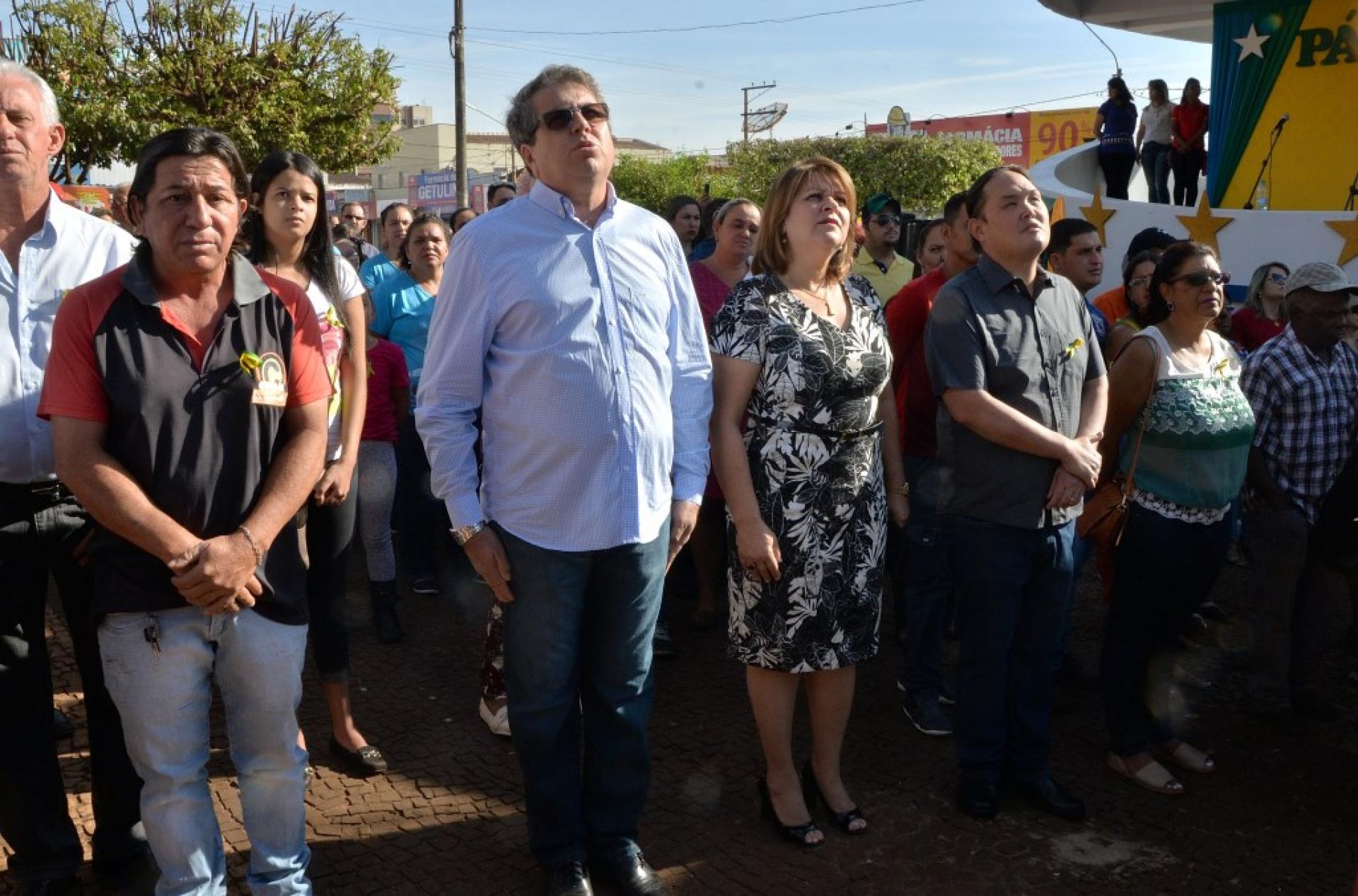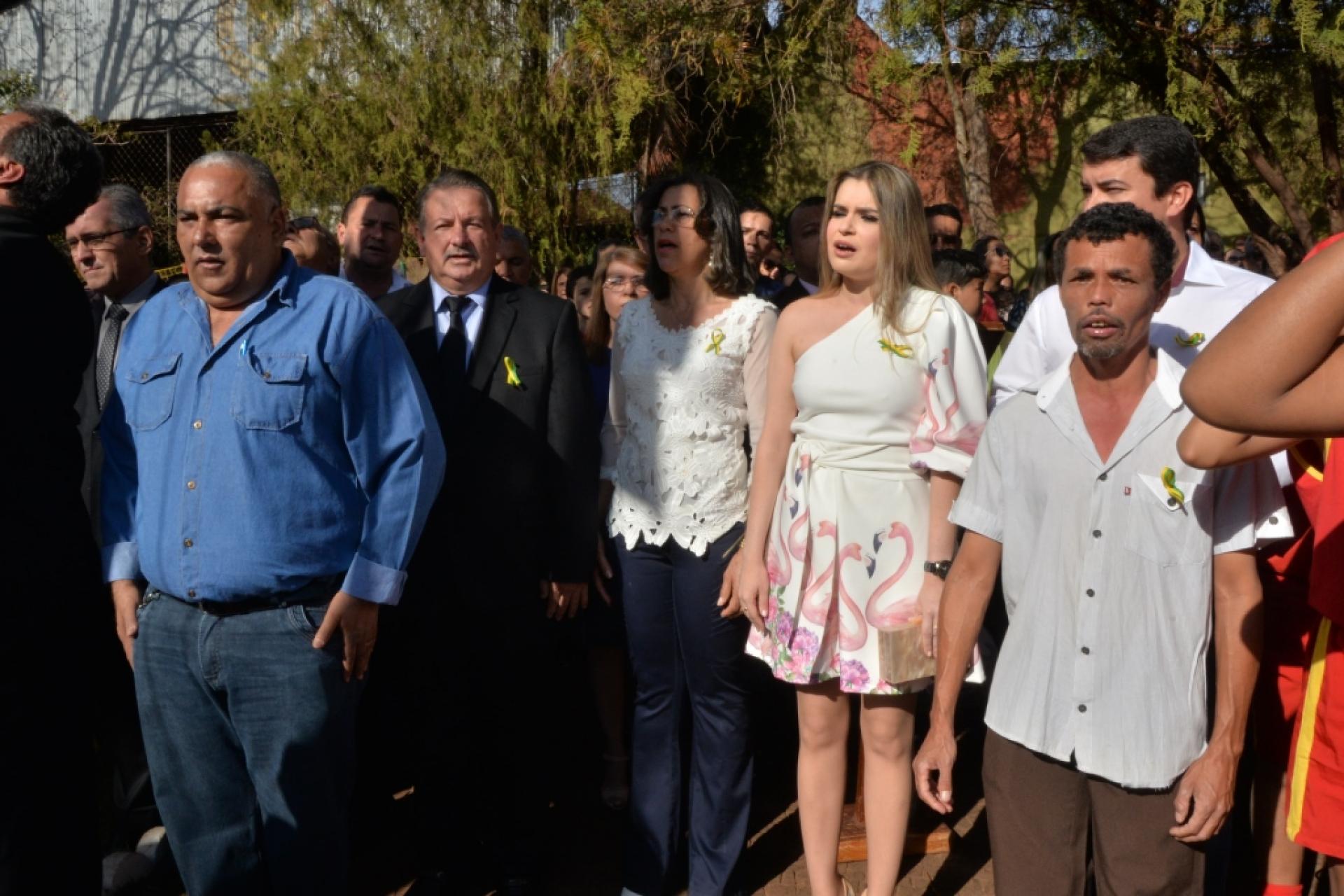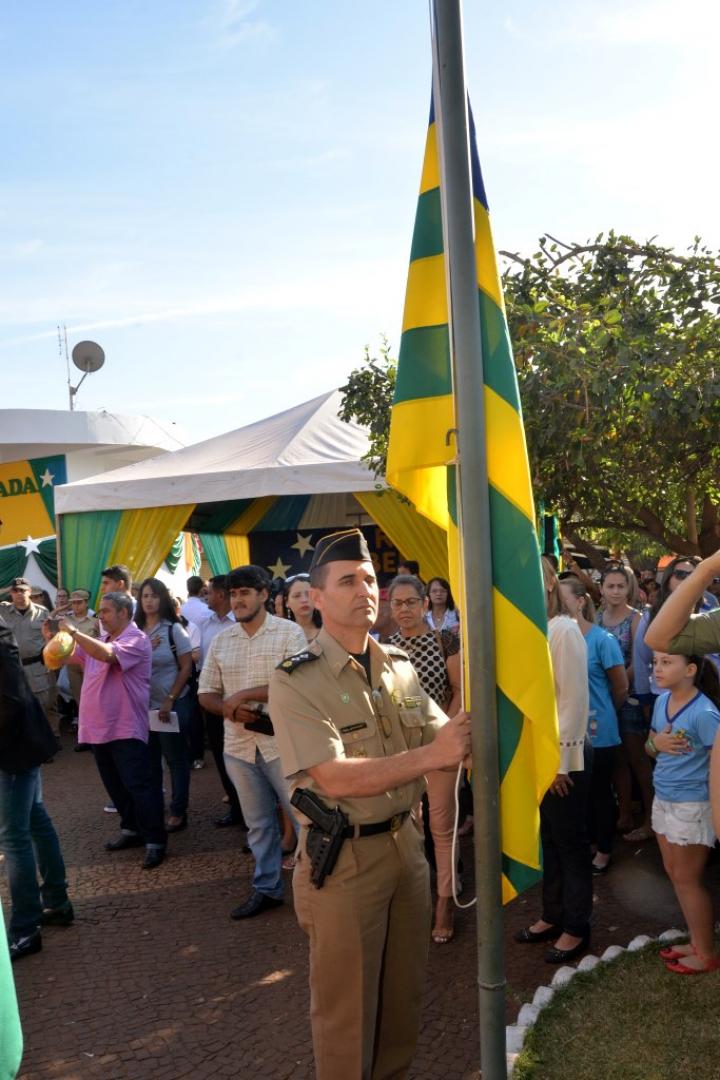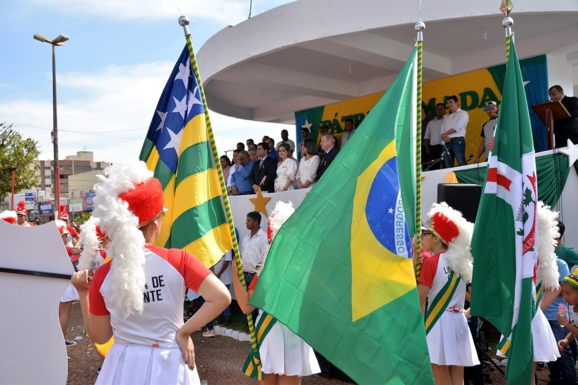 Primeiramente, houve o hasteamento das bandeiras (Brasil – Prefeito Dr. João Alberto, Estado – Major Jeovaldo e Município – Pres. da Câmara Gilmar) acompanhado pelo Hino Nacional acompanhado pela orquestra Lira Real da Igreja Evangélica Assembleia de Deus, seguidos pelos hinos de Goiás e da Independência.