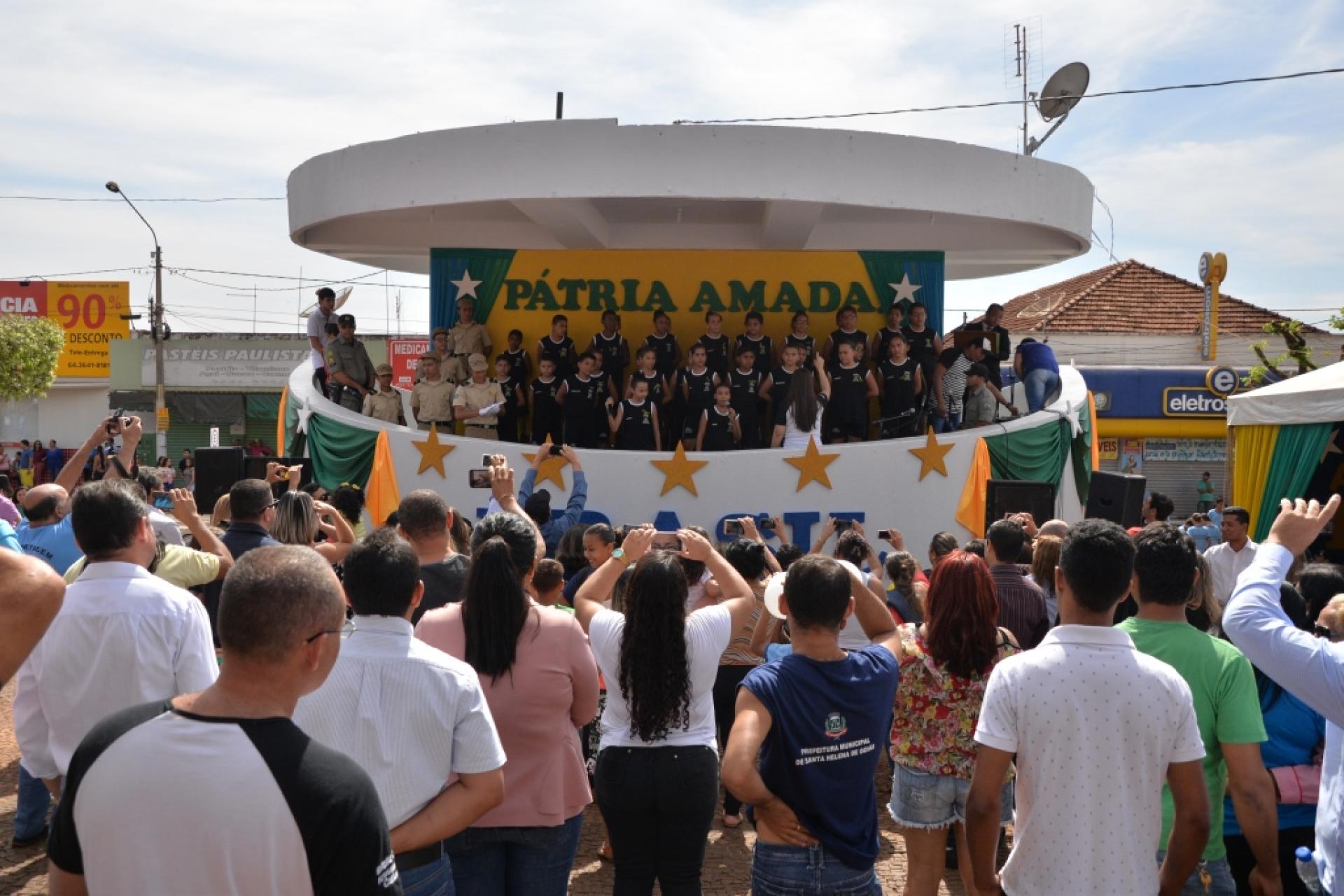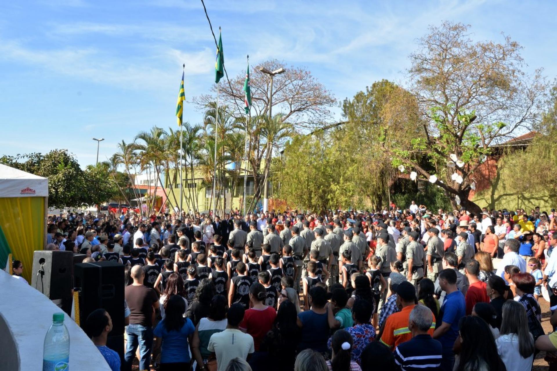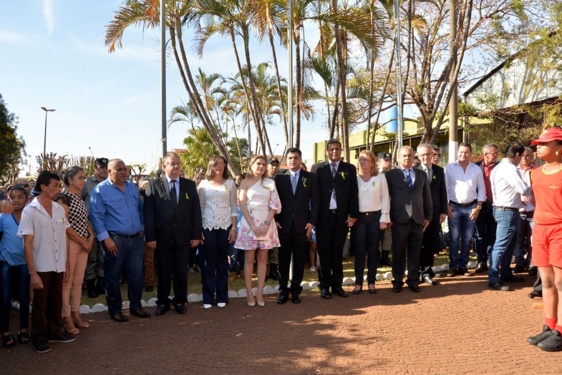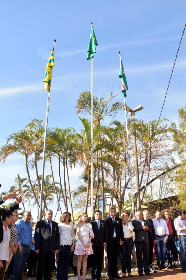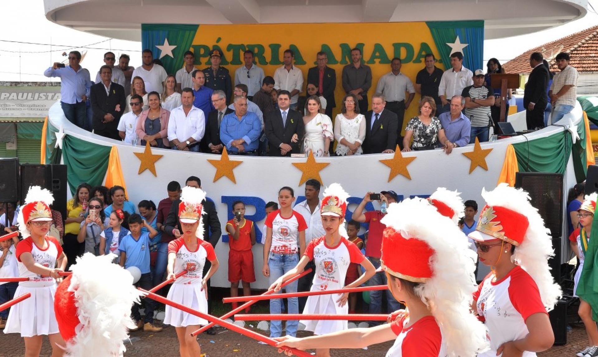 Primeiramente, houve o hasteamento das bandeiras (Brasil – Prefeito Dr. João Alberto, Estado – Major Jeovaldo e Município – Pres. da Câmara Gilmar) acompanhado pelo Hino Nacional acompanhado pela orquestra Lira Real da Igreja Evangélica Assembleia de Deus, seguidos pelos hinos de Goiás e da Independência.