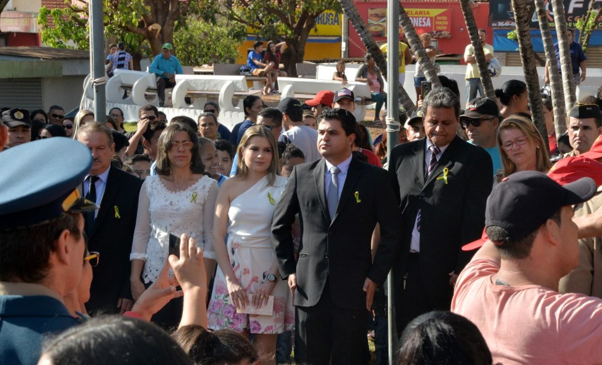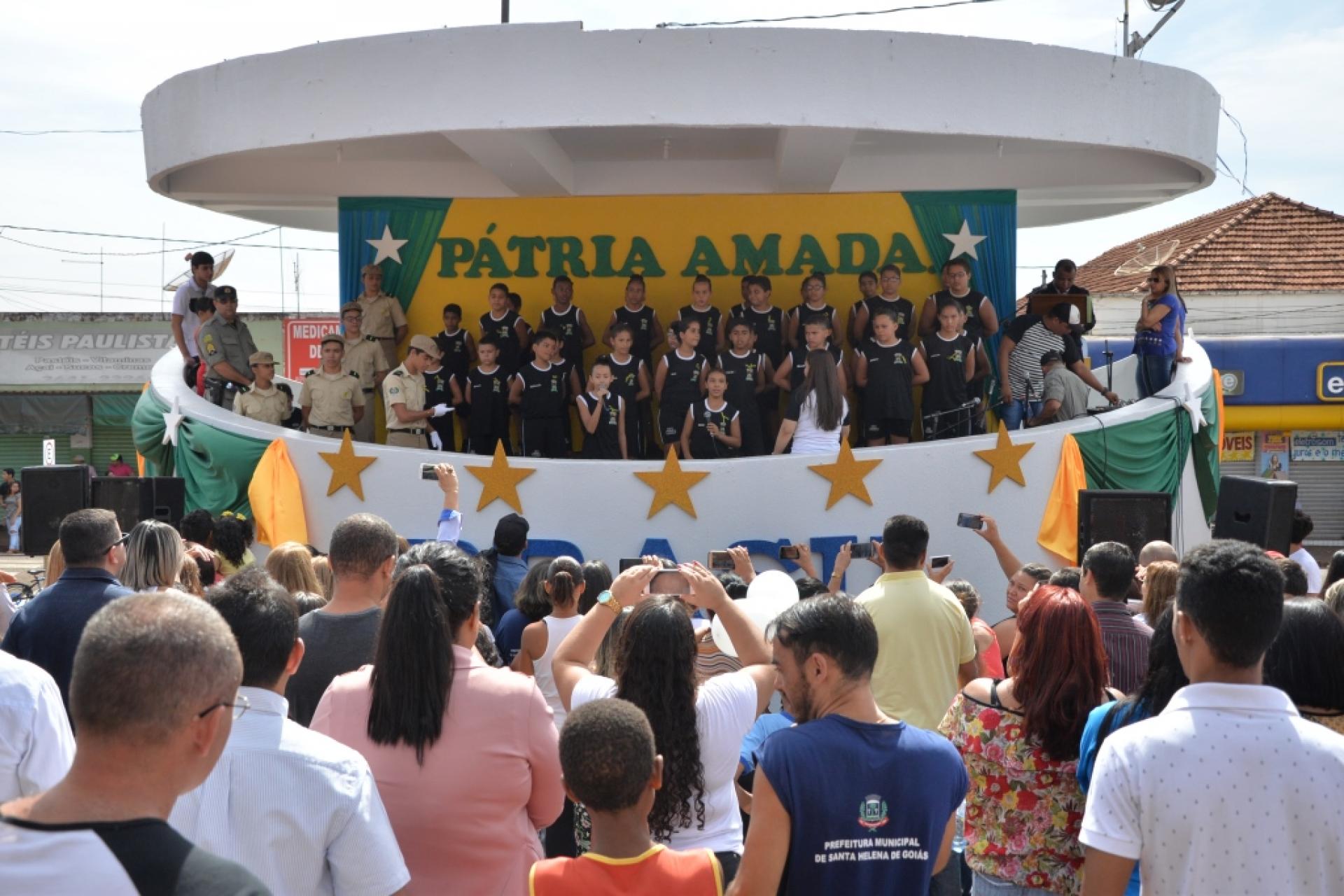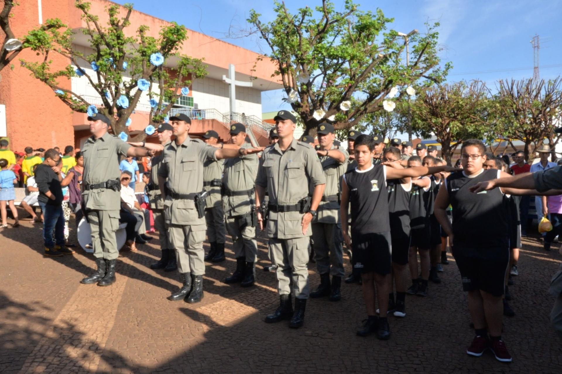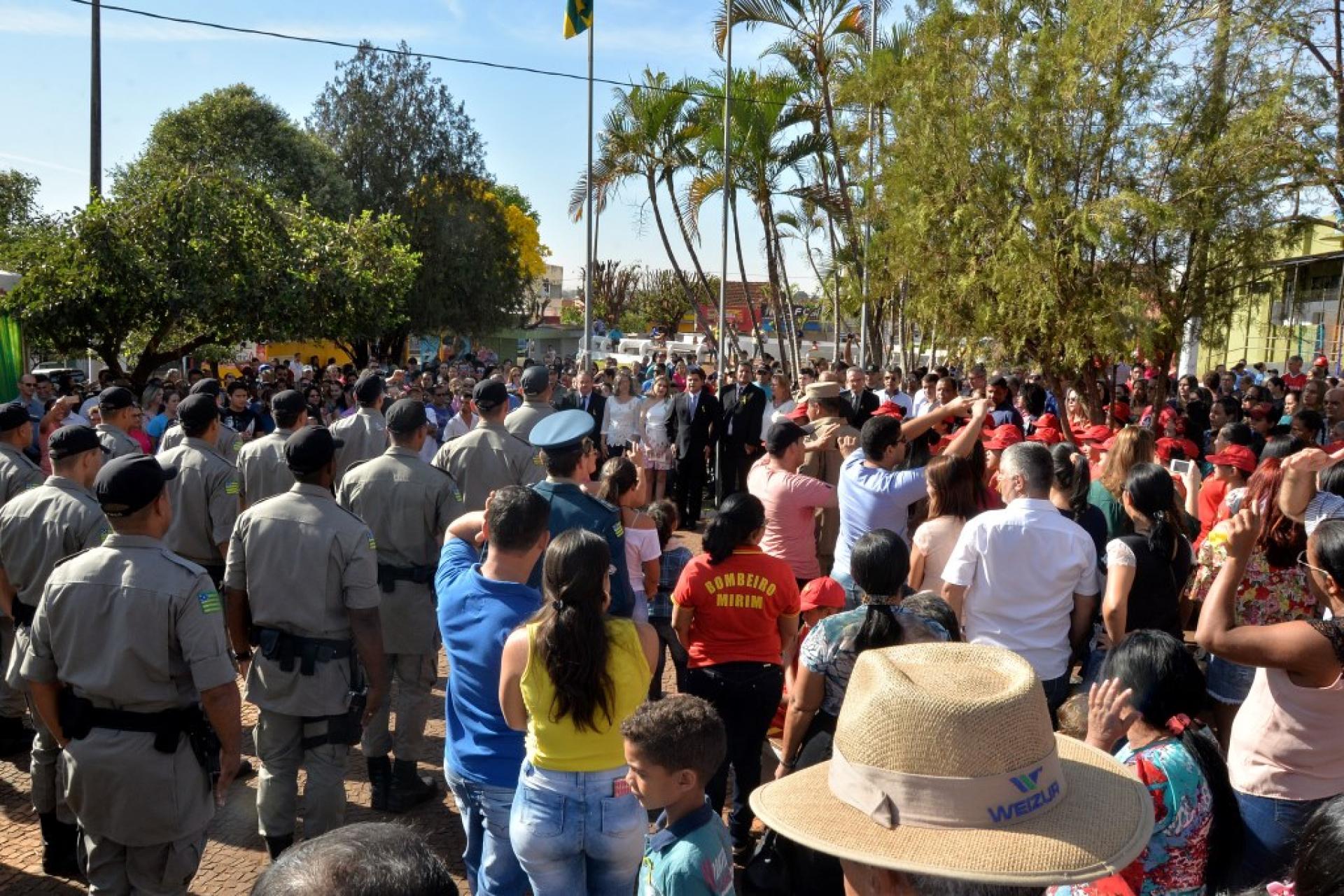 Primeiramente, houve o hasteamento das bandeiras (Brasil – Prefeito Dr. João Alberto, Estado – Major Jeovaldo e Município – Pres. da Câmara Gilmar) acompanhado pelo Hino Nacional acompanhado pela orquestra Lira Real da Igreja Evangélica Assembleia de Deus, seguidos pelos hinos de Goiás e da Independência.
