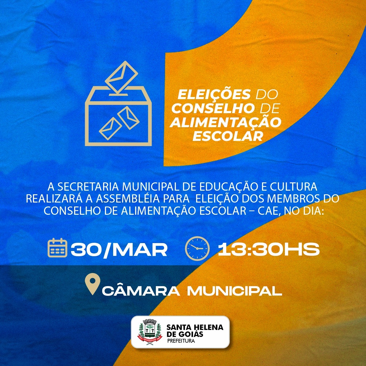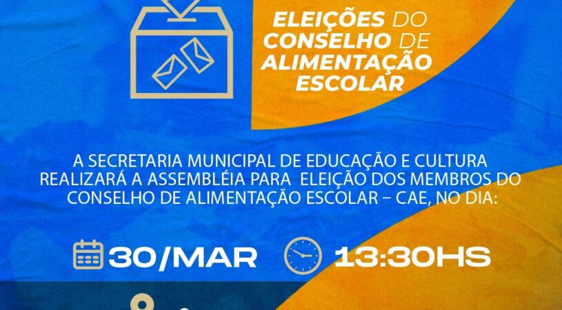A Secretaria Municipal de Educação e Cultura realizará, no próximo dia 30 de março às 13:30 horas, na Câmara Municipal, a assembleia para eleição dos membros do Conselho de Alimentação Escolar – CAE.