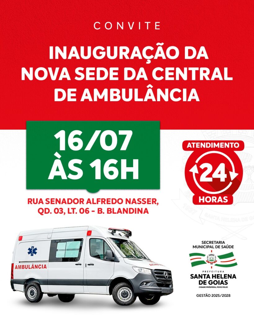 A Prefeitura de Santa Helena de Goiás, por meio da Secretaria Municipal de Saúde, tem a honra de convidar toda a população para a inauguração da nova sede da Central de Ambulâncias do município.