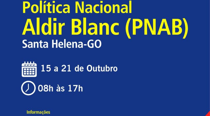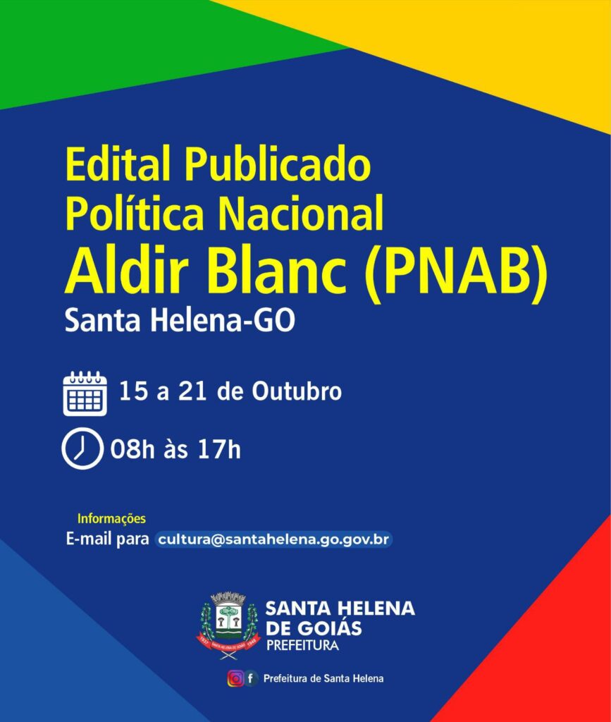 O Edital da Política Nacional Aldir Blanc (PNAB) já está publicado! Esse edital oferece apoio financeiro a projetos culturais, fortalecendo a cultura local e ajudando os trabalhadores do setor em Santa Helena de Goiás. Não perca o prazo para participar: de 15 a 21 de outubro, das 8h às 17h. Para mais informações, entre em contato pelo e-mail: cultura@santahelena.go.gov.br.