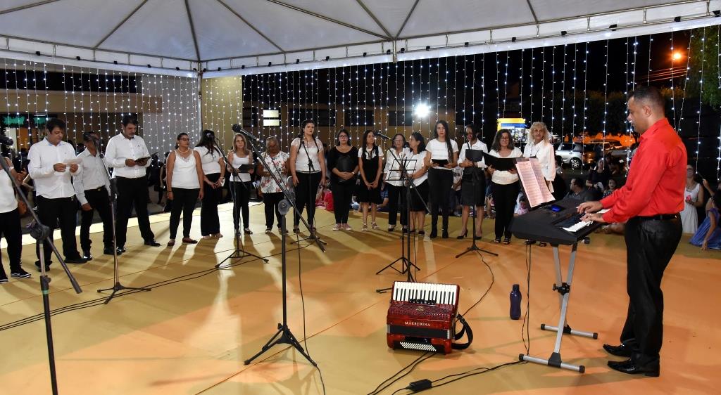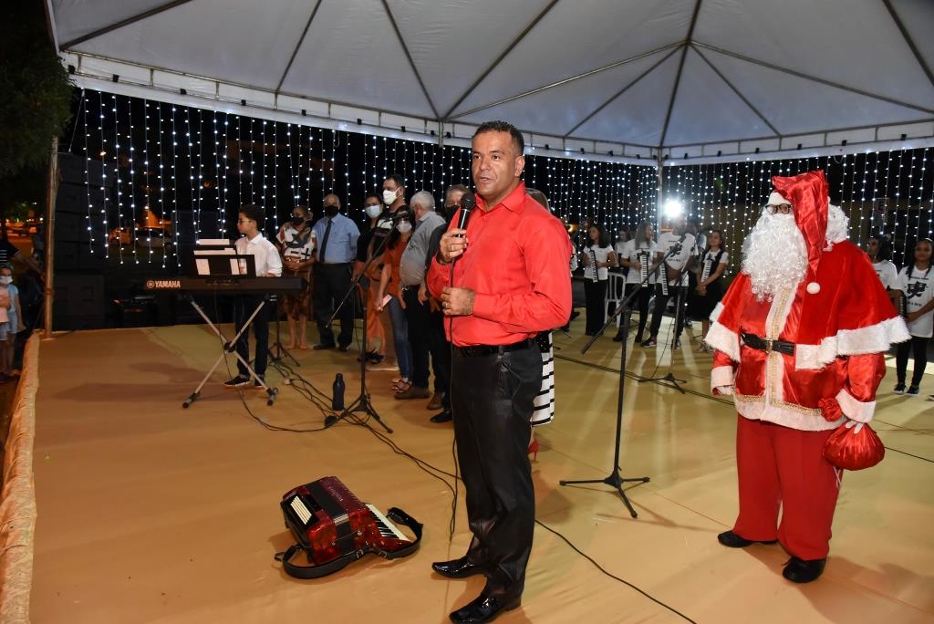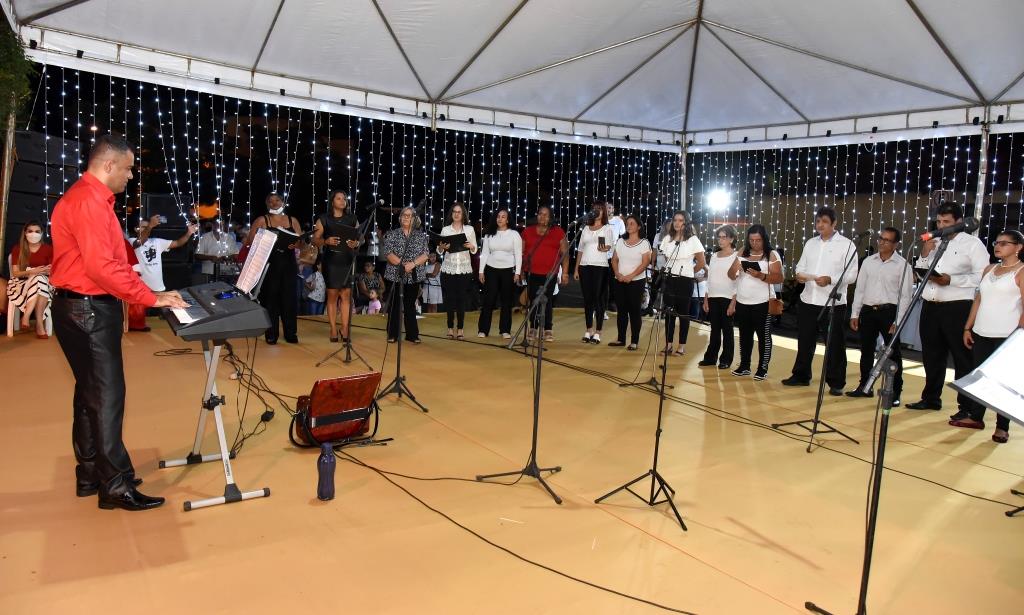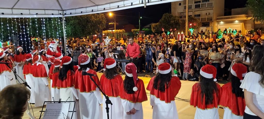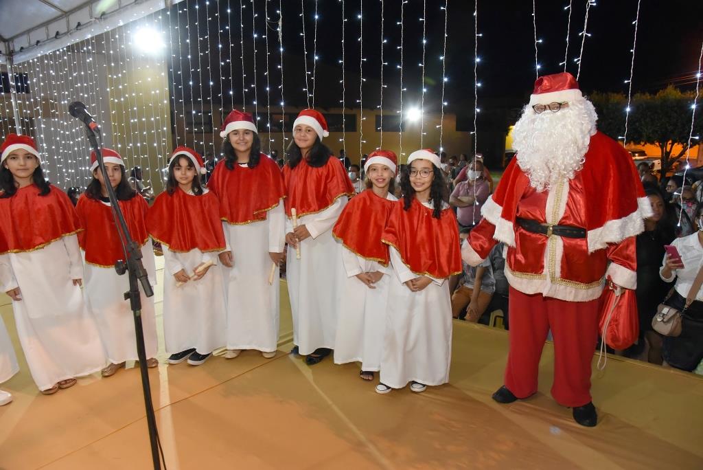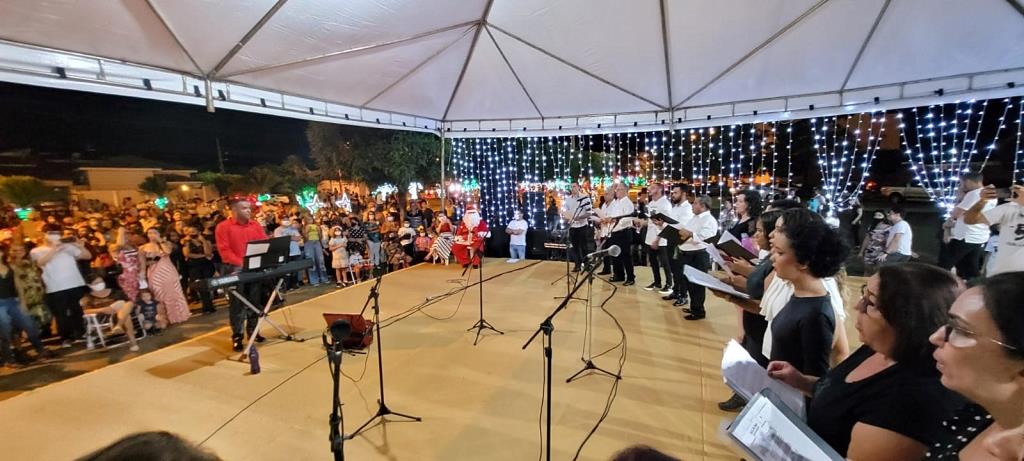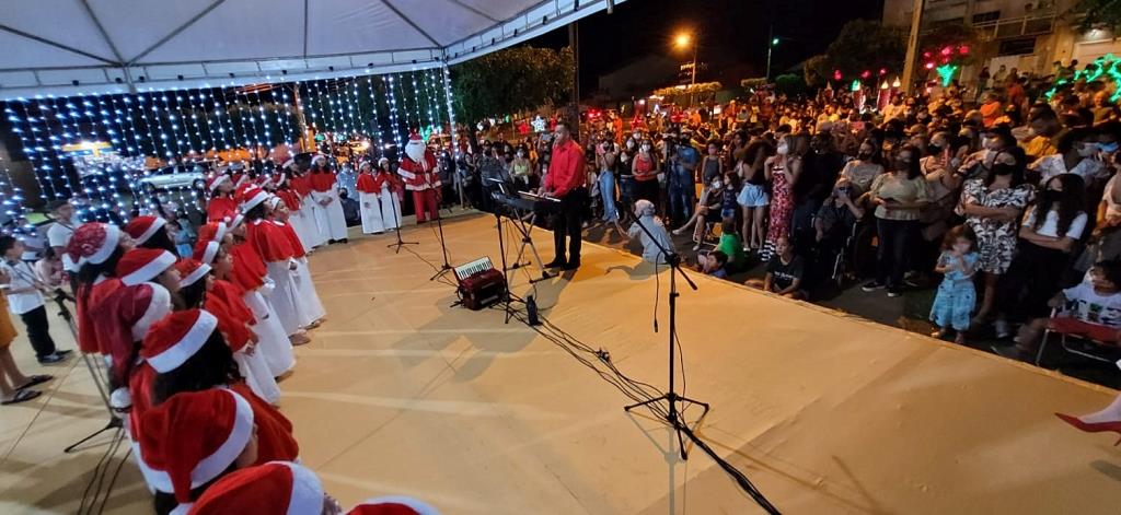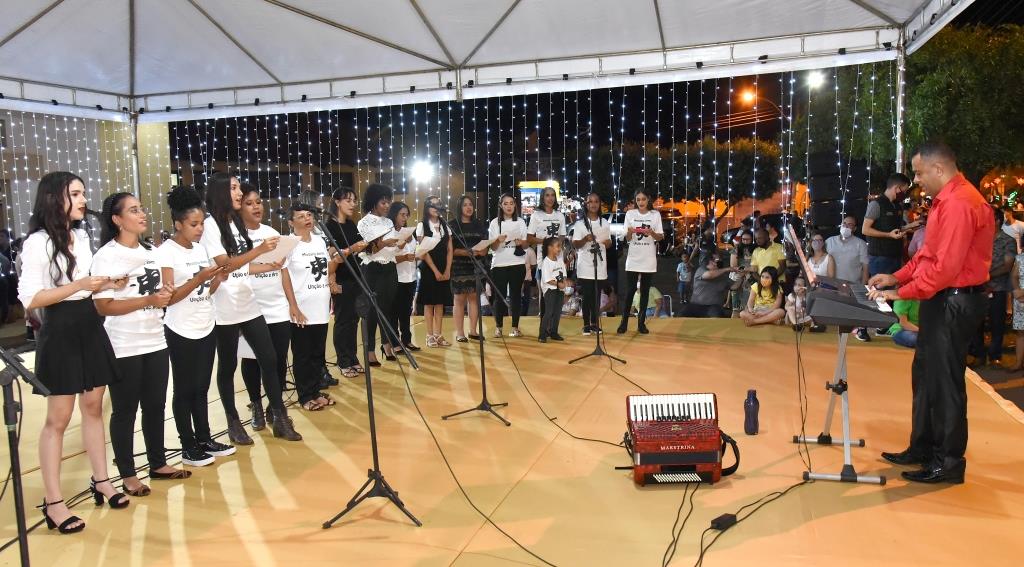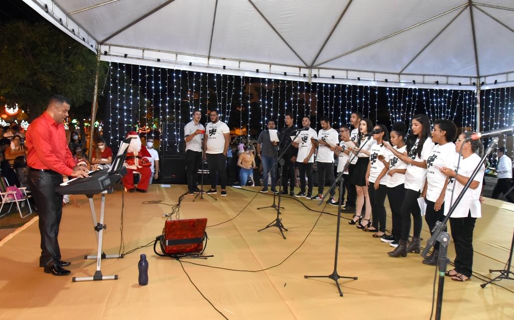 A ambientação de Natal de 2021 foi inaugurada, na Pista de Caminhada, na noite de hoje (03), com apresentações dos corais do Projeto Musical Municipal Harmonizando Vidas, que tem como maestro Divino Allancaster.