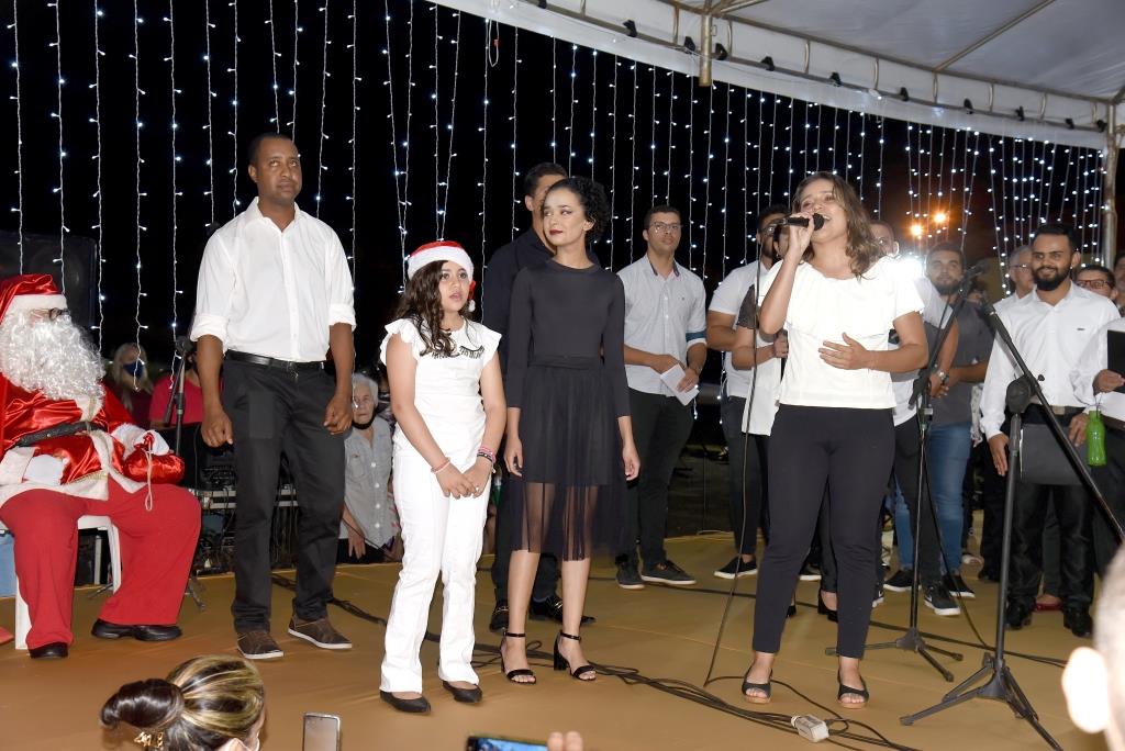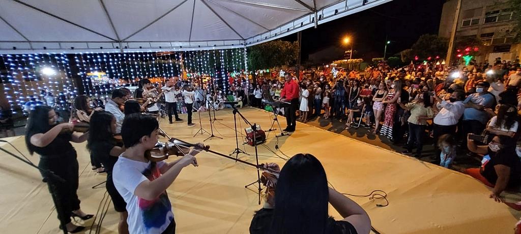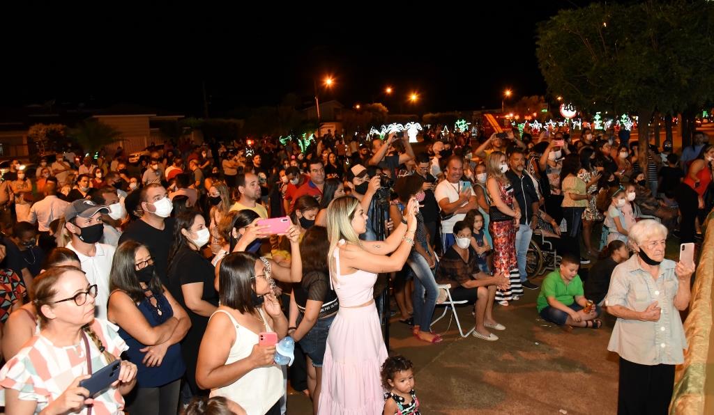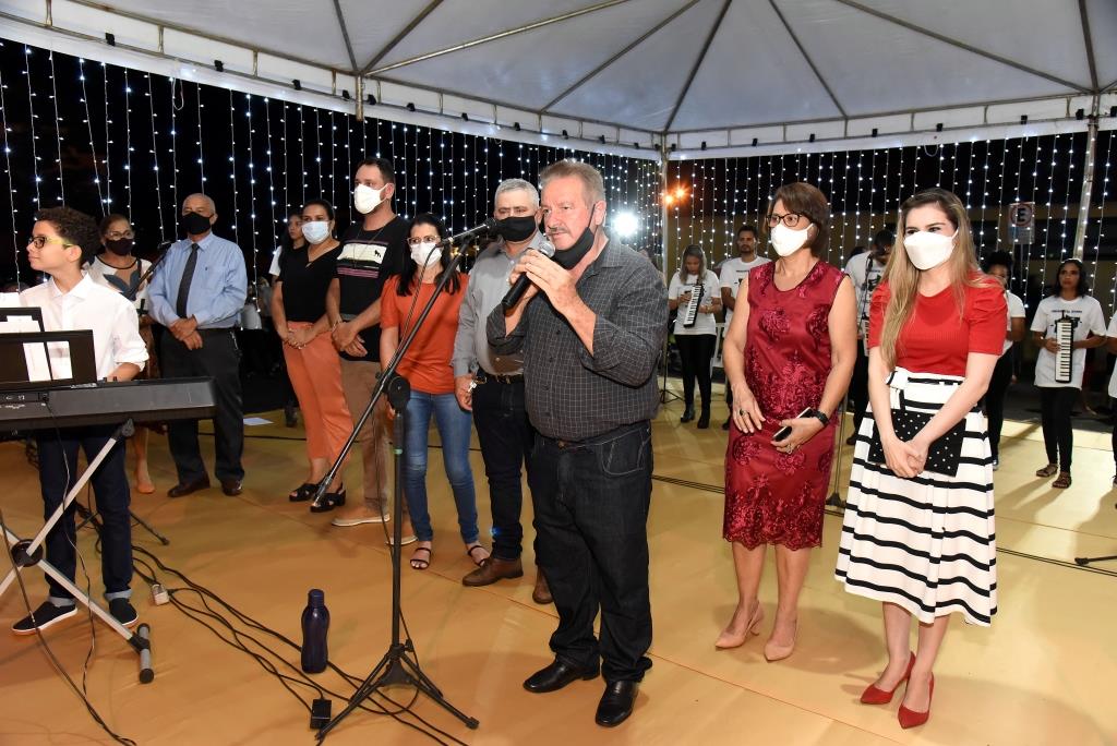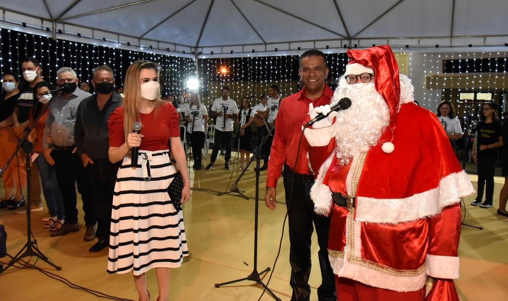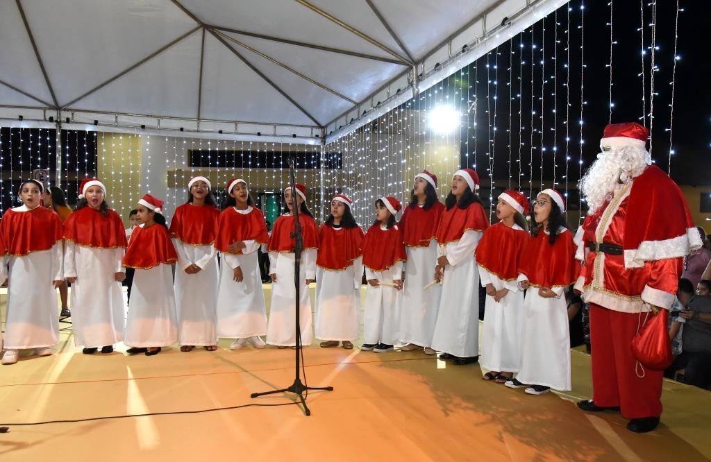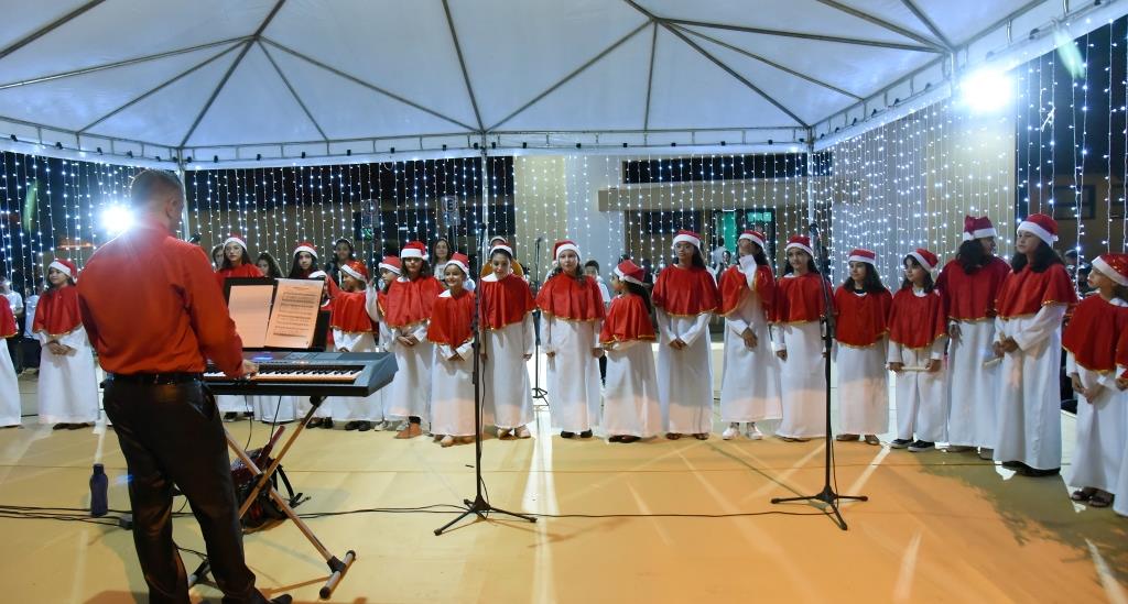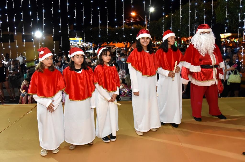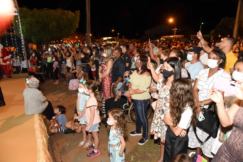 A ambientação de Natal de 2021 foi inaugurada, na Pista de Caminhada, na noite de hoje (03), com apresentações dos corais do Projeto Musical Municipal Harmonizando Vidas, que tem como maestro Divino Allancaster.