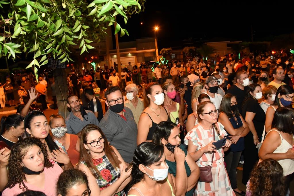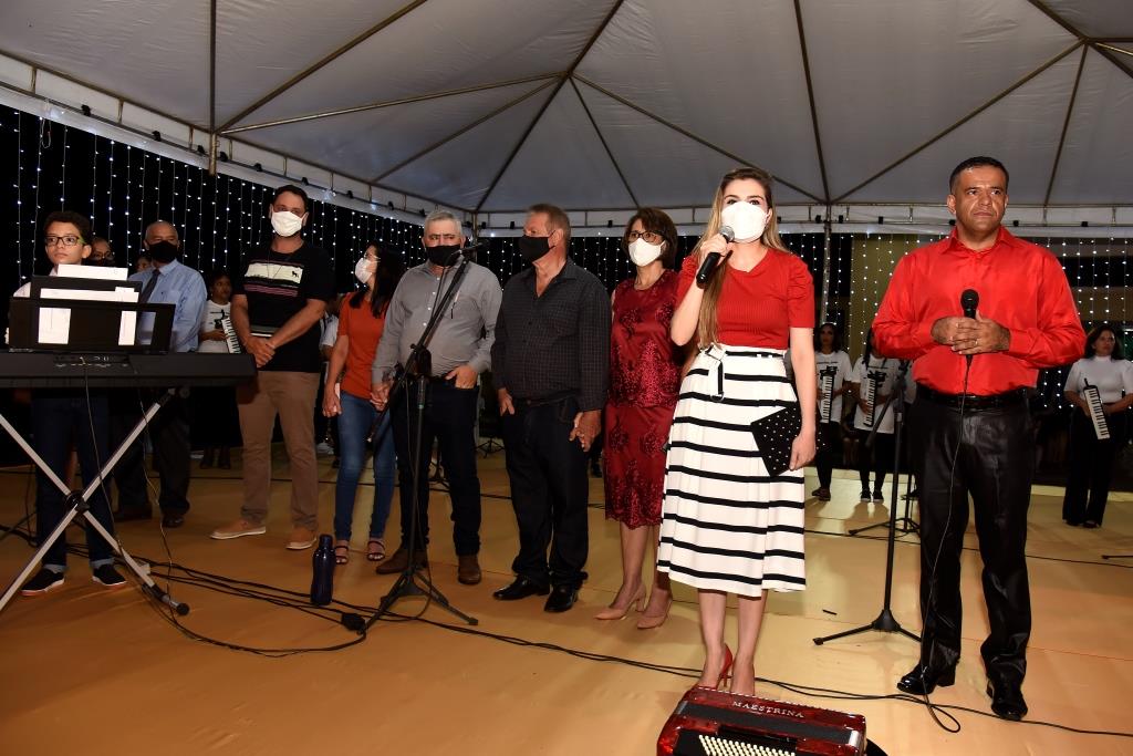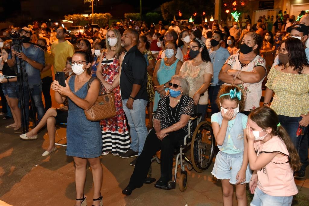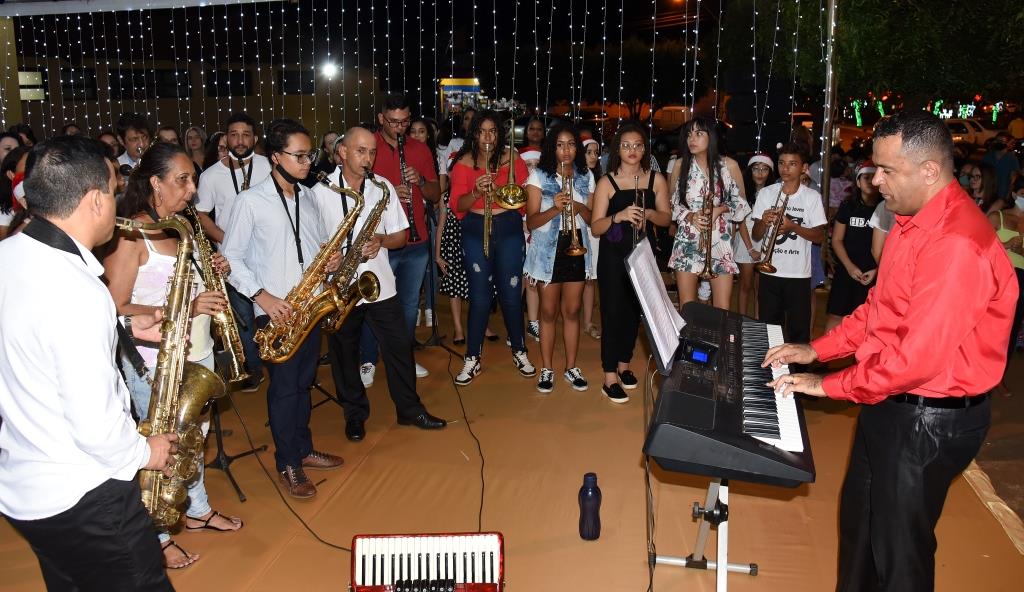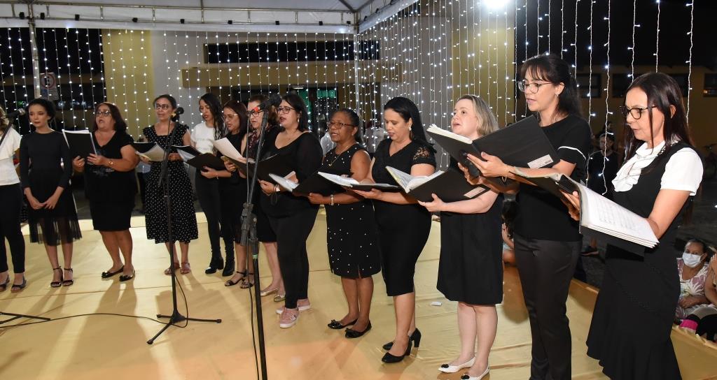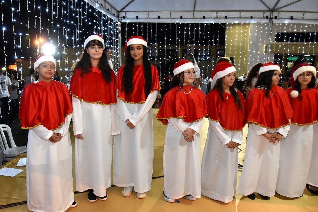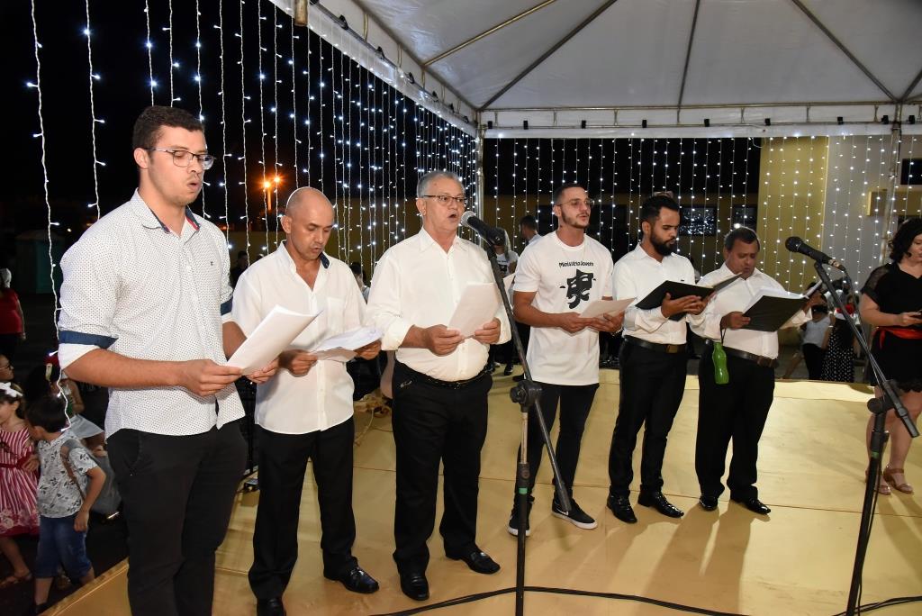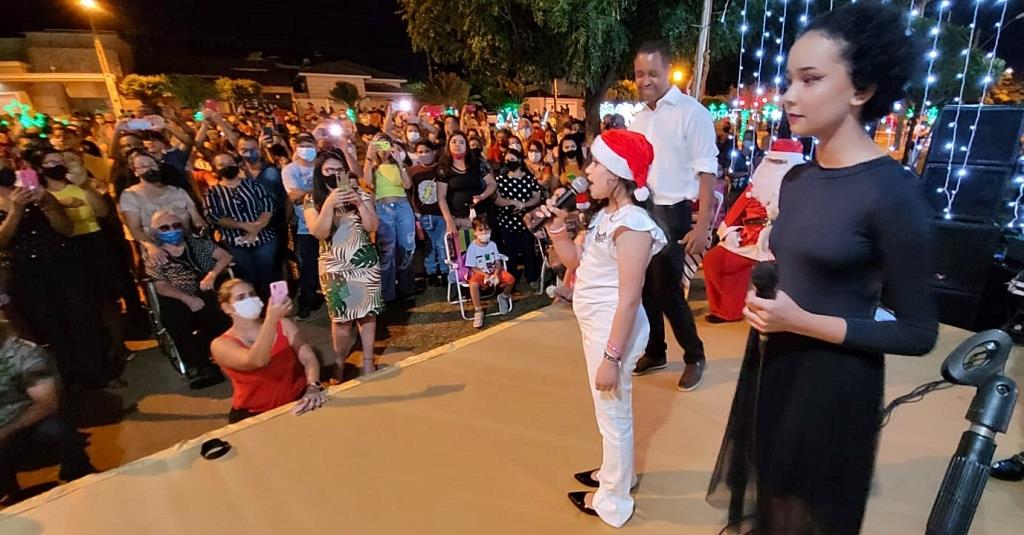 A ambientação de Natal de 2021 foi inaugurada, na Pista de Caminhada, na noite de hoje (03), com apresentações dos corais do Projeto Musical Municipal Harmonizando Vidas, que tem como maestro Divino Allancaster.
