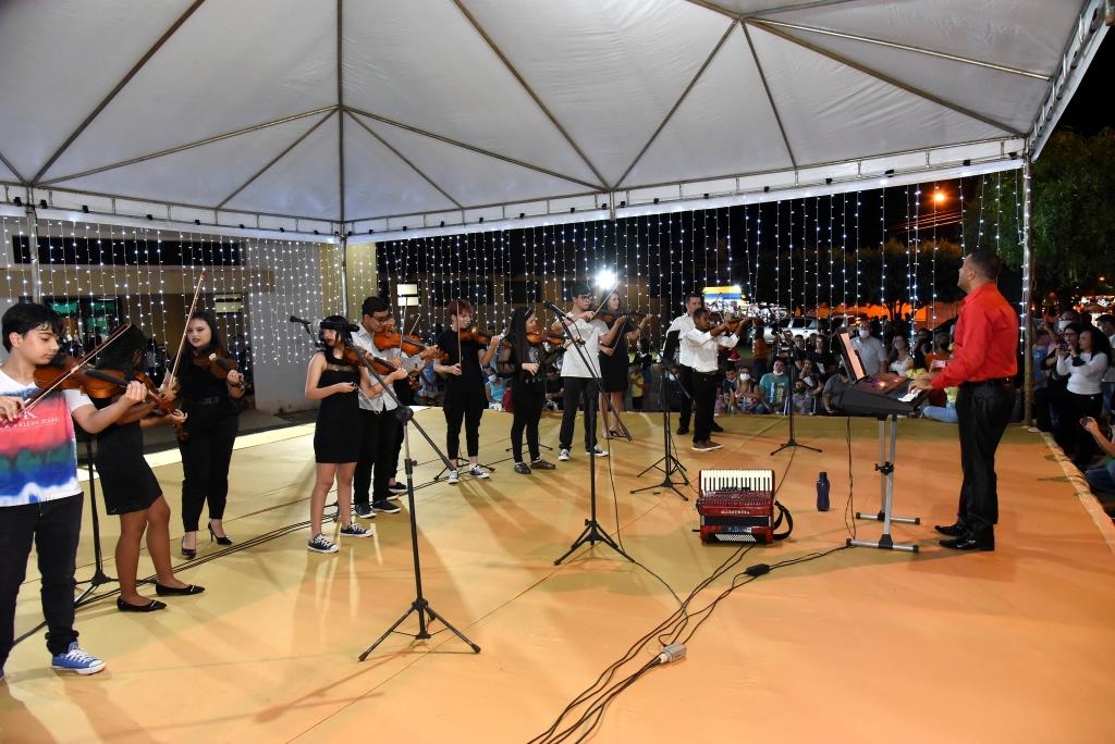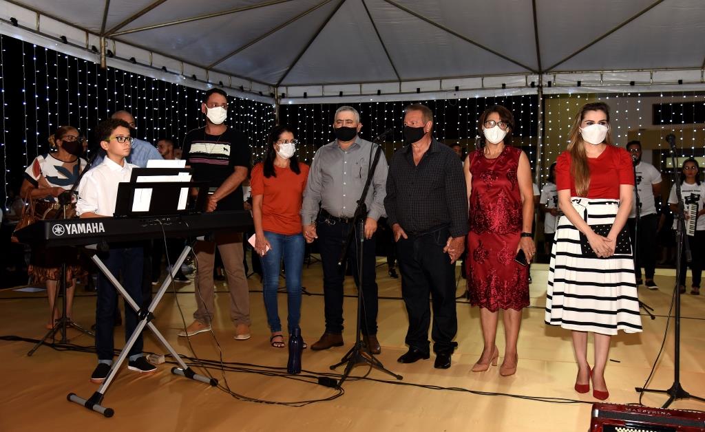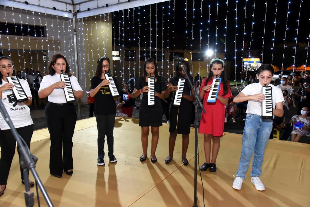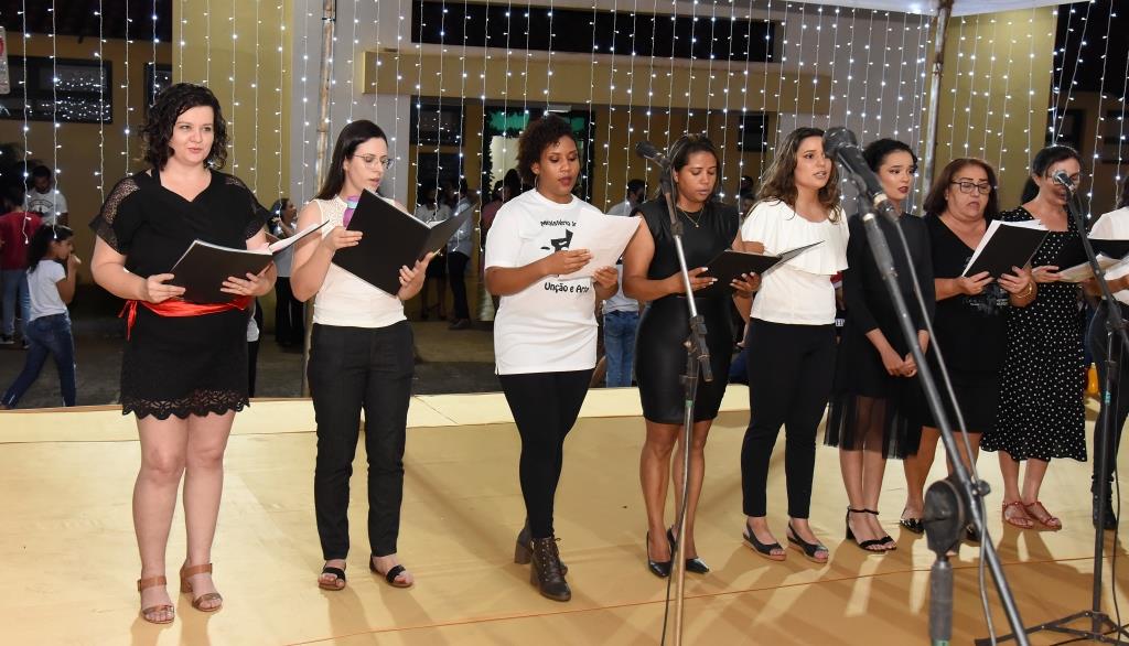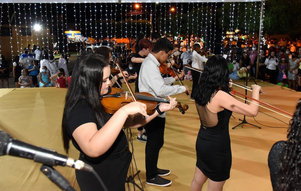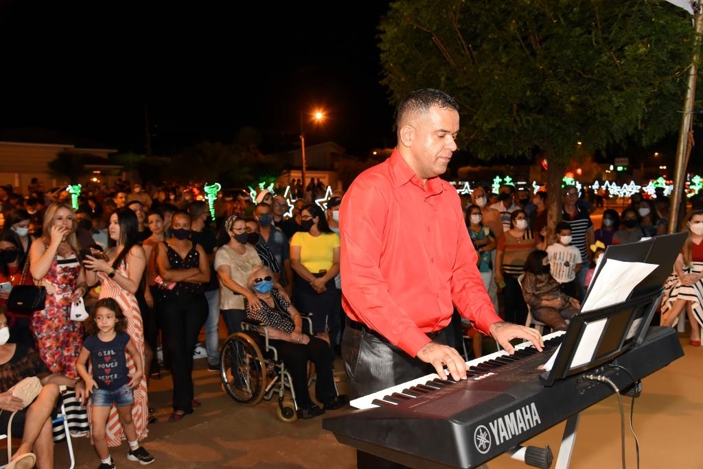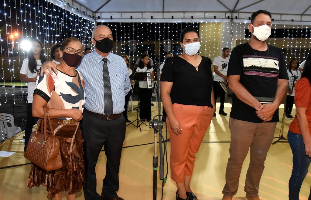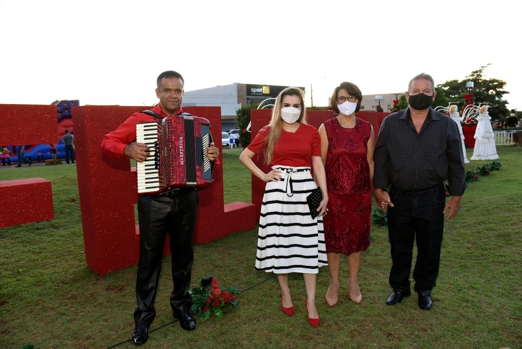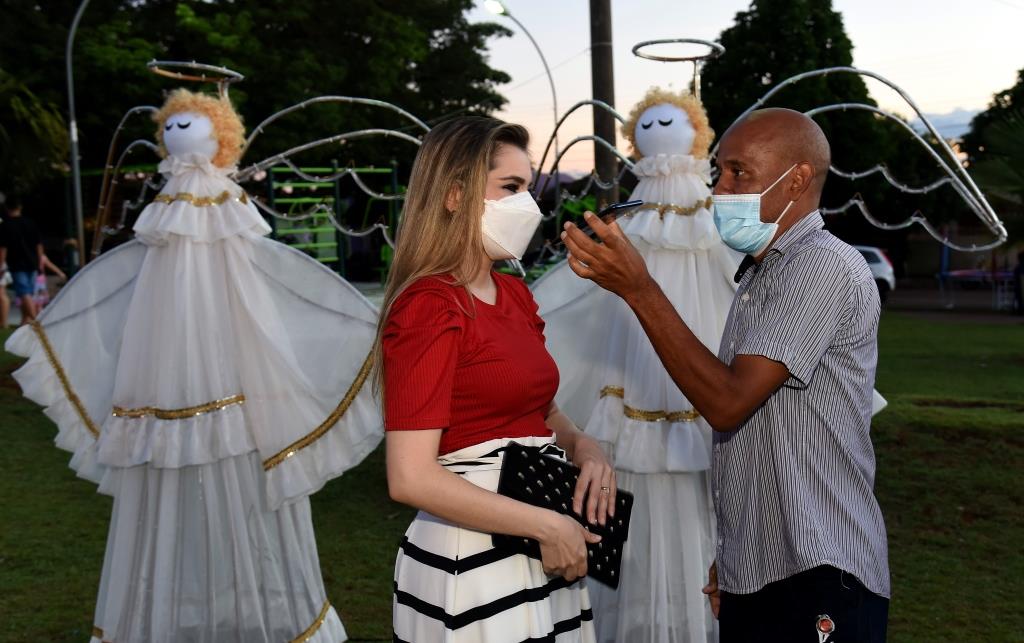 A ambientação de Natal de 2021 foi inaugurada, na Pista de Caminhada, na noite de hoje (03), com apresentações dos corais do Projeto Musical Municipal Harmonizando Vidas, que tem como maestro Divino Allancaster.