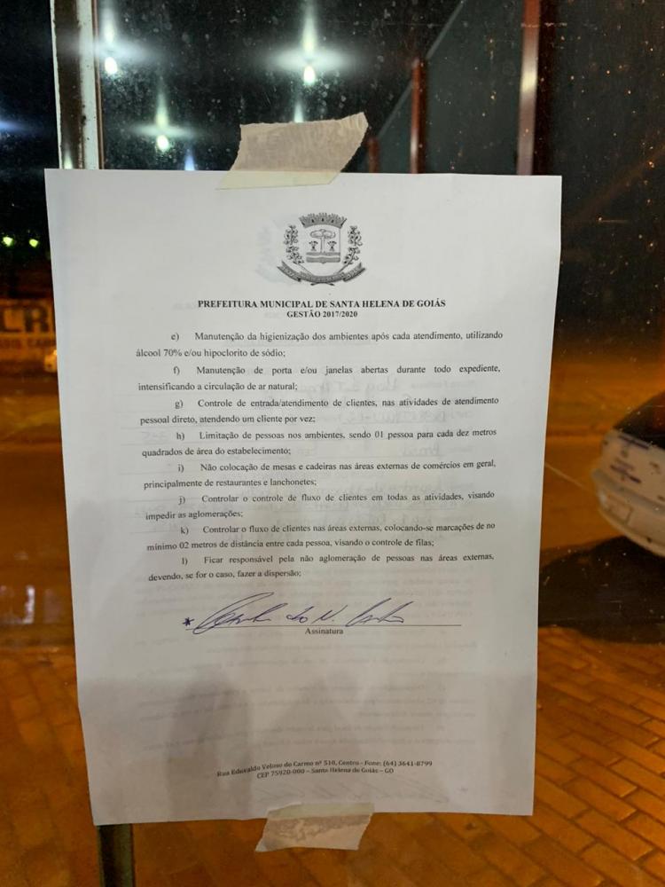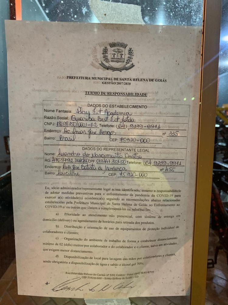 A Prefeitura Municipal de Santa Helena de Goiás, por meio da Secretaria de Esportes e Vigilância Sanitária, realizou ontem (05) fiscalizações nas academias do município para averiguar denúncias que foram feitas. Todas foram orientadas a cumprir os decretos de flexibilização. Os principais pontos fiscalizados foram: ✅Fazer o USO OBRIGATÓRIO DA MÁSCARA; ✅Disponibilizar álcool em gel para os clientes; ✅Fica estritamente proibido receber clientes de outra cidade; ✅Não exceder a capacidade de 30% de pessoas no estabelecimento; ✅Manter distância de 1 pessoa para cada 10 metros quadrados, ✅Deixar exposto o termo de responsabilidade. O não cumprimento acarretará na interdição do estabelecimento por tempo indeterminado e multa.