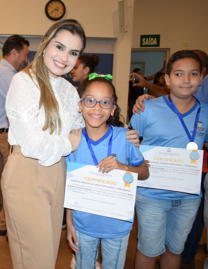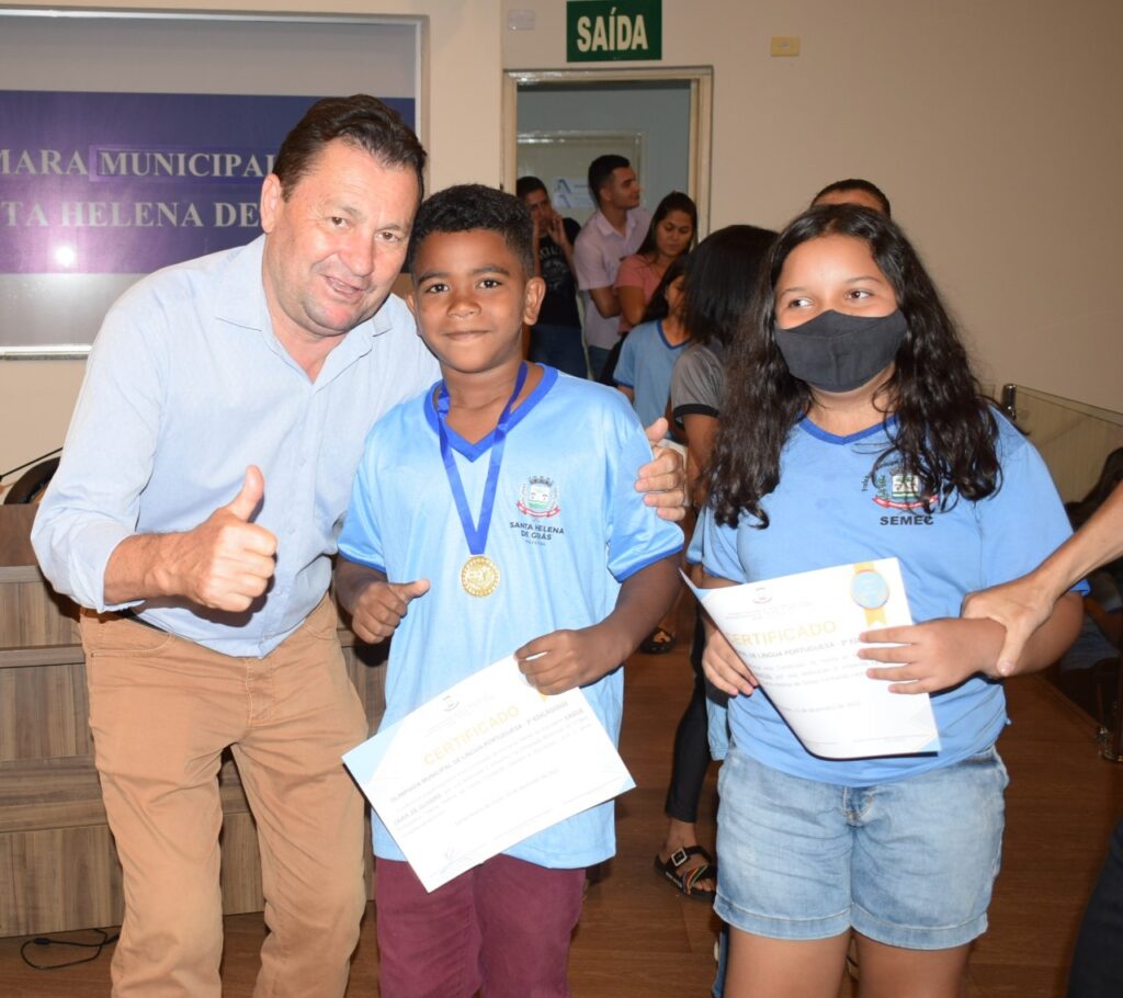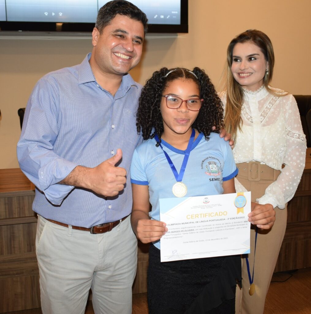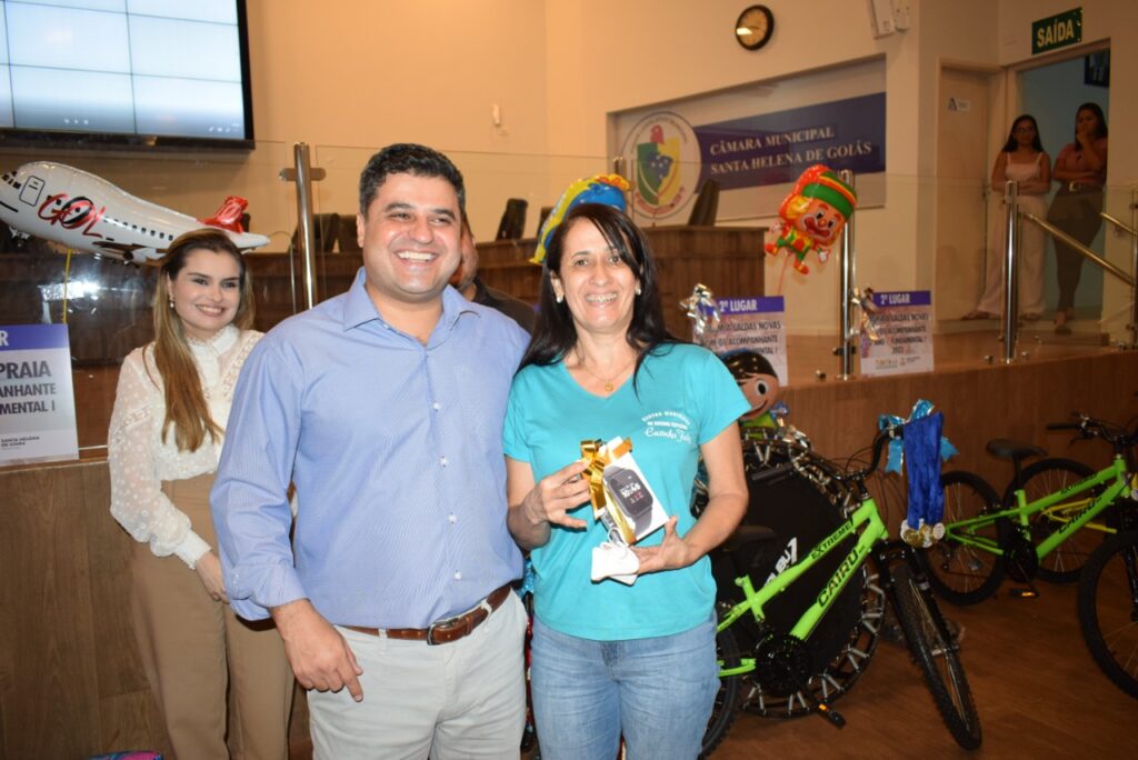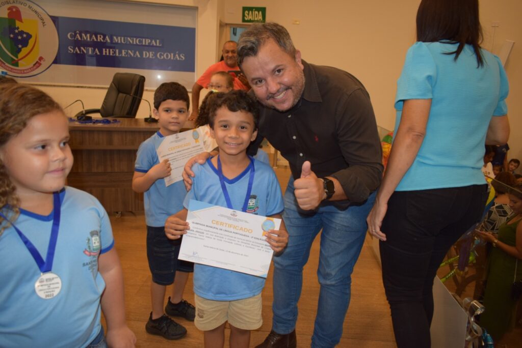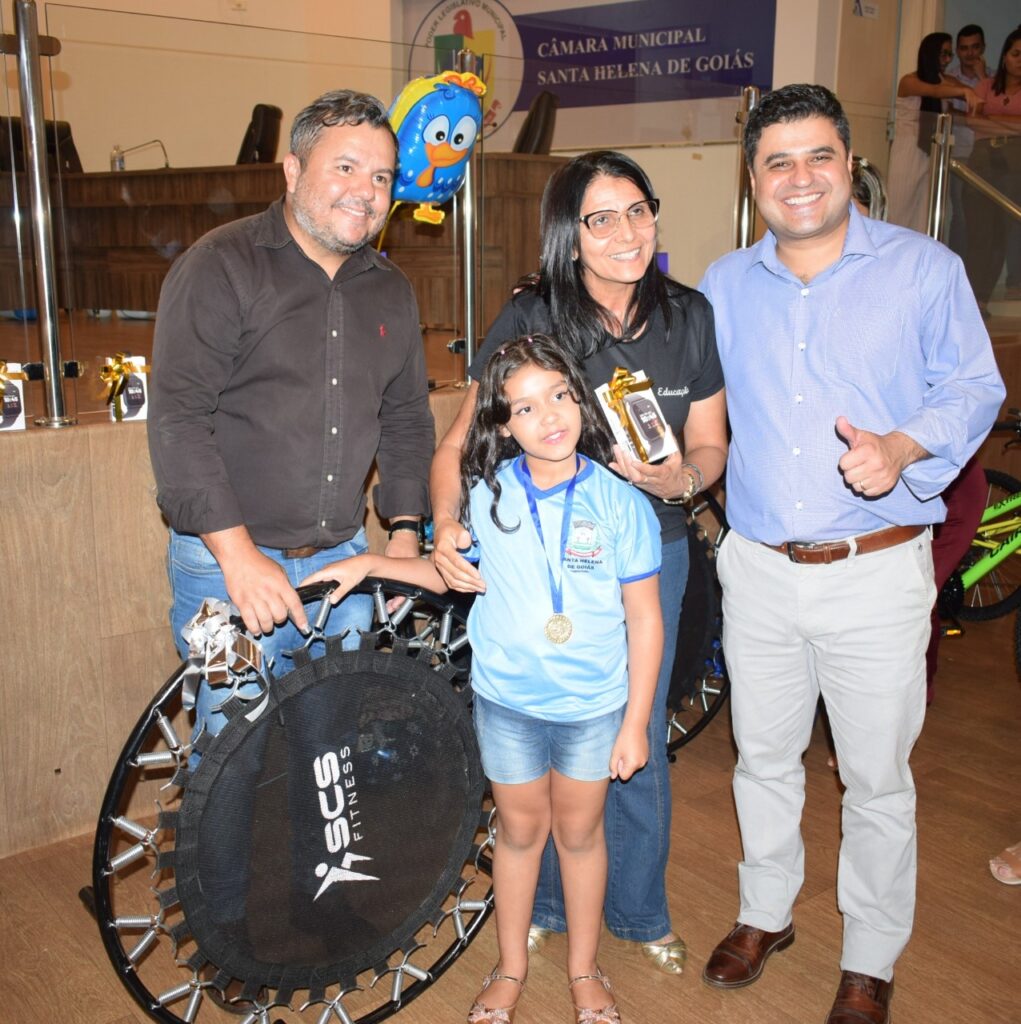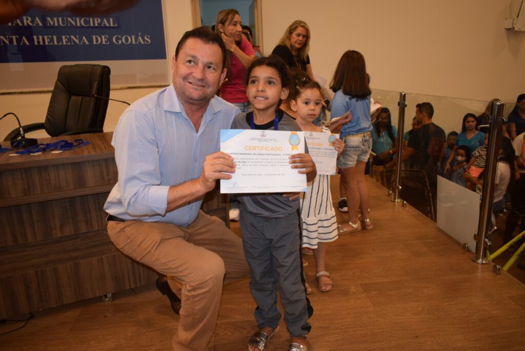 Prefeitura Municipal de Santa Helena de Goiás através da Secretaria Municipal de Educação entrega premiação aos estudantes premiados pela Olimpíada Municipal de língua Portuguesa. Em um universo de mais de 3.500 alunos na rede municipal de ensino, mais de 200 foram classificados e chegou o grande dia da premiação que vai de bicicleta, cama elástica, viagens a Caldas Novas e viagens a Praia com acompanhante e muito mais, vale ressaltar que o professor do aluno também recebe prêmios e a maioria recebeu um celular cada. Prefeito Dr. João Alberto, 1ª dama Dra. Renata Asmar Rodrigues, vice-prefeito Dr. Agenor Bezerra de Queiroz, secretário da educação Esteverson, vereadores Aduil Junior, Francisco Dantas e Silvio Marques, além de toda a equipe da educação, participaram do evento que aliás foi muito bem organizado.