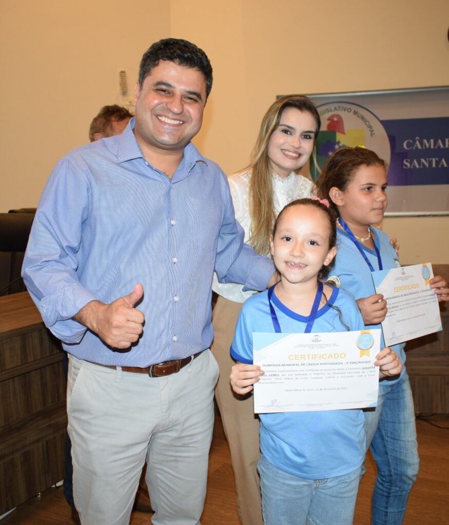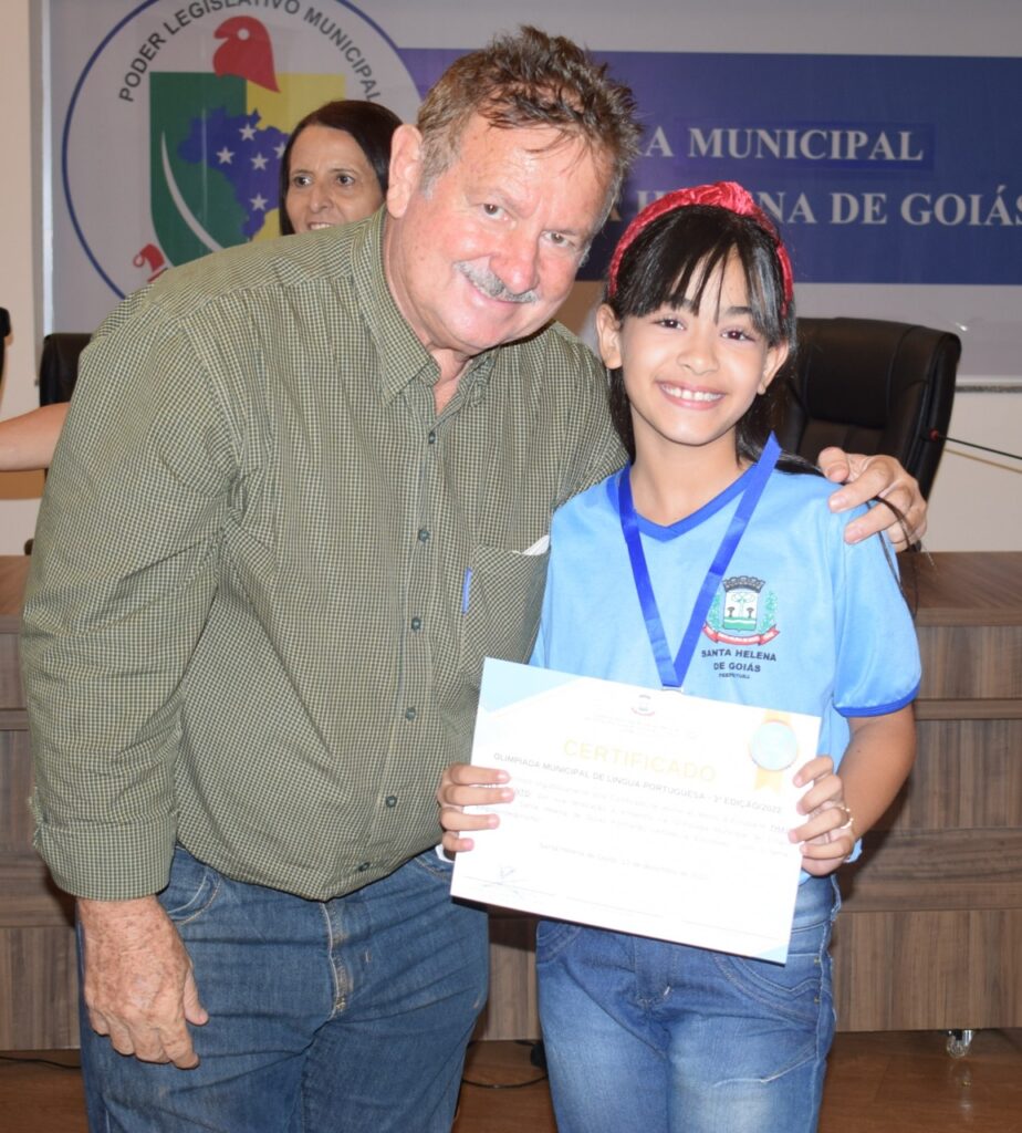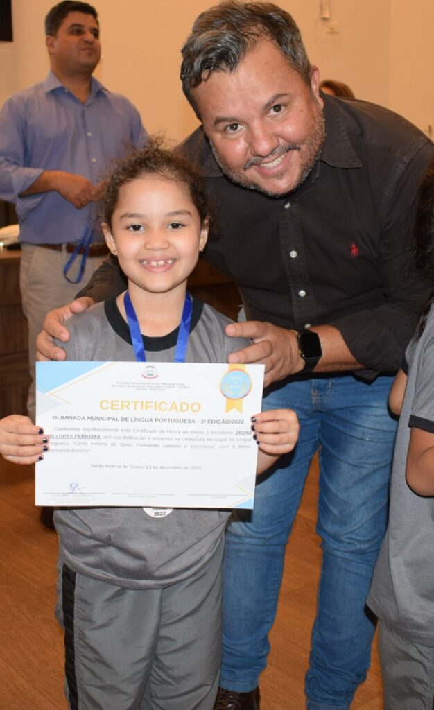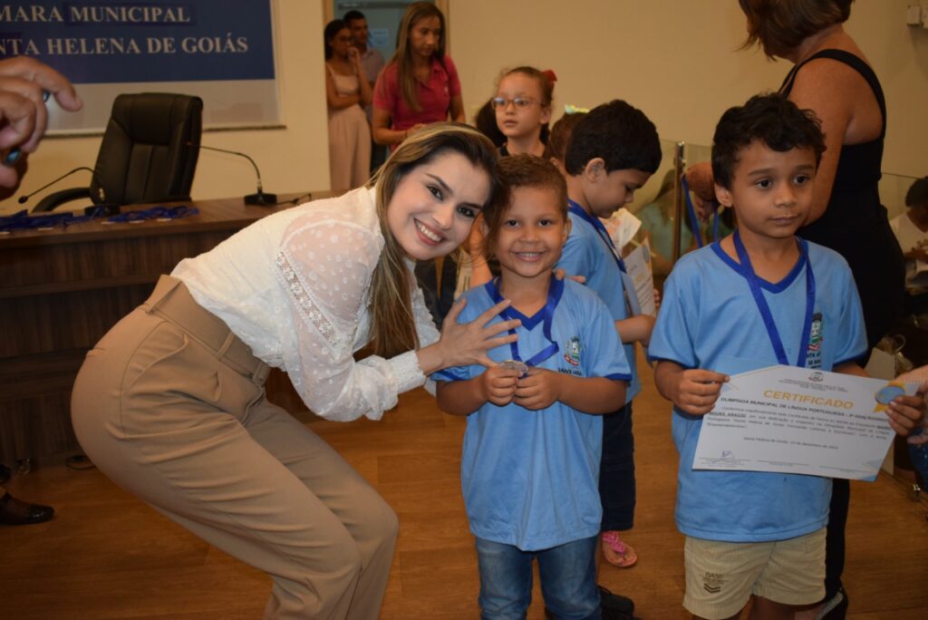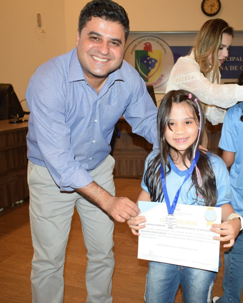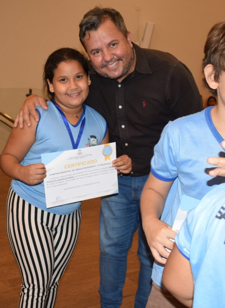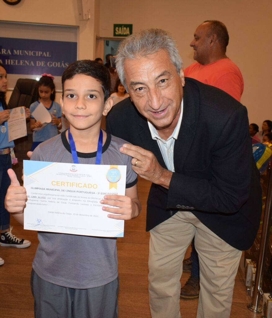 Prefeitura Municipal de Santa Helena de Goiás através da Secretaria Municipal de Educação entrega premiação aos estudantes premiados pela Olimpíada Municipal de língua Portuguesa. Em um universo de mais de 3.500 alunos na rede municipal de ensino, mais de 200 foram classificados e chegou o grande dia da premiação que vai de bicicleta, cama elástica, viagens a Caldas Novas e viagens a Praia com acompanhante e muito mais, vale ressaltar que o professor do aluno também recebe prêmios e a maioria recebeu um celular cada. Prefeito Dr. João Alberto, 1ª dama Dra. Renata Asmar Rodrigues, vice-prefeito Dr. Agenor Bezerra de Queiroz, secretário da educação Esteverson, vereadores Aduil Junior, Francisco Dantas e Silvio Marques, além de toda a equipe da educação, participaram do evento que aliás foi muito bem organizado.