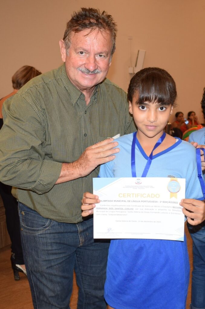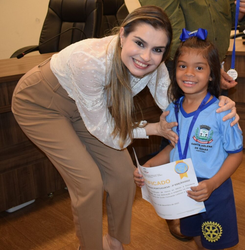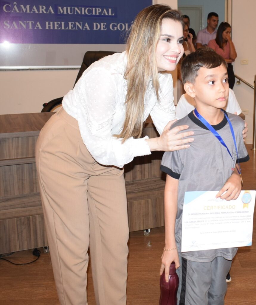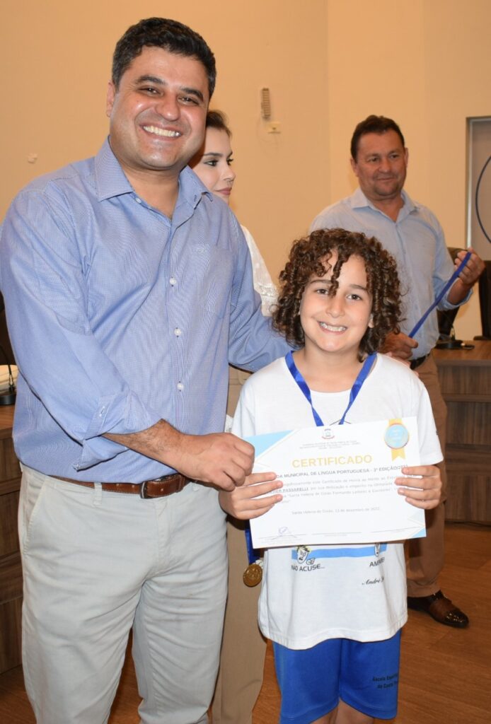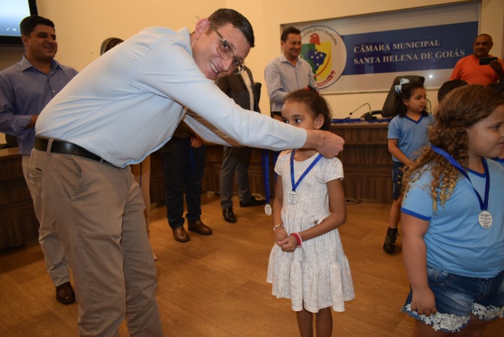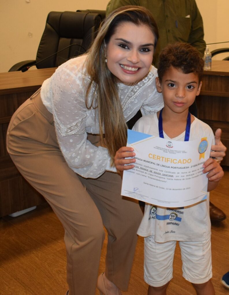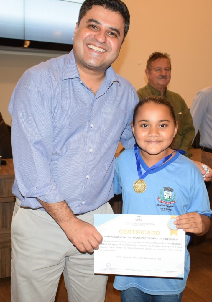 Prefeitura Municipal de Santa Helena de Goiás através da Secretaria Municipal de Educação entrega premiação aos estudantes premiados pela Olimpíada Municipal de língua Portuguesa. Em um universo de mais de 3.500 alunos na rede municipal de ensino, mais de 200 foram classificados e chegou o grande dia da premiação que vai de bicicleta, cama elástica, viagens a Caldas Novas e viagens a Praia com acompanhante e muito mais, vale ressaltar que o professor do aluno também recebe prêmios e a maioria recebeu um celular cada. Prefeito Dr. João Alberto, 1ª dama Dra. Renata Asmar Rodrigues, vice-prefeito Dr. Agenor Bezerra de Queiroz, secretário da educação Esteverson, vereadores Aduil Junior, Francisco Dantas e Silvio Marques, além de toda a equipe da educação, participaram do evento que aliás foi muito bem organizado.