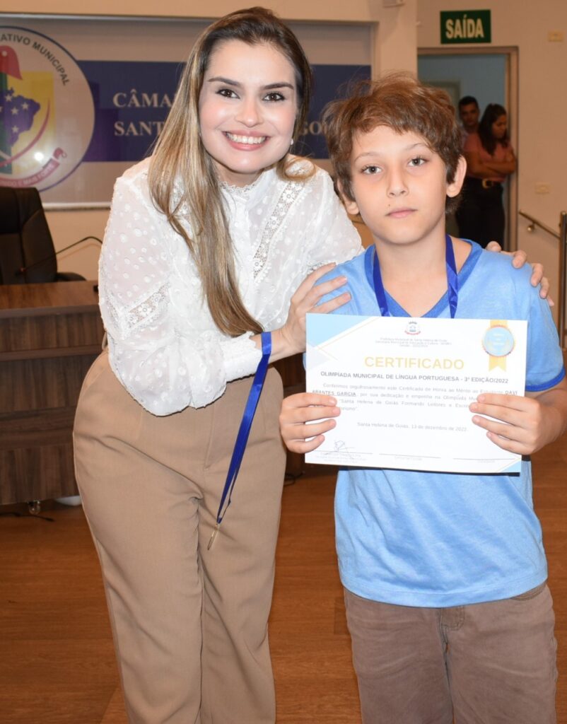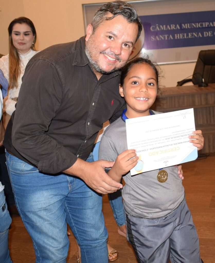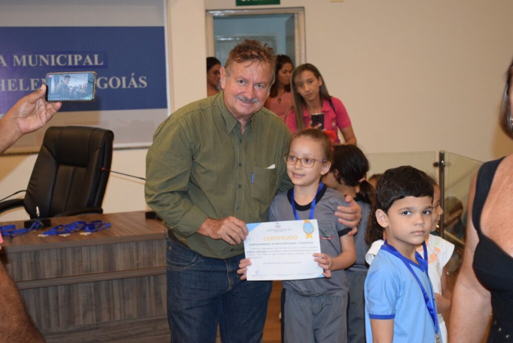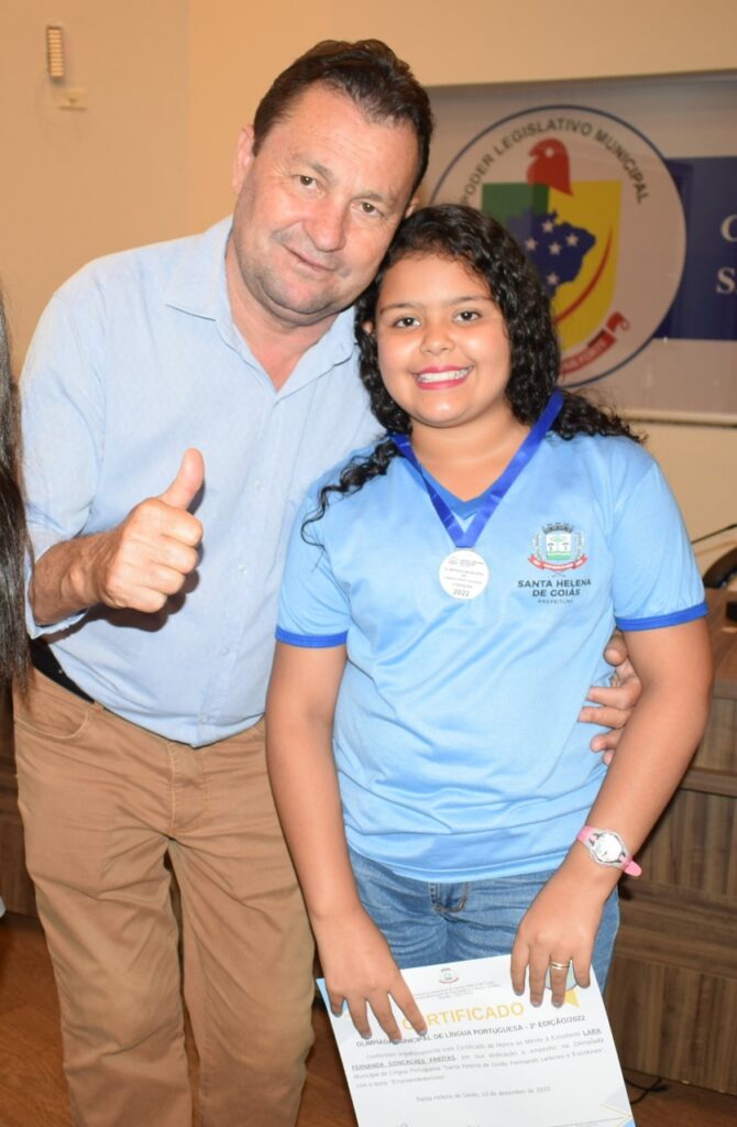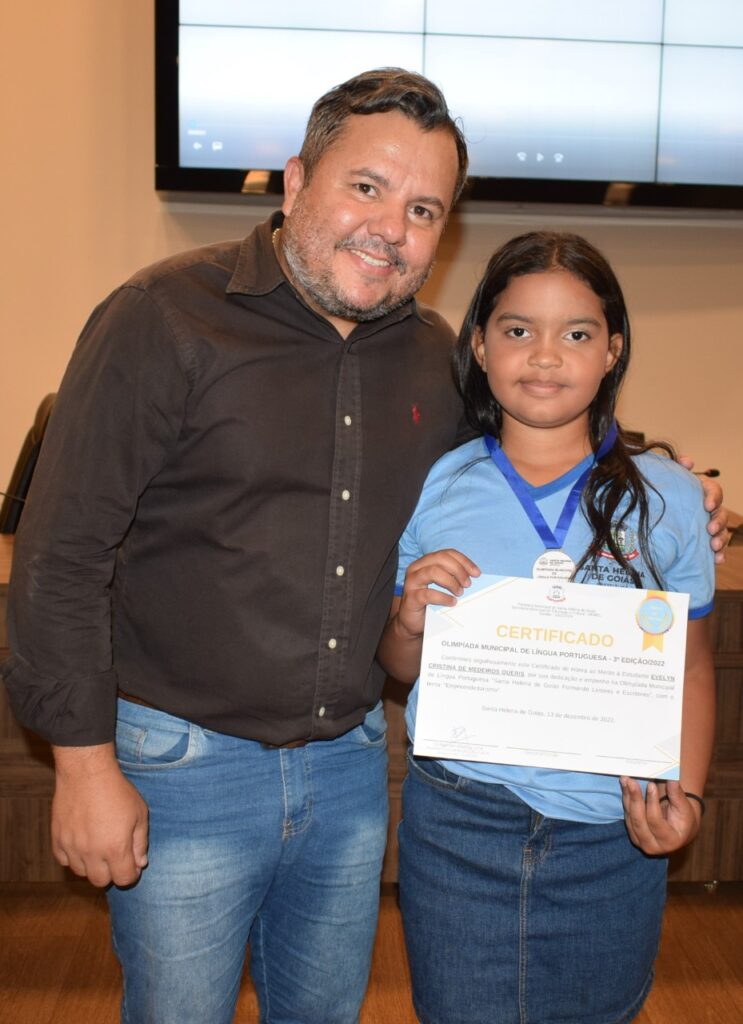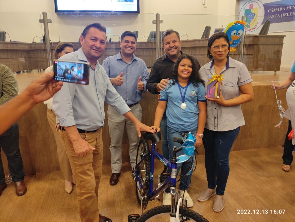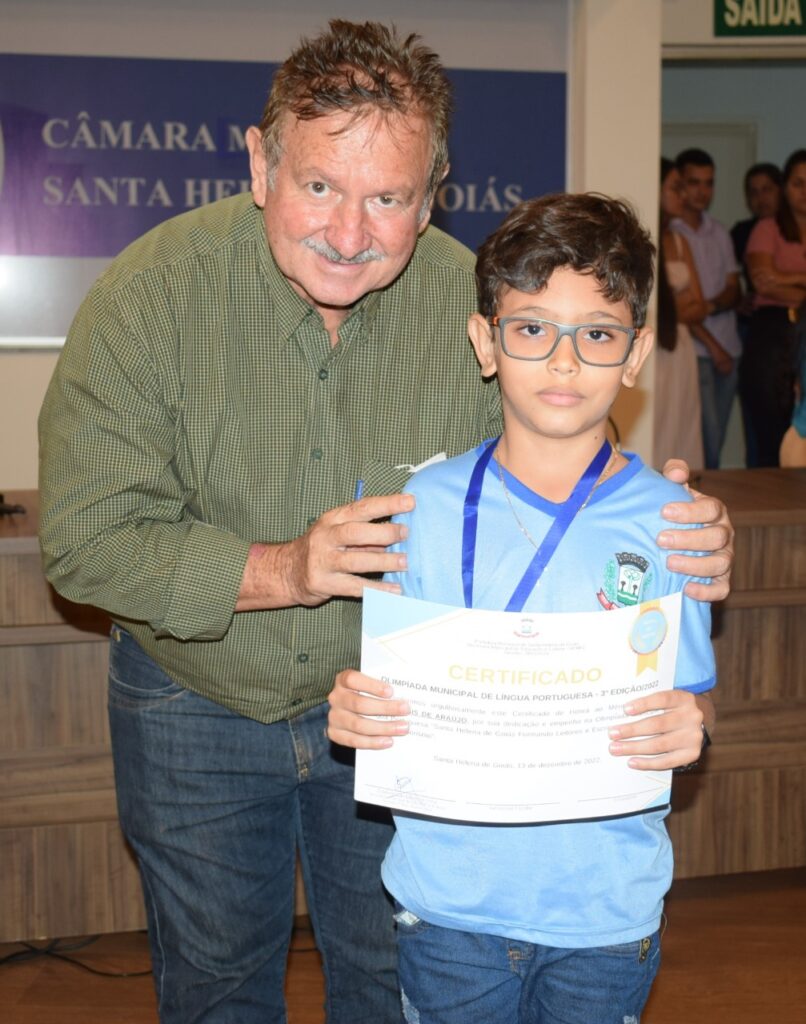 Prefeitura Municipal de Santa Helena de Goiás através da Secretaria Municipal de Educação entrega premiação aos estudantes premiados pela Olimpíada Municipal de língua Portuguesa. Em um universo de mais de 3.500 alunos na rede municipal de ensino, mais de 200 foram classificados e chegou o grande dia da premiação que vai de bicicleta, cama elástica, viagens a Caldas Novas e viagens a Praia com acompanhante e muito mais, vale ressaltar que o professor do aluno também recebe prêmios e a maioria recebeu um celular cada. Prefeito Dr. João Alberto, 1ª dama Dra. Renata Asmar Rodrigues, vice-prefeito Dr. Agenor Bezerra de Queiroz, secretário da educação Esteverson, vereadores Aduil Junior, Francisco Dantas e Silvio Marques, além de toda a equipe da educação, participaram do evento que aliás foi muito bem organizado.