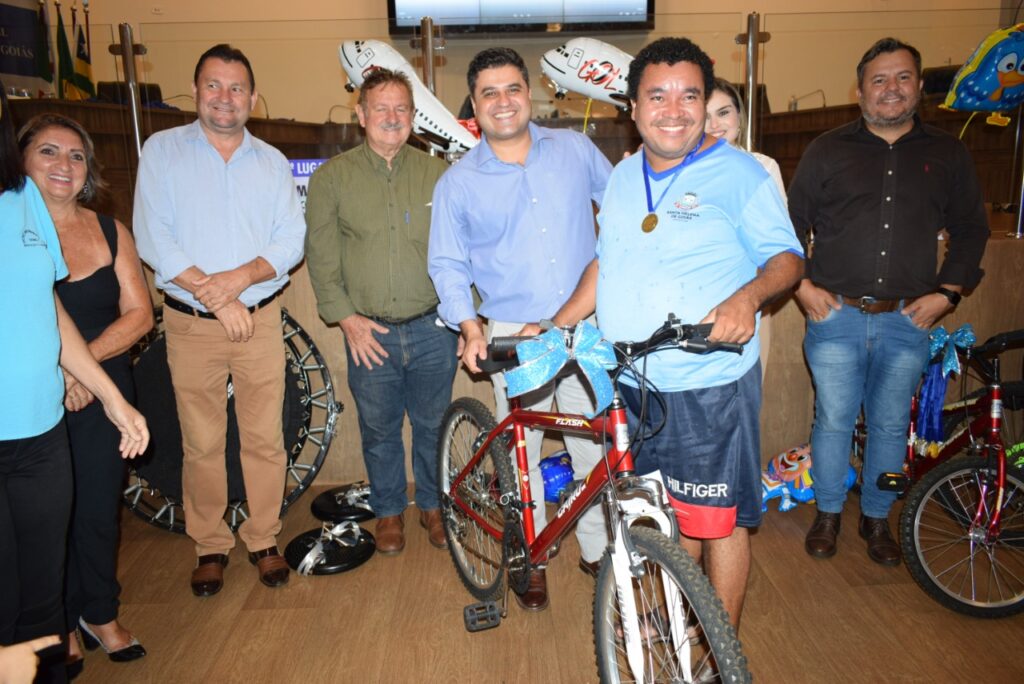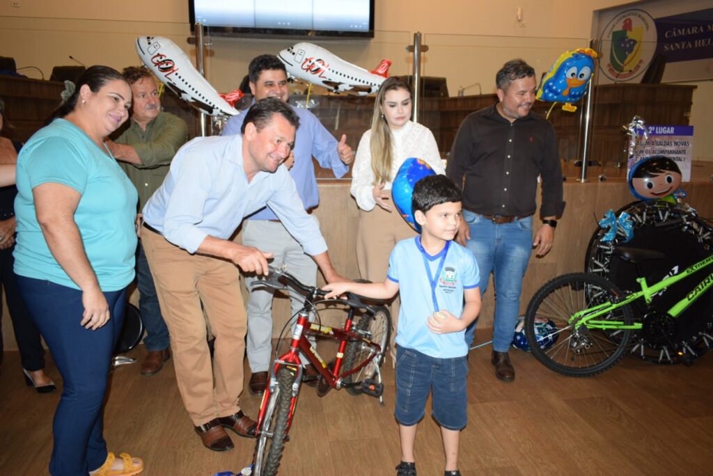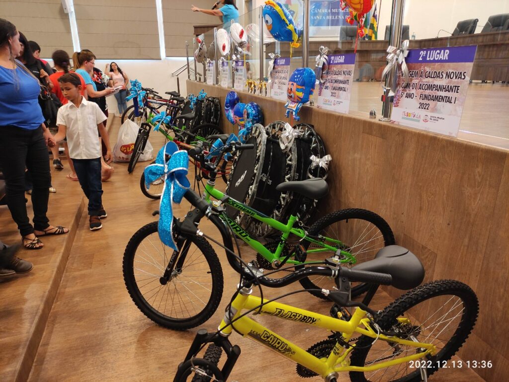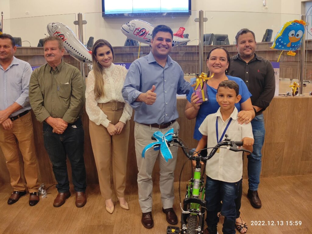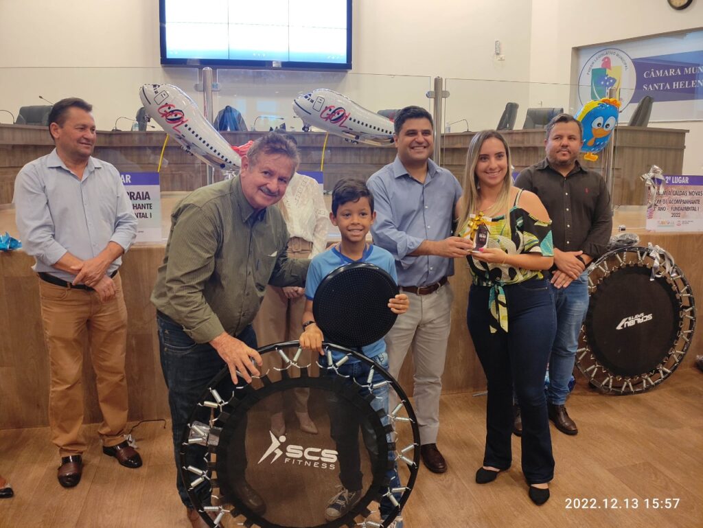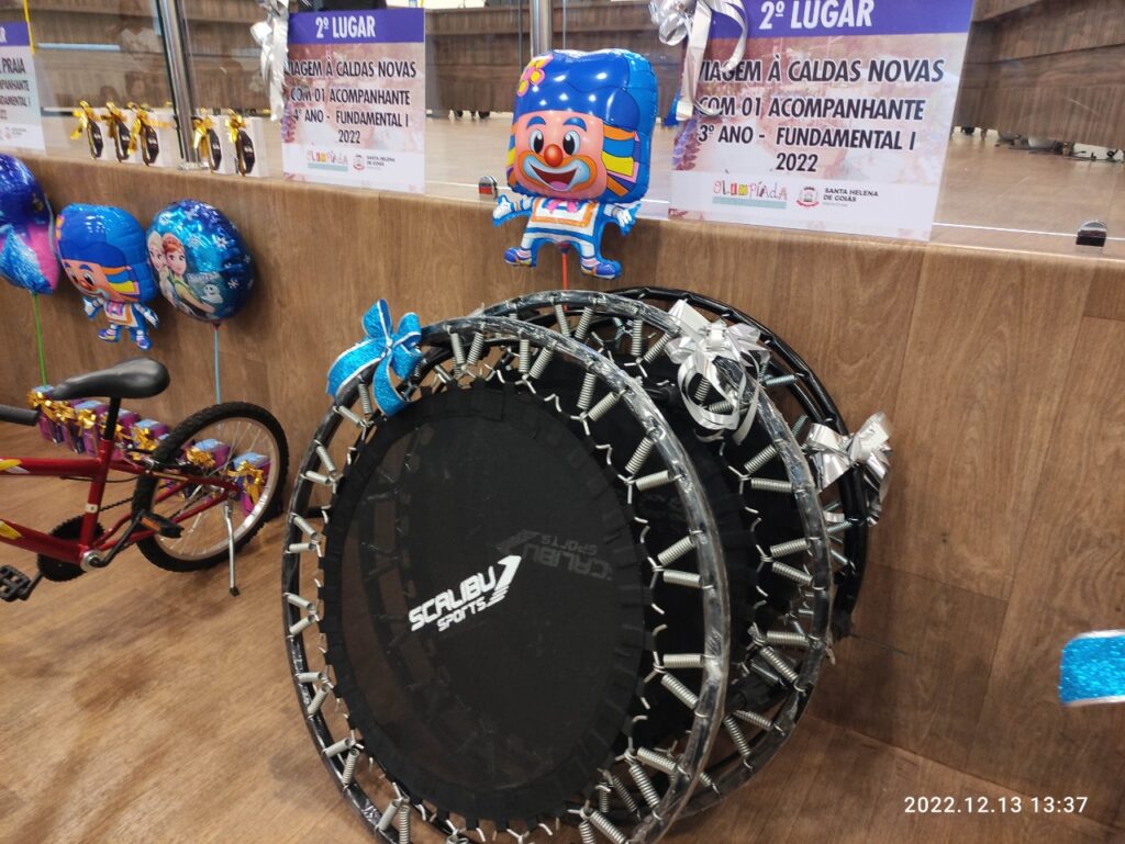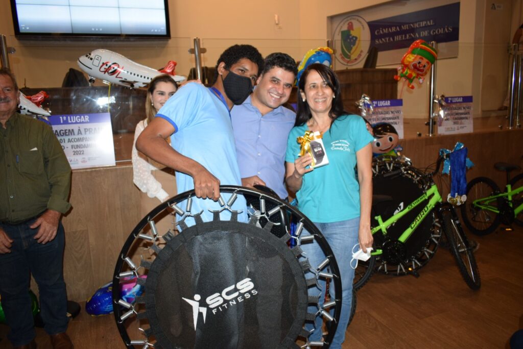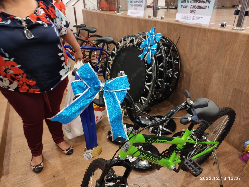 1º LUGAR: Marcelo Silva Gomes, no Centro Municipal de Ensino Especial Casinha Feliz, ganho uma bicicleta e a professora Anizete Aparecida da Silva Gomes ganhou um celular. 2º Lugar, aluno Weverton Carlos Menezes dos Santos ganhou uma cama elástica, ele é da escola Narcisa Costa Leão, e a professora Edilene Ribeiro Silva ganhou um Smart Speaker Display, e o 3º colocado foi o aluno Gabriel Manoel da Silva, do Centro Municipal de Ensino Especial Casinha Feliz, ganhou uma cama elástica e a professosa Anizete Aparecida da Silva Gomes recebeu uma pulseira inteligente.