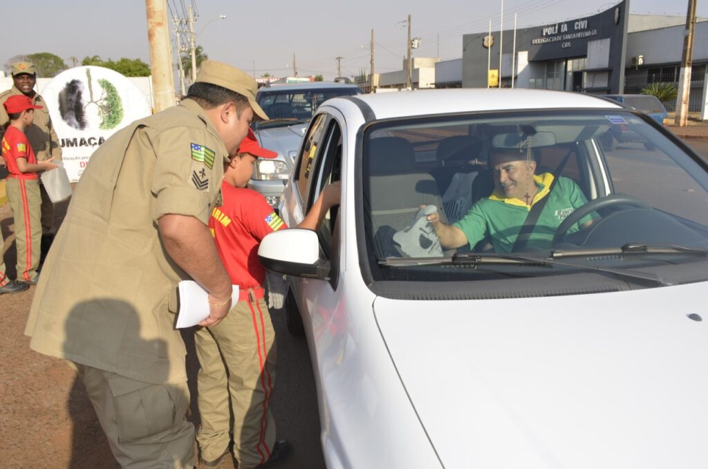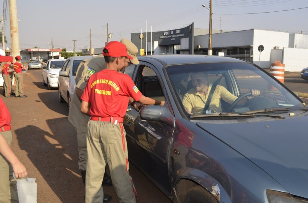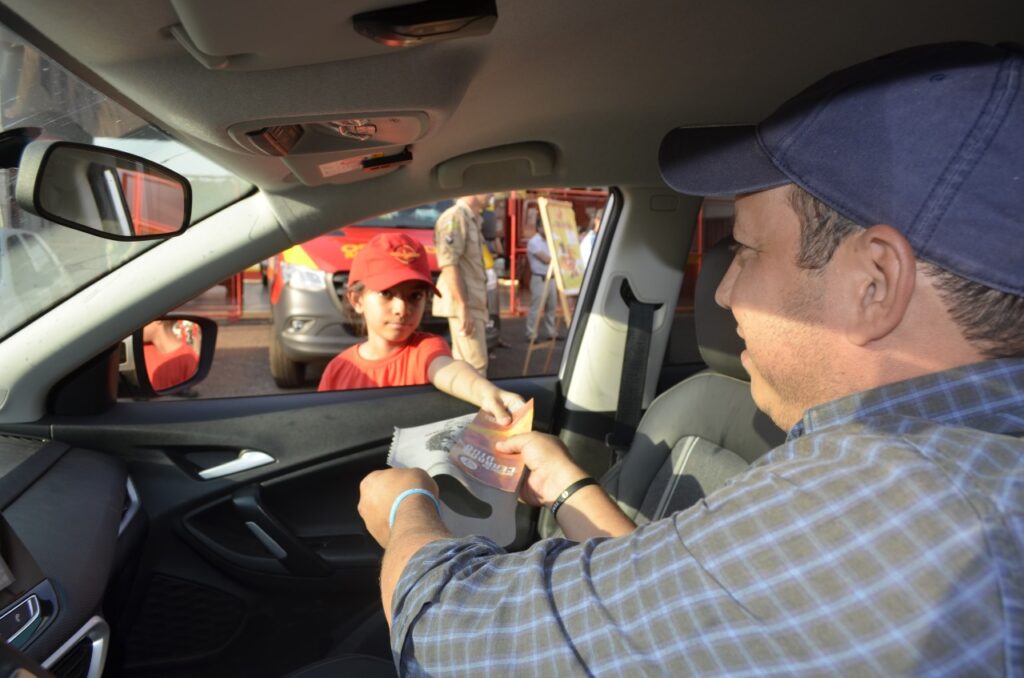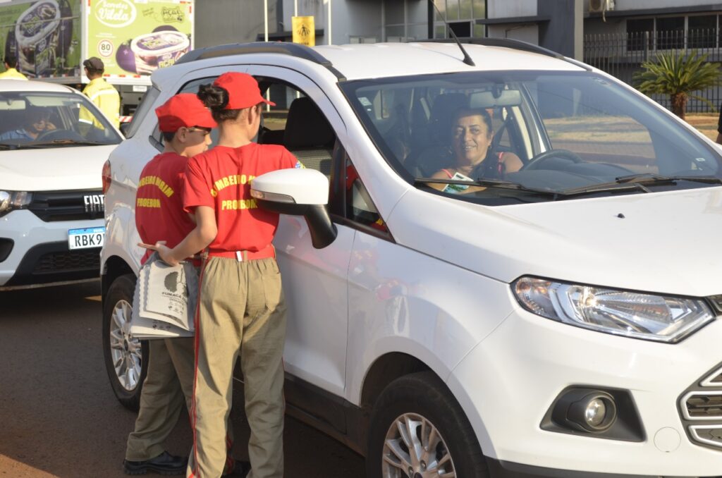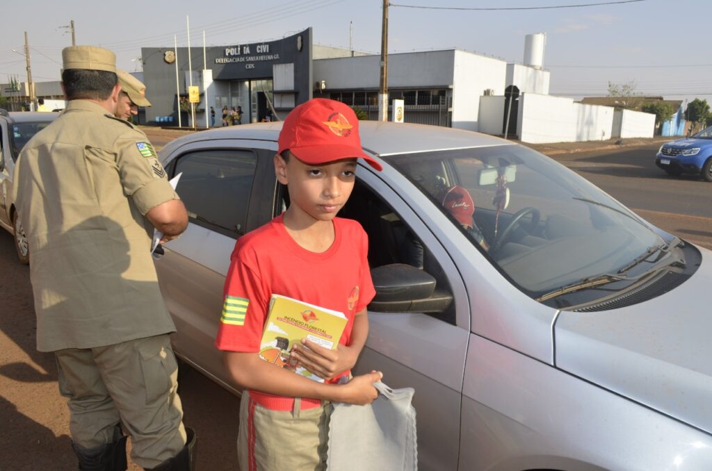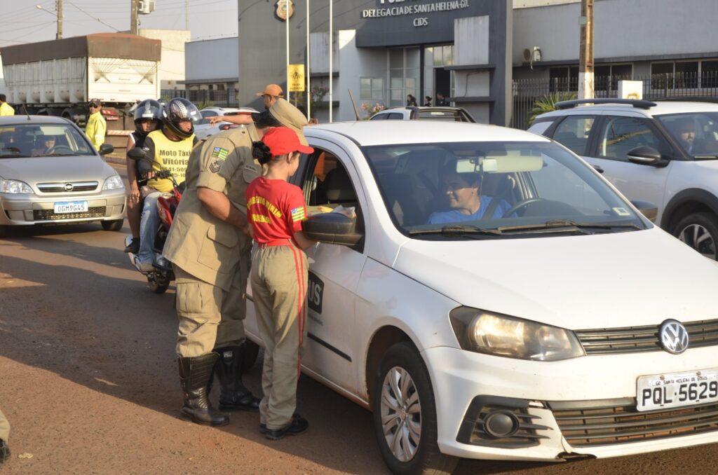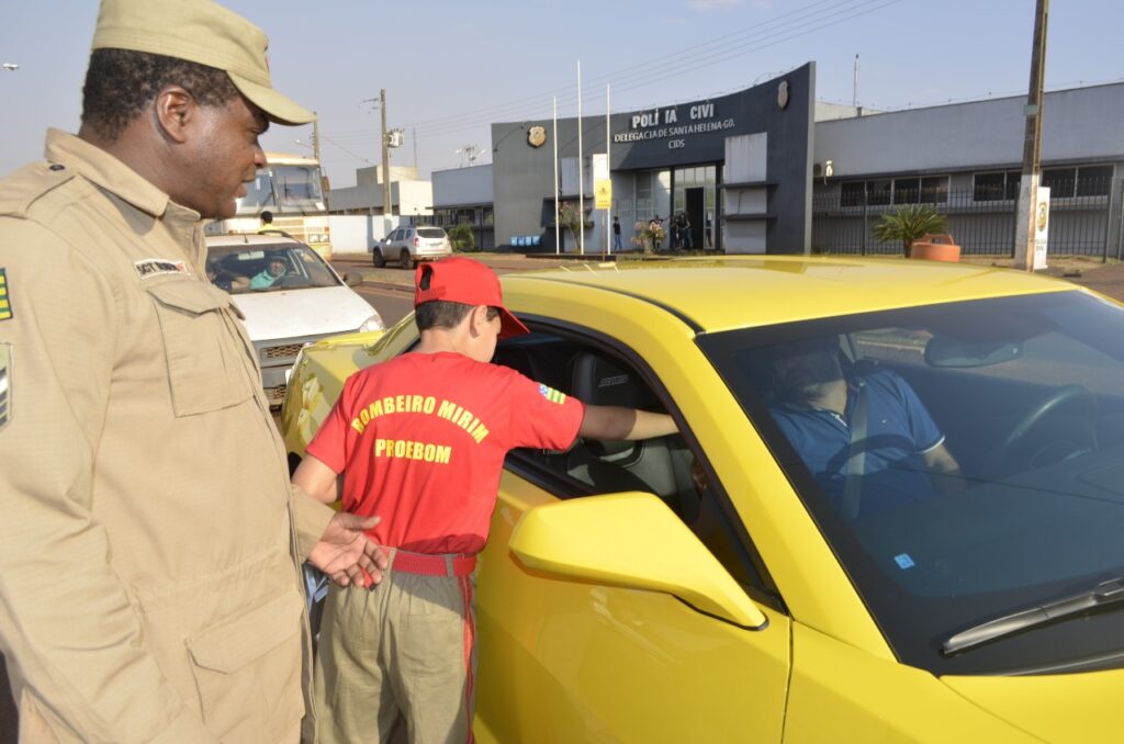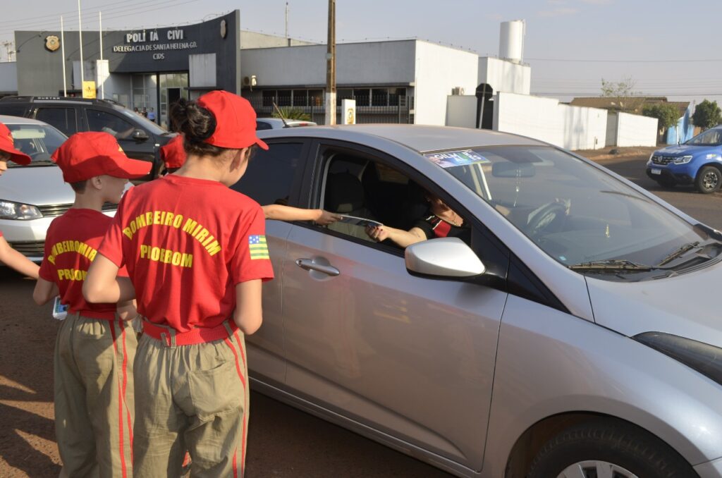 Os alunos do Projeto Bombeiro Mirim, sobre a instrução do seu comandante, distribuíram adesivos e panfleto de conscientização aos veículos que passaram em frente ao Quartel do Bombeiro Militar de Santa Helena, o intuito principal dessa ação é mostrar para a população que cada cidadão por fazer sua parte não colocando foto e principalmente denunciando através dos números 127 ou 64 99979-0701.