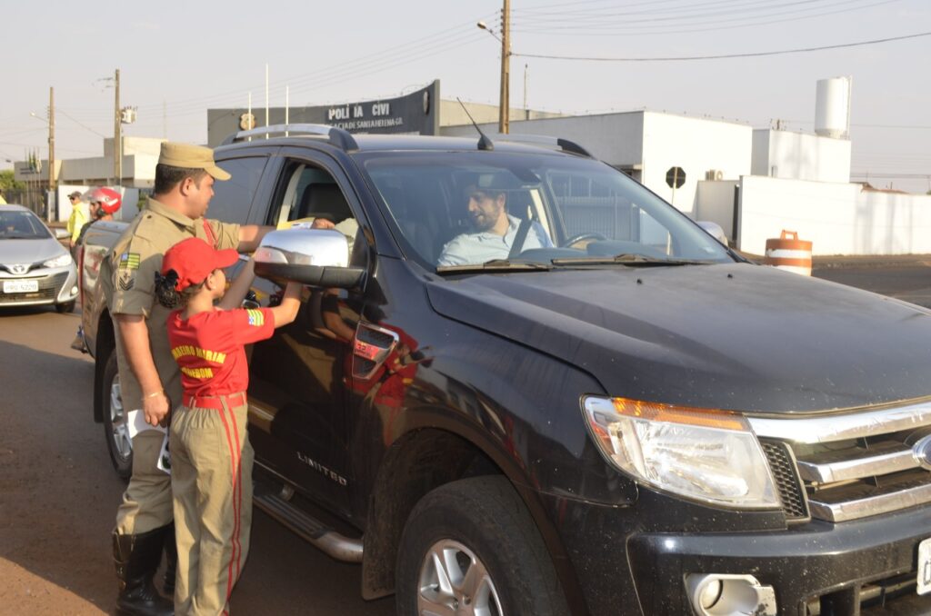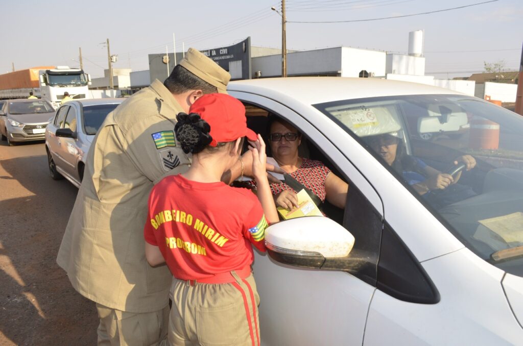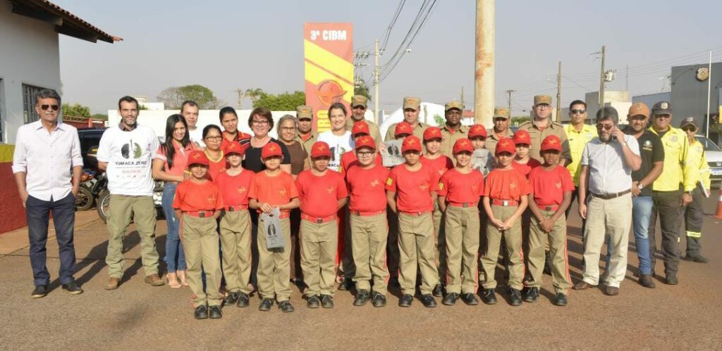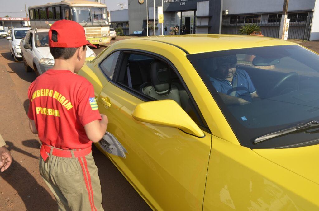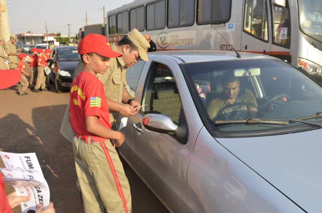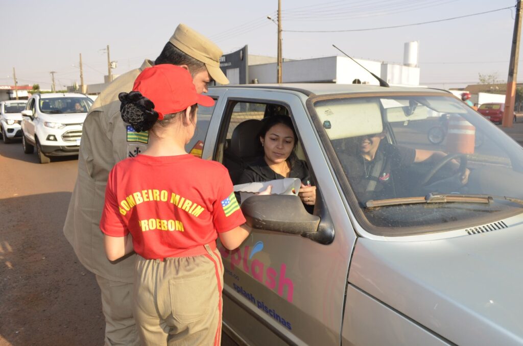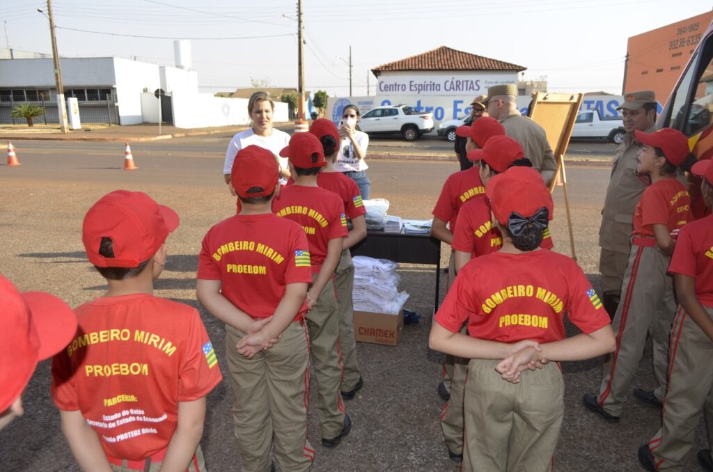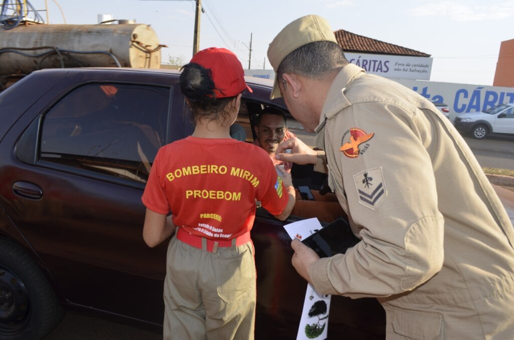 Os alunos do Projeto Bombeiro Mirim, sobre a instrução do seu comandante, distribuíram adesivos e panfleto de conscientização aos veículos que passaram em frente ao Quartel do Bombeiro Militar de Santa Helena, o intuito principal dessa ação é mostrar para a população que cada cidadão por fazer sua parte não colocando foto e principalmente denunciando através dos números 127 ou 64 99979-0701.
