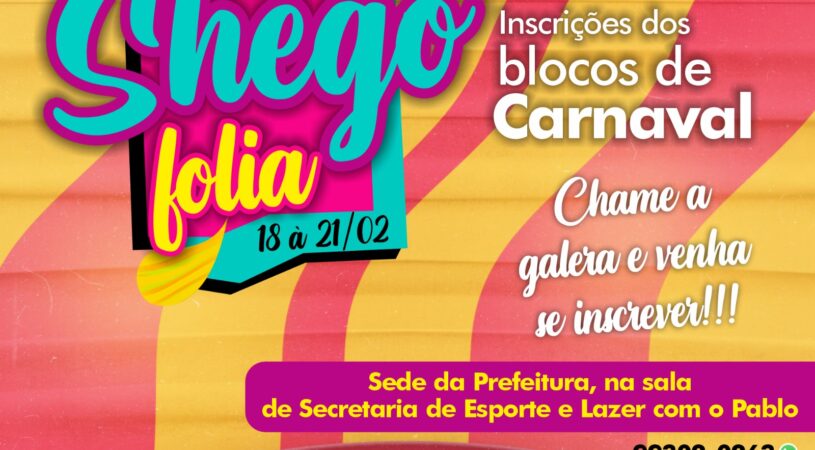Nesta segunda-feira, dia 13/02, iniciam as inscrições para os blocos de carnaval, na sede da Prefeitura na sala da Secretaria de Esporte e Lazer com o Pablo.
