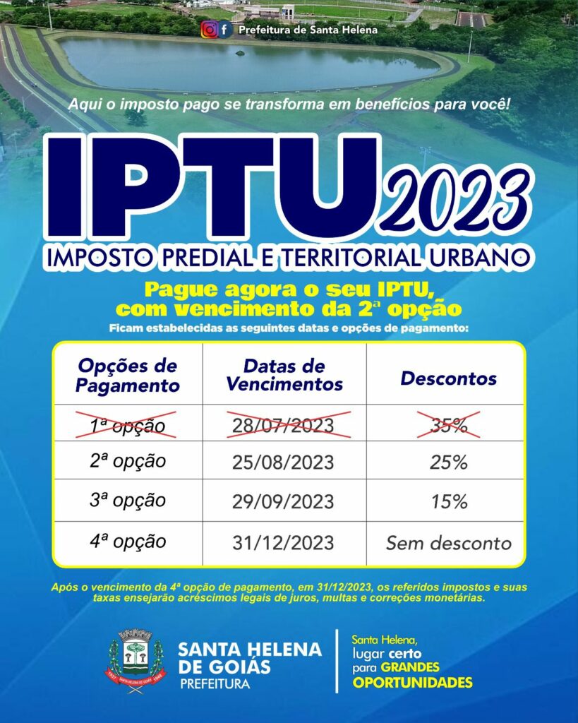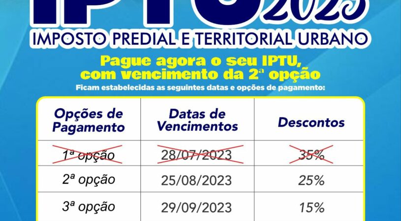 Não perca a chance de economizar! Com o pagamento do IPTU até o dia 25 de agosto, você garante até 25% de desconto e ainda contribui para o desenvolvimento da nossa cidade.