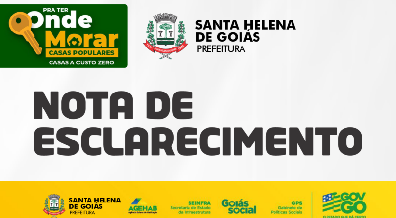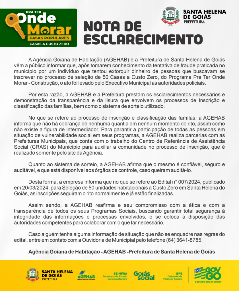 A Agência Goiana de Habitação (AGEHAB) e a Prefeitura de Santa Helena de Goiás vêm a público informar que, após tomarem conhecimento da tentativa de fraude praticada no município por um indivíduo que tentou extorquir dinheiro de pessoas que buscavam se inscrever no processo de seleção de 50 Casas a Custo Zero, do Programa Pra Ter Onde Morar - Construção, o ato foi levado pelo Executivo Municipal as autoridades policiais.