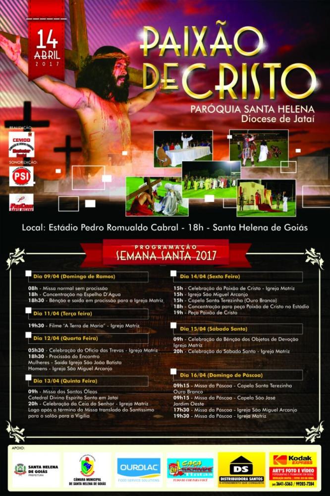 A Prefeitura Municipal de Santa Helena de Goiás apoia o evento e convida a todos a participarem. No dia 14 de Abril, haverá a encenação da peça Paixão de Cristo, às 18 horas, no Estádio Pedro Romualdo Cabral.
