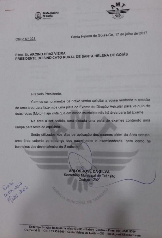 Em resposta ao ofício enviado pela Agência Municipal de Trânsito (AMT) de Santa Helena de Goiás ao Sindicato Rural, foi concedido um espaço para construção de uma pista de Exame de Direção Veicular para motos (rampa para teste de equilíbrio).