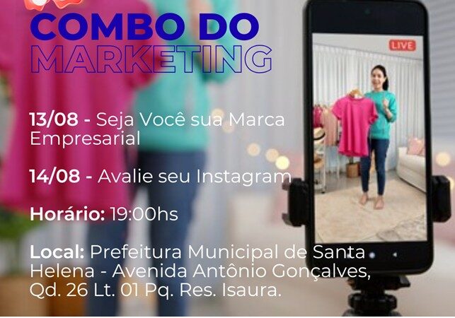 A Prefeitura de Santa Helena de Goiás, por meio da Sala do Empreendedor e em parceria com o Sebrae, realiza nos dias 13 e 14 de agosto o Combo do Marketing, um ciclo de oficinas gratuitas voltado ao fortalecimento de marcas e ao uso estratégico das redes sociais nos negócios.