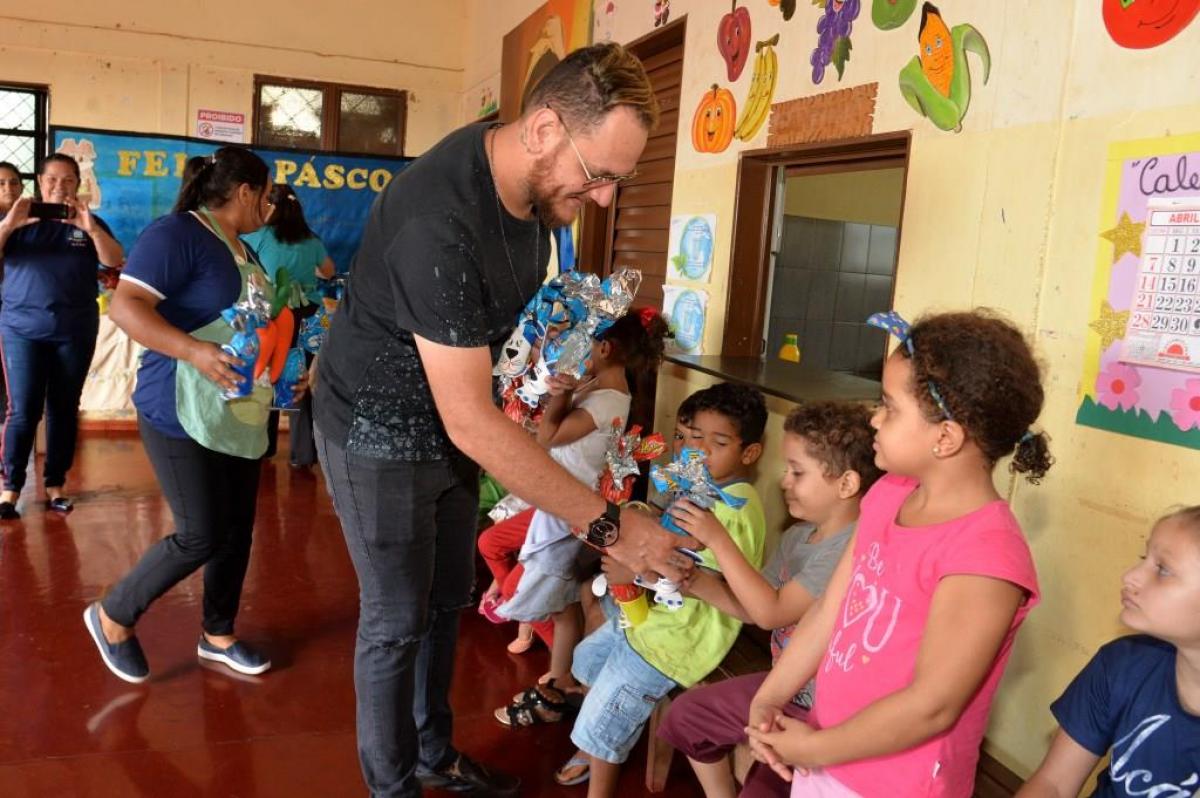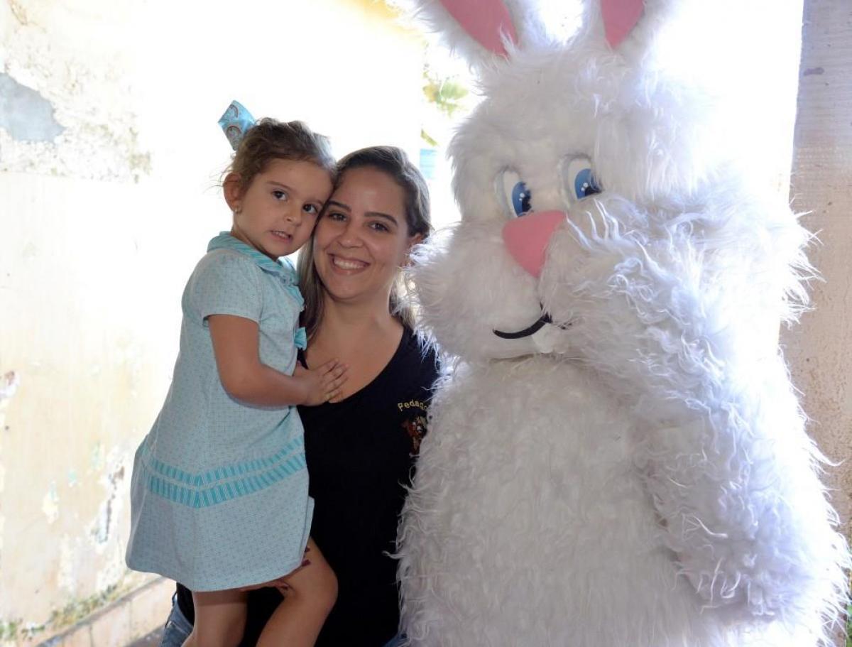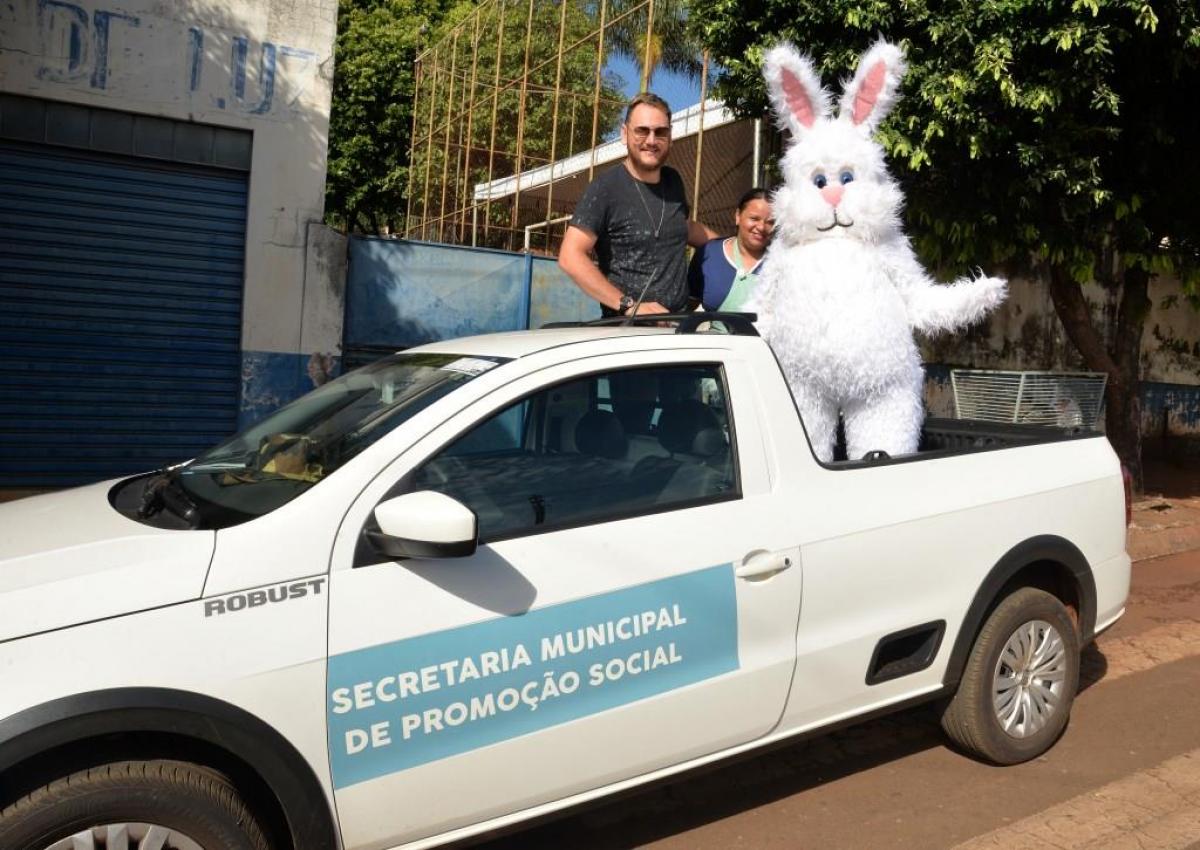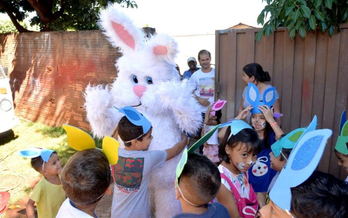 Autoridades locais e servidores municipais e o personagem Coelhinho do Páscoa fizeram a entrega dos ovos, proporcionando a alegria da criançada, que não esperou muito para comer as guloseimas.
