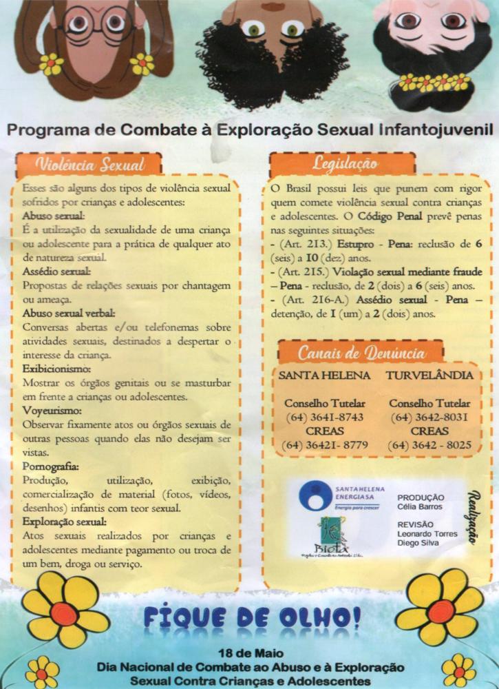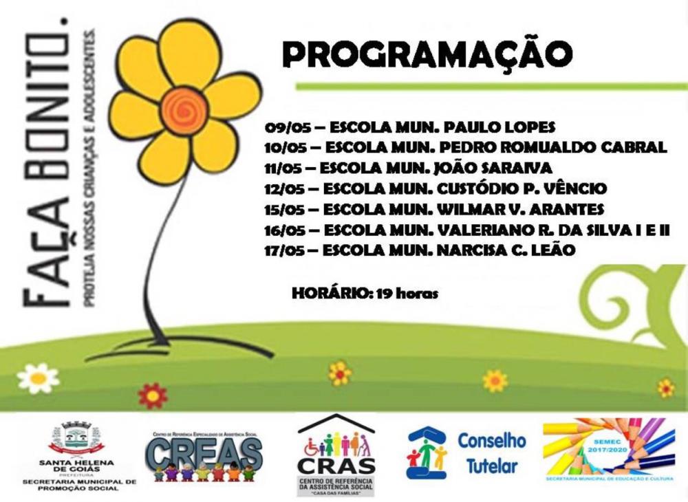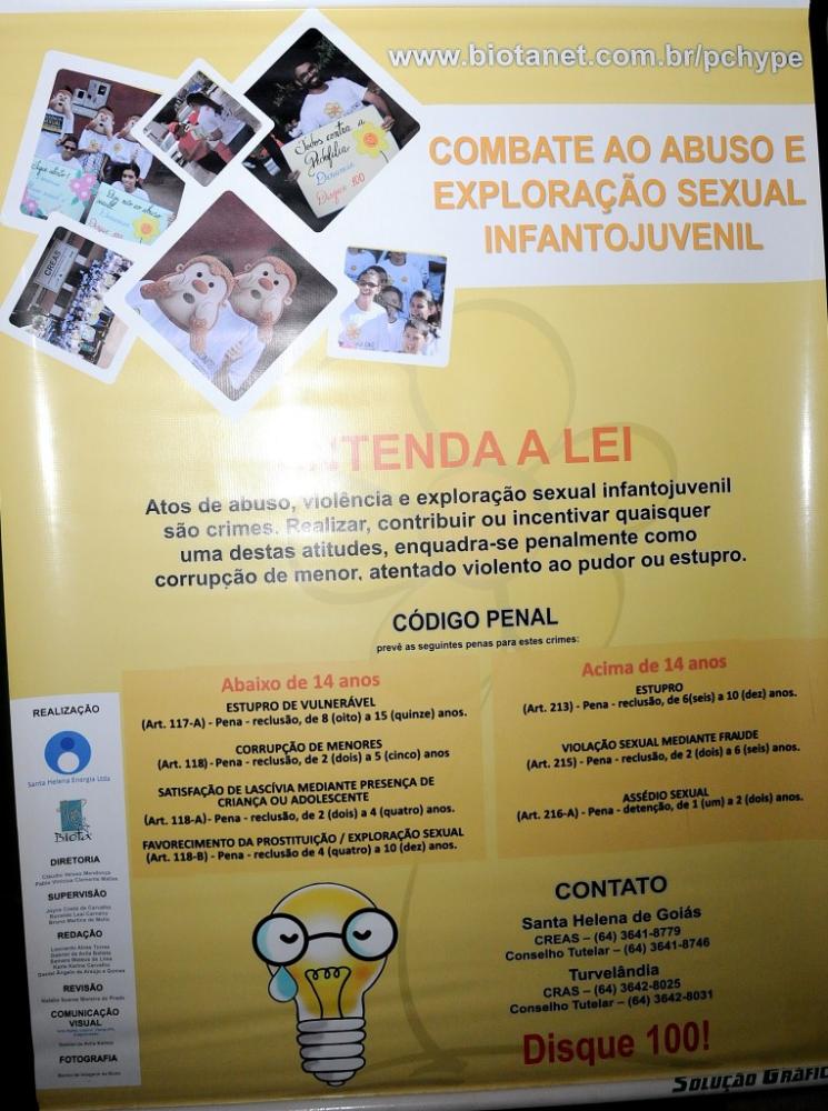 A Prefeitura Municipal de Santa helena de Goiás, por intermédio, das Secretarias de Promoção Social e de Educação Cultural (Semec), lançou a Campanha de Enfrentamento ao Abuso e à Exploração Sexual de Crianças e Adolescentes, na noite de ontem (09), na Escola Municipal Paulo Lopes.
