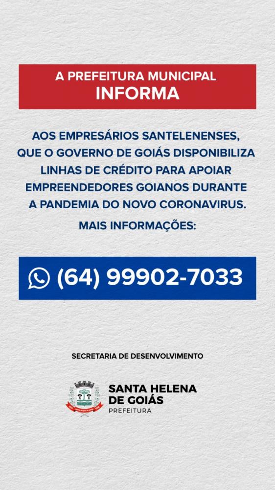 A Prefeitura de Santa Helena de Goiás, informa aos empresários Santelenenses, que o Governo do Estado de Goiás disponibilizará linhas de crédito para apoiar empreendedores goianos afetados pela pandemia do novo Coronavirus (COVID-19). A Secretaria de Desenvolvimento, Agricultura, Ciência, Tecnologia e Turismo, é responsável por orientar e prestar as informações a todos os interessados em pleitear os recursos. Para mais informações, os interessados, podem entrar em contato pelos telefones (64) 3641-8781 ou no 99902-7033 ou por email: desenvolvimento@santahelena.go.gov.br