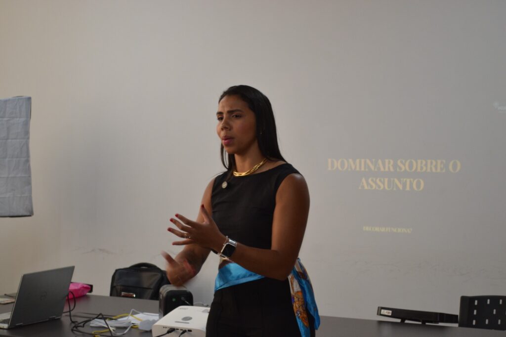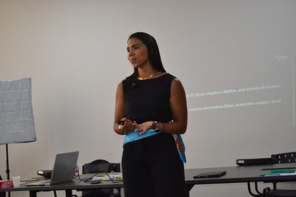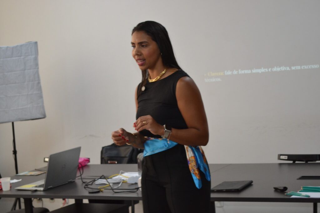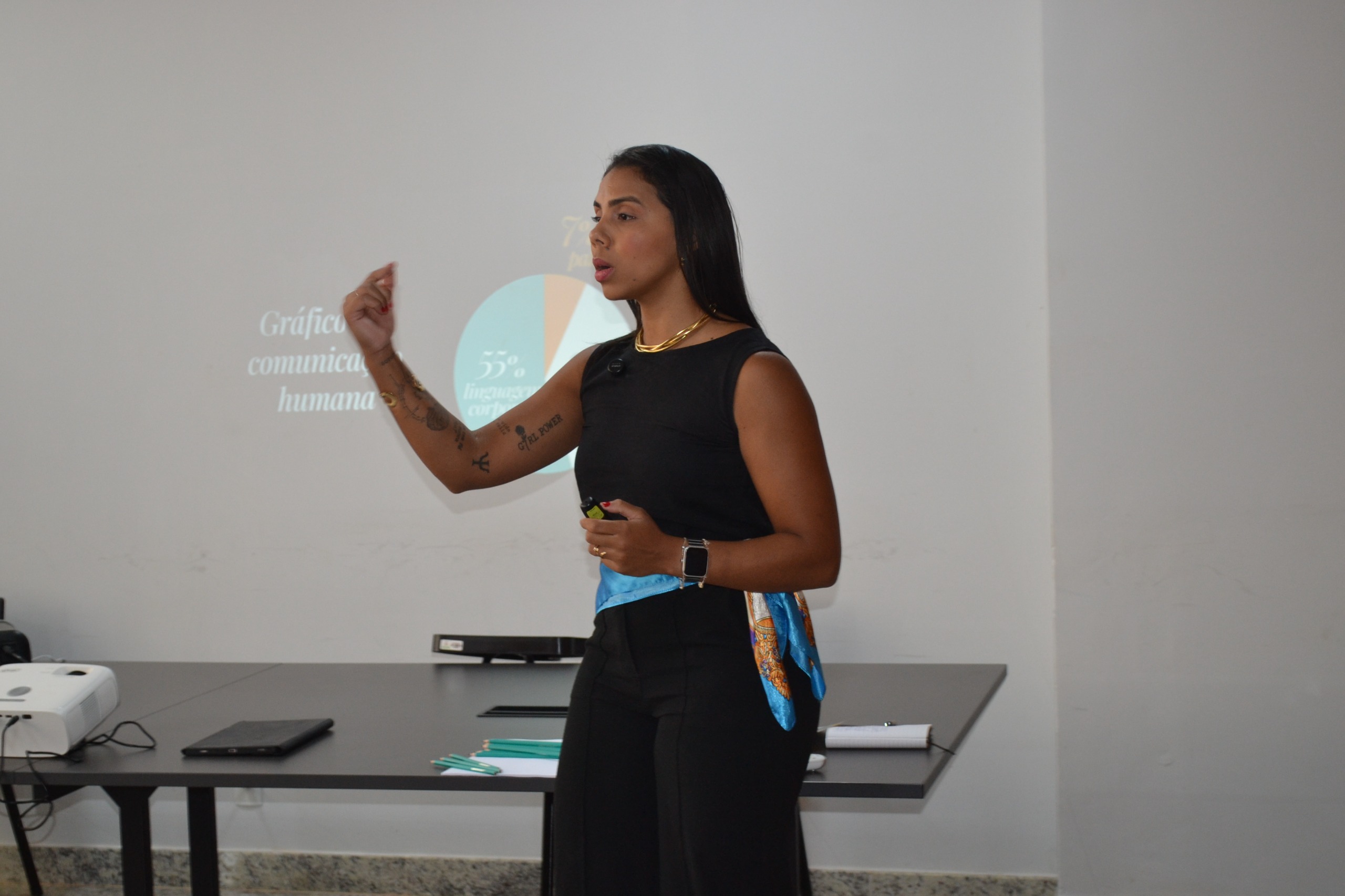 O curso foi ministrado pela psicóloga e instrutora de oratória Jociele Moura e abordou técnicas de expressão verbal, comunicação assertiva, segurança ao falar em público e postura profissional, ferramentas essenciais para o desempenho das funções exercidas diariamente pelos servidores.