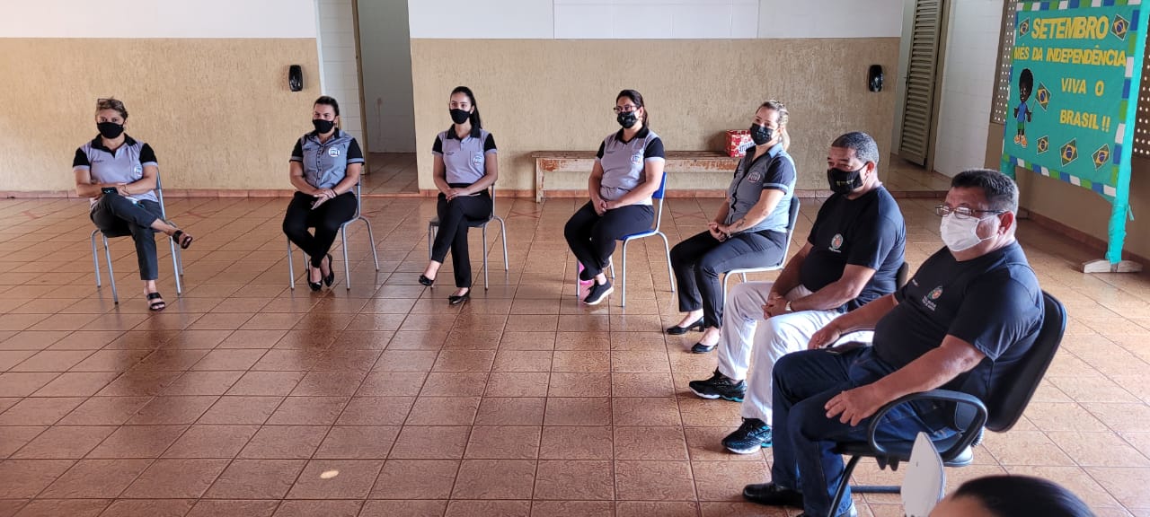 Neste momento, está acontecendo uma reunião entre o Prefeito Municipal de Santa Helena de Goiás, Dr. João Alberto Vieira Rodrigues, Secretária de Educação e Cultura, profa Rosemary Borges, gestora Vanderlucia e professores da Escola Municipal Militarizada Pedro Romualdo Cabral.