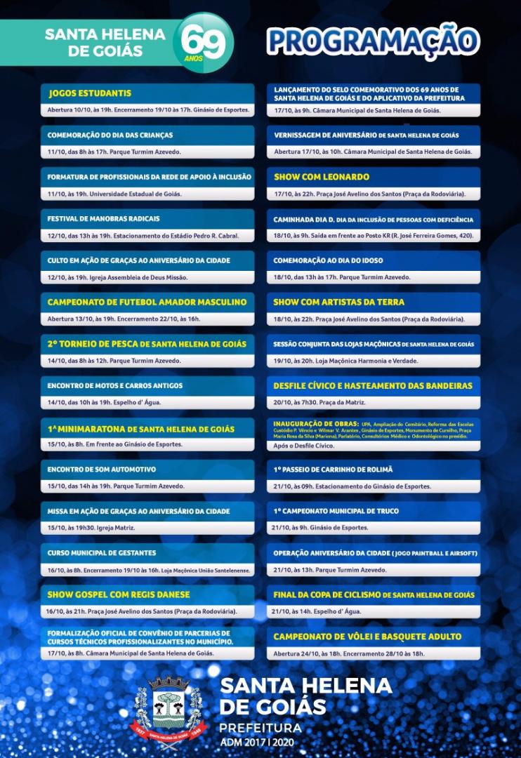 Visite a Página da Prefeitura de Santa Helena de Goiás no Facebook e acompanhe as reportagens com fotos dos eventos comemorativos aos 69 anos da nossa cidade: https://www.facebook.com/stahelenago