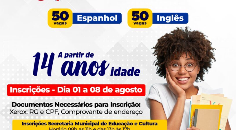 As aulas são 100% gratuitas. As inscrições estão sendo realizadas na Secretaria Municipal de Educação e Cultura. Aproveite essa chance de aprimorar seus conhecimentos em idiomas!