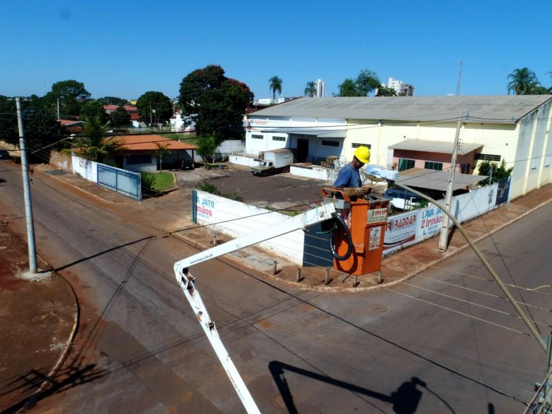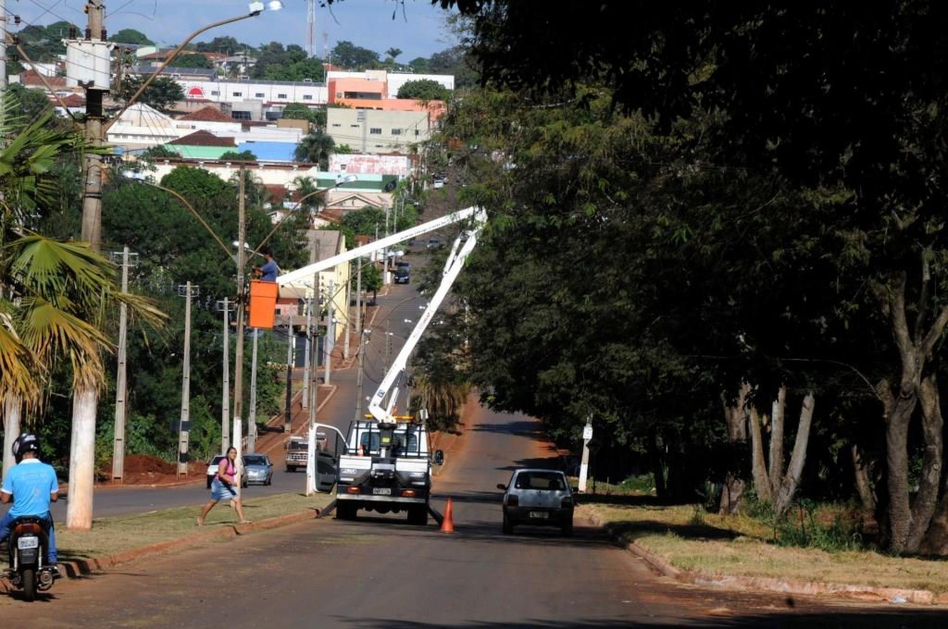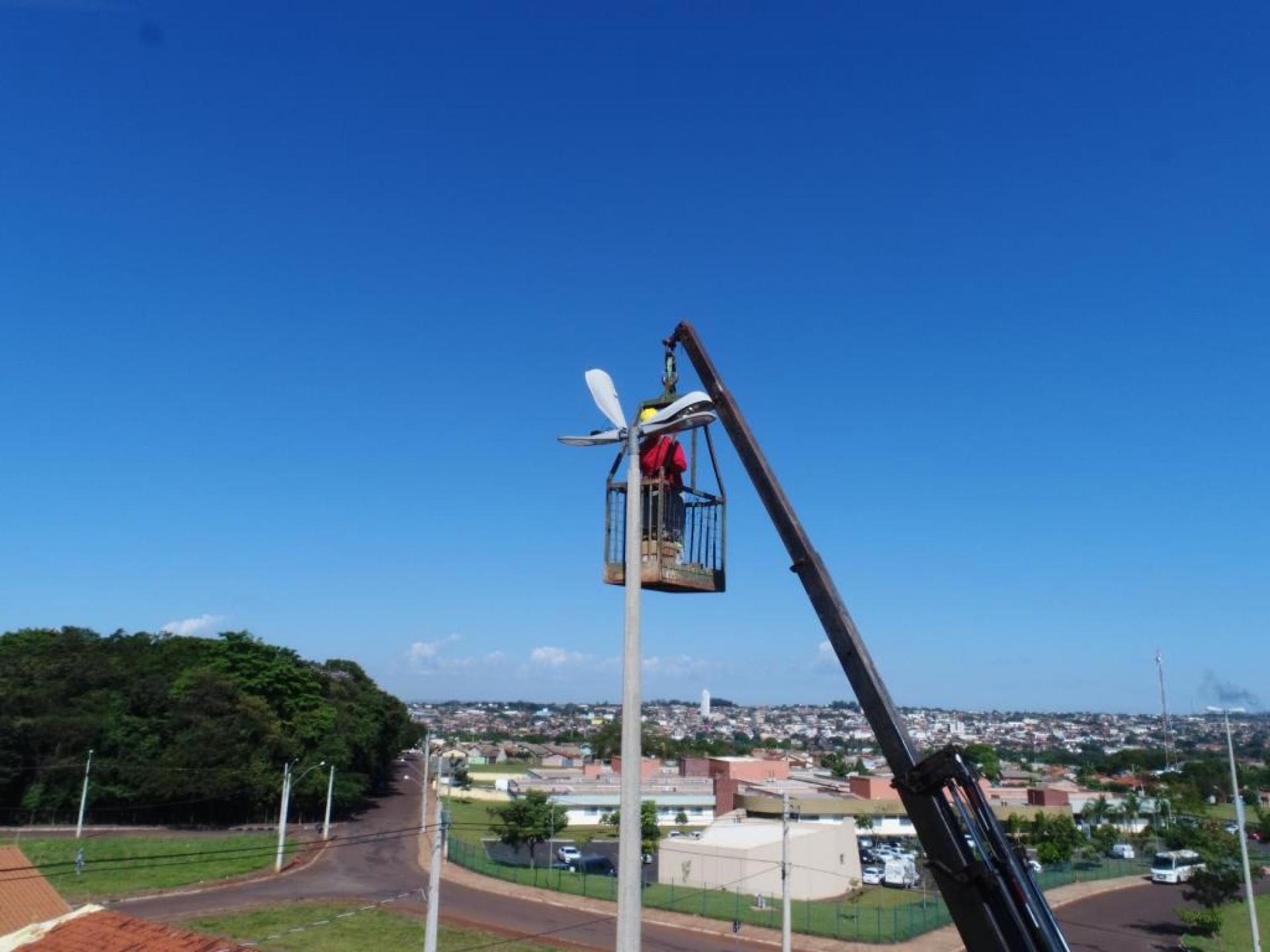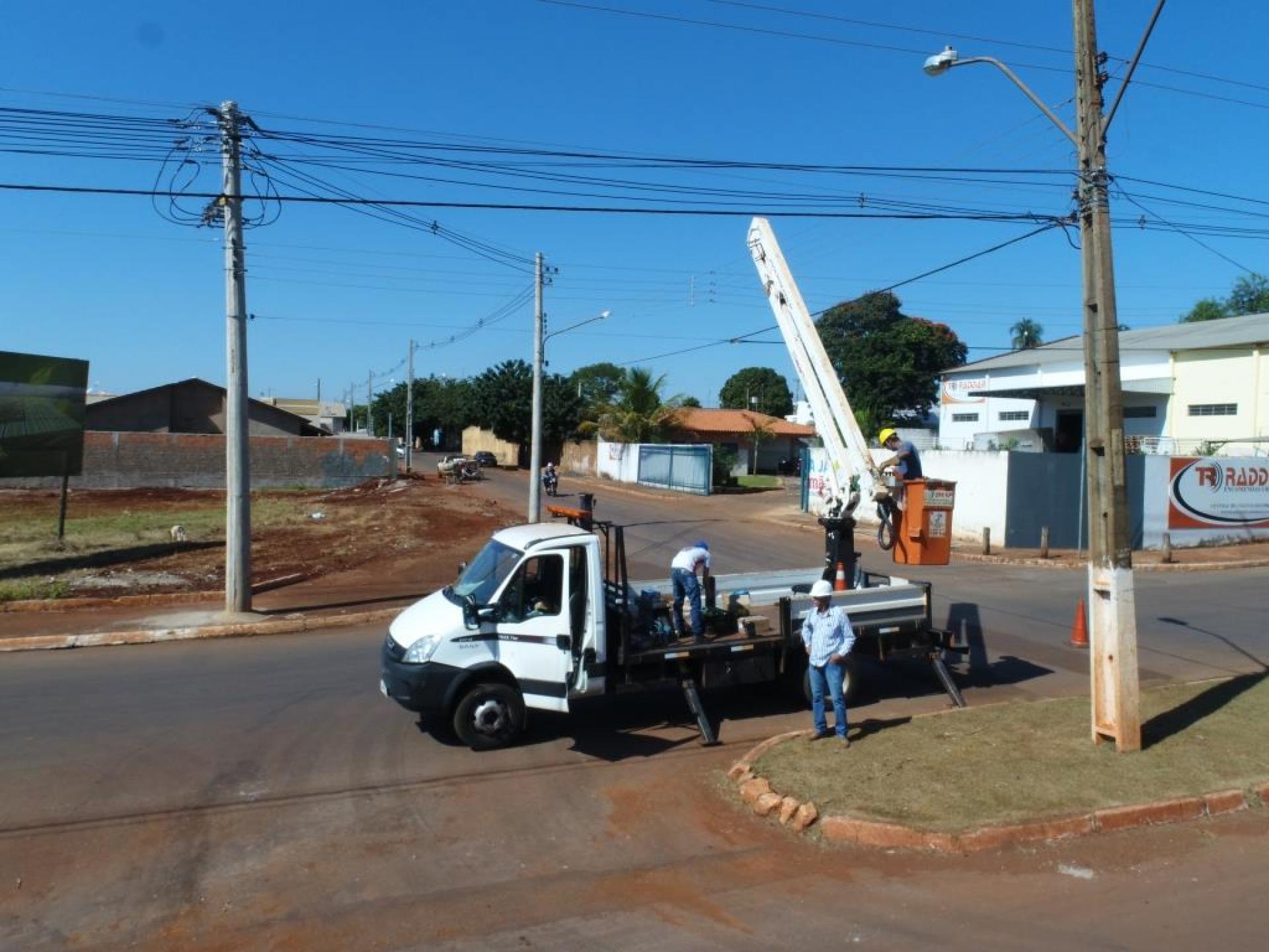 Um caminhão munck com cesto aéreo de maior capacidade de altura está na nossa cidade fazendo a troca de lâmpadas de difícil alcance em inúmeros locais. Pelos bairros, outras lâmpadas também estão sendo trocadas e passando por manutenção.