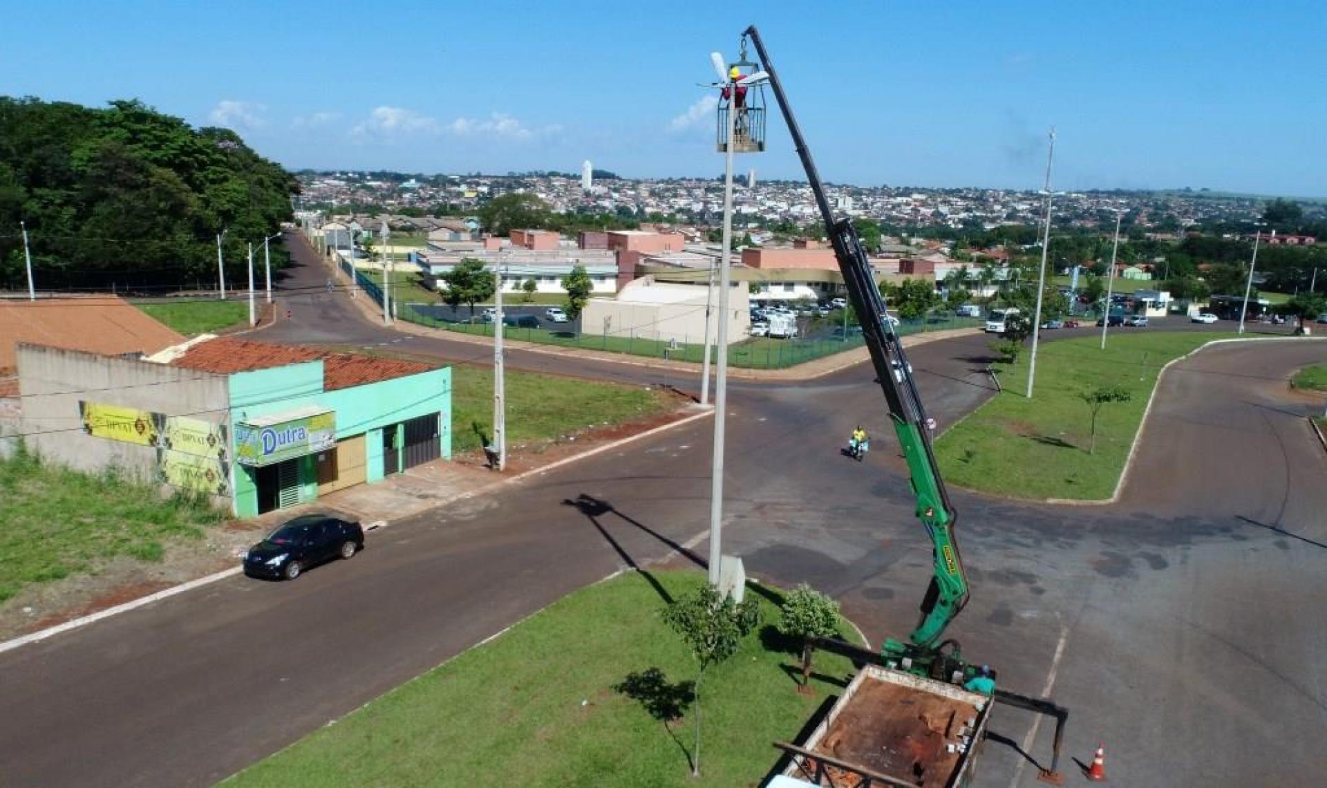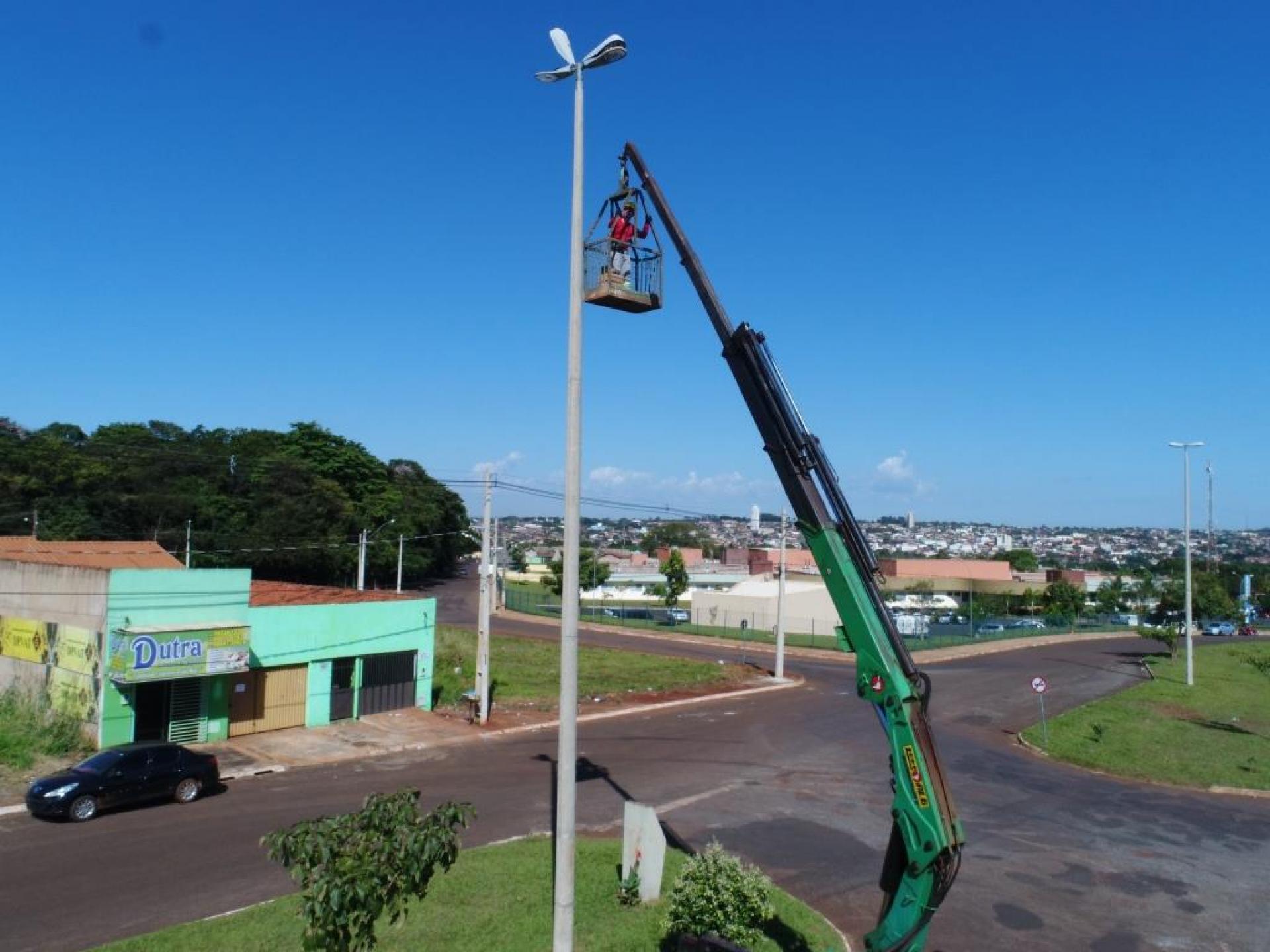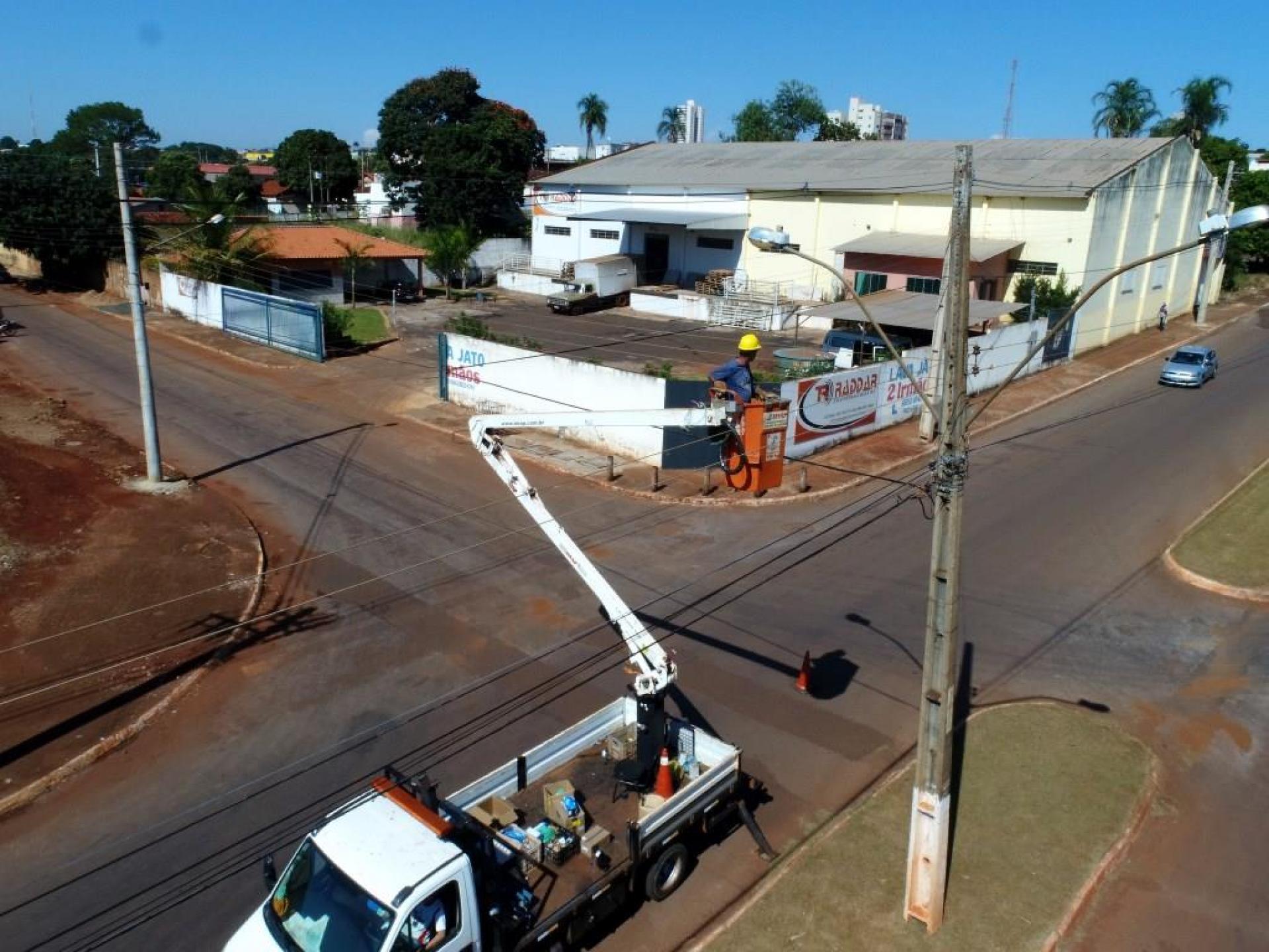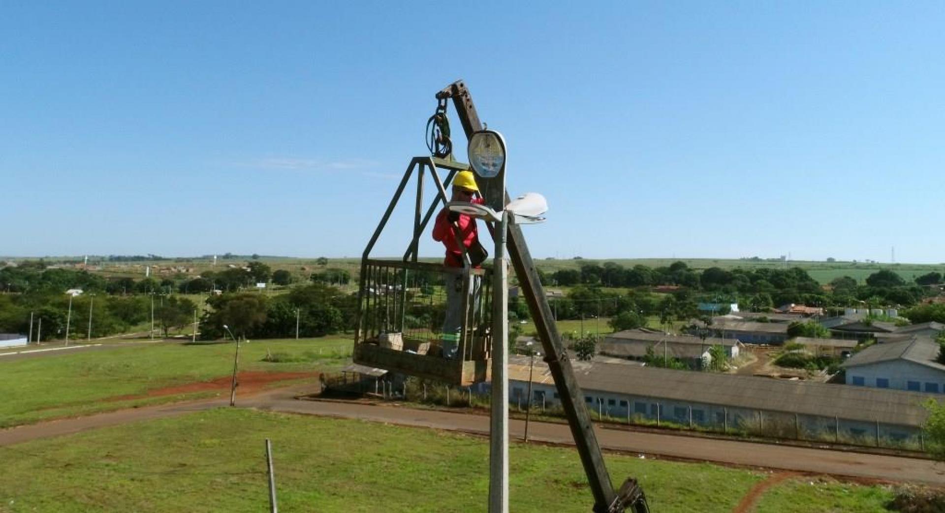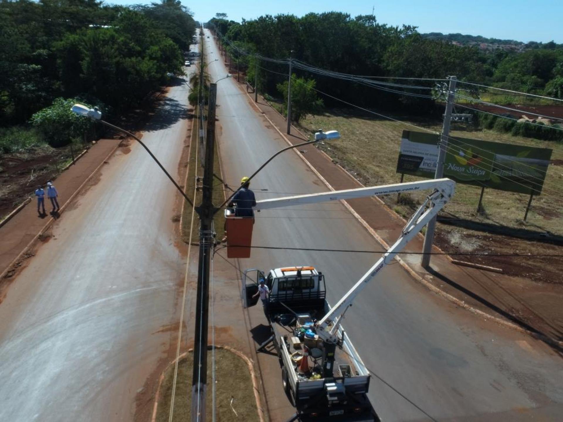 Um caminhão munck com cesto aéreo de maior capacidade de altura está na nossa cidade fazendo a troca de lâmpadas de difícil alcance em inúmeros locais. Pelos bairros, outras lâmpadas também estão sendo trocadas e passando por manutenção.