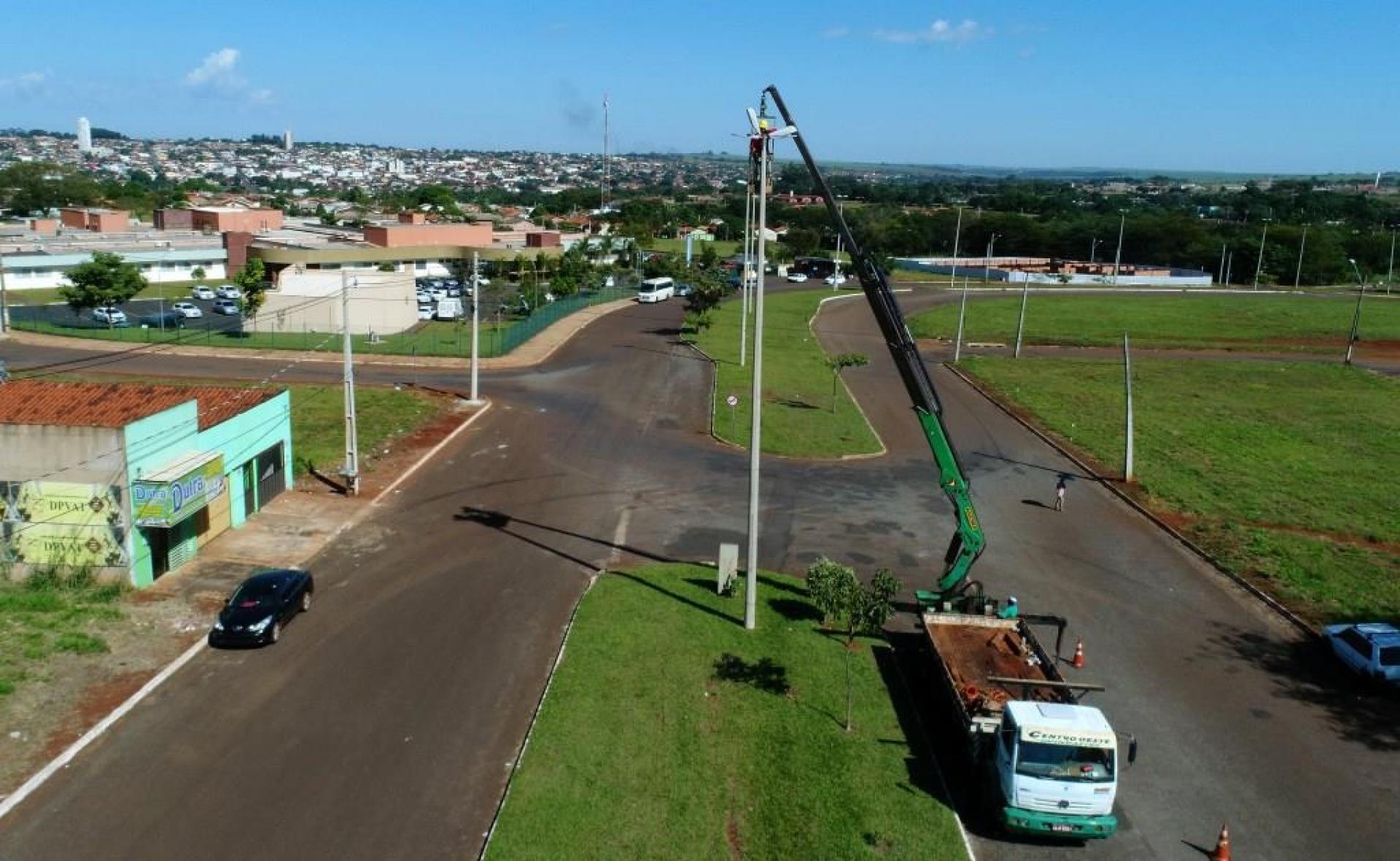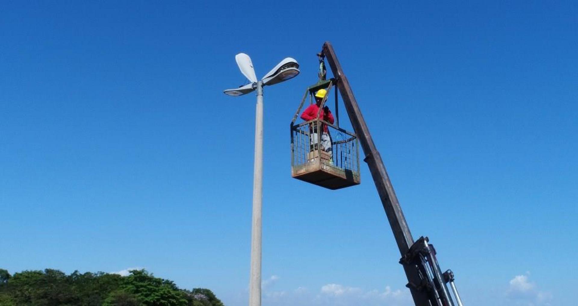 Um caminhão munck com cesto aéreo de maior capacidade de altura está na nossa cidade fazendo a troca de lâmpadas de difícil alcance em inúmeros locais. Pelos bairros, outras lâmpadas também estão sendo trocadas e passando por manutenção.