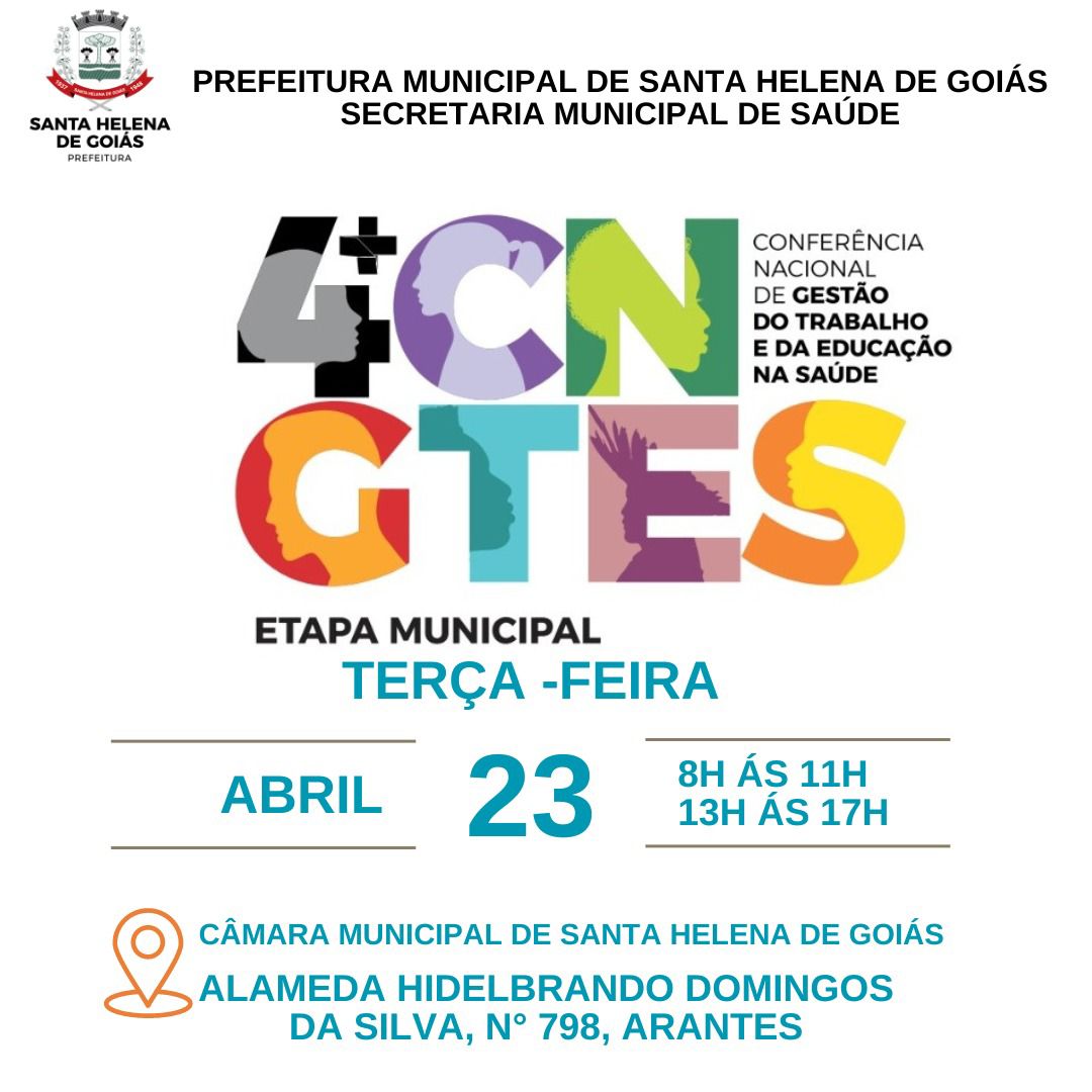 No dia 23 de abril, você é nosso convidado para a etapa municipal da 4ª Conferência Nacional de Gestão do Trabalho e da Educação na Saúde, em Santa Helena de Goiás.