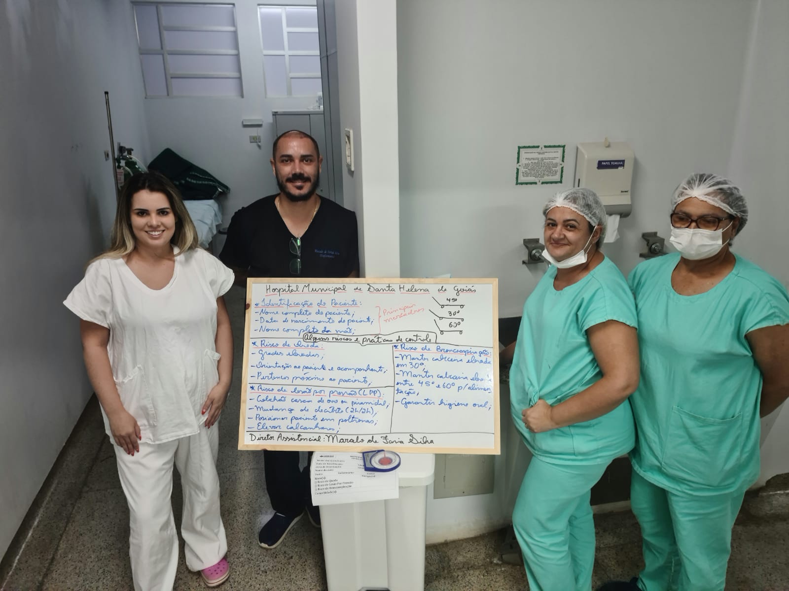 Treinamento (educação continuada) realizado pelo Diretor Assistencial Marcelo nos dias 06 e 07 de Fevereiro de 2023 para toda Equipe de Enfermagem do Hospital Municipal de Santa Helena de Goiás, voltado para a Qualidade e Segurança do Paciente sobre Identificação do Paciente (principais marcadores), Riscos e suas Práticas de Controle para Identificação e Prevenção de Queda, Lesão Por Pressão e Broncoaspiração.