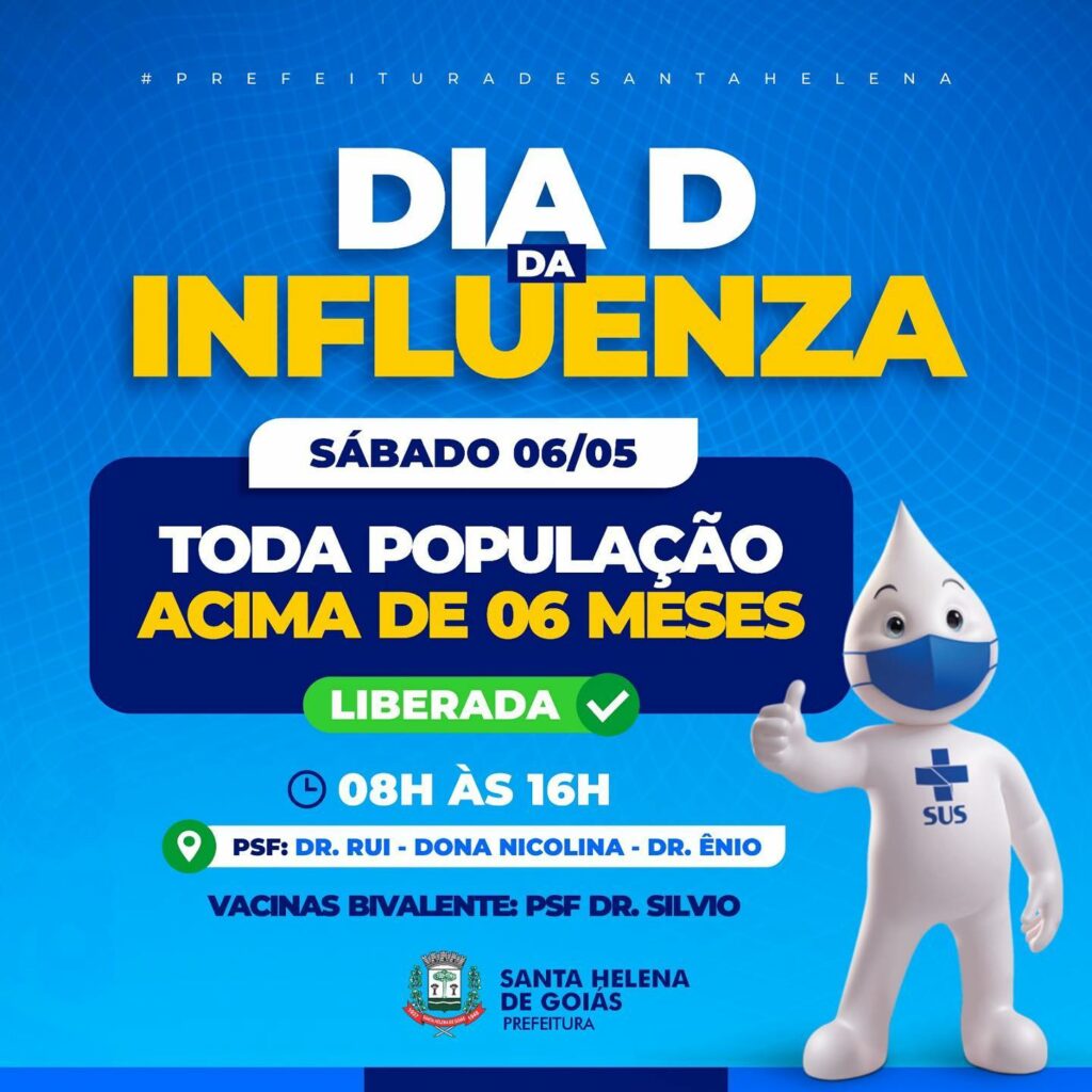 Ótima notícia! A vacinação contra a influenza agora está disponível para toda população acima de 06 meses de idade em nossa cidade. Não perca tempo, participe do dia “D” e vacine-se!