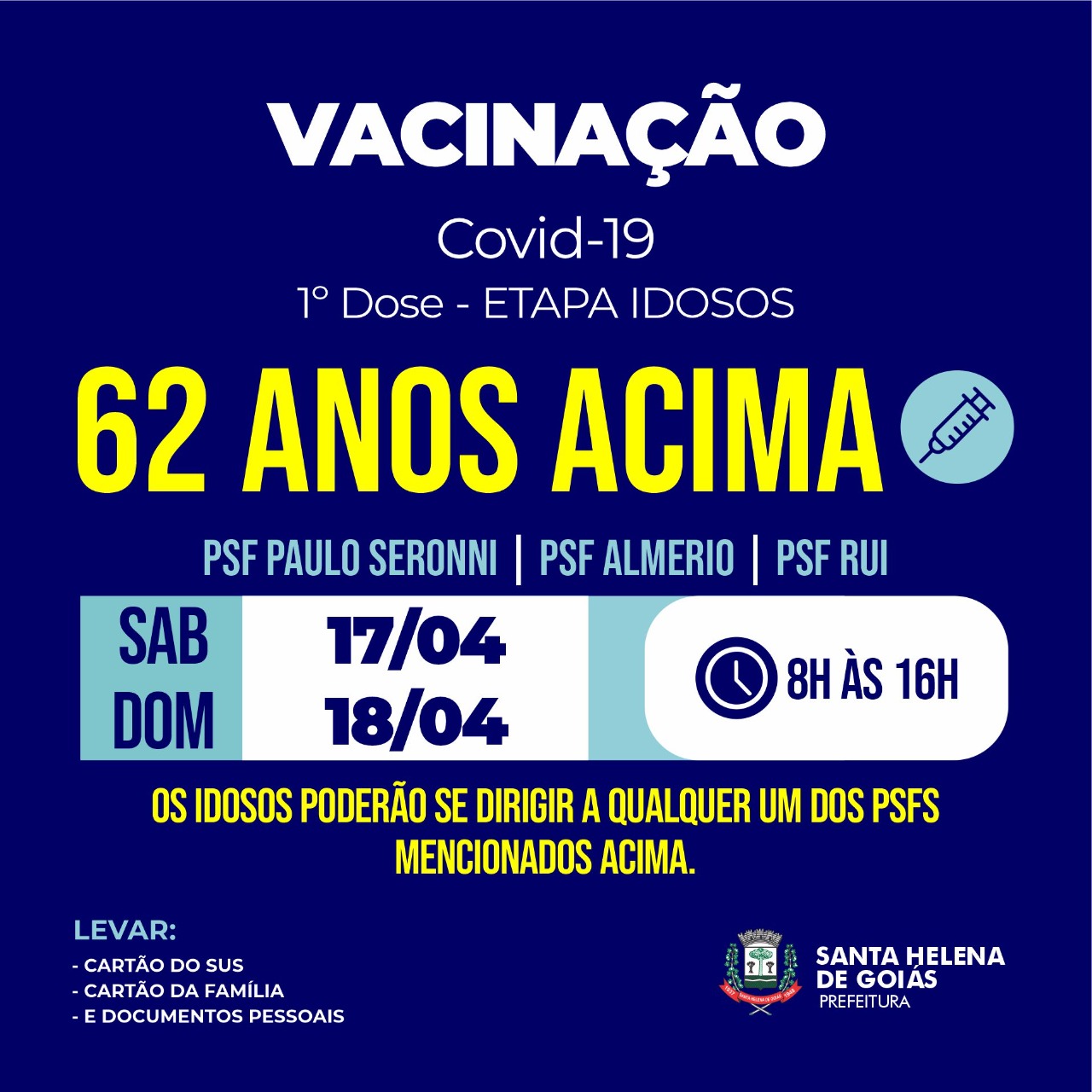 Confira o cronograma de vacinação - etapa 62 anos acima, no sábado e domingo (17 e 18/04), nas Dr. Paulo Seronni, Almerio e Dr. Rui.