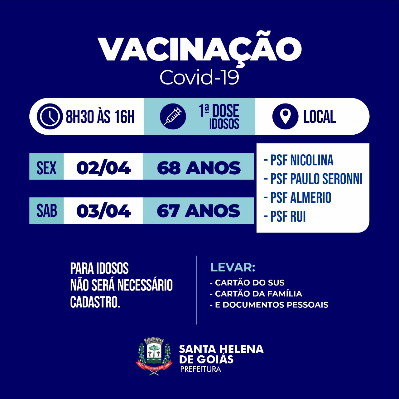 Confira o cronograma de vacinação - etapa 67 anos acima, nos dias 02 e 03 de Abril, nas UBS D. Nicolina, Dr. Paulo Seronni, Almerio e Dr. Rui.