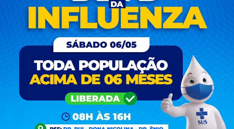 Ótima notícia! A vacinação contra a influenza agora está disponível para toda população acima de 06 meses de idade em nossa cidade. Não perca tempo, participe do dia “D” e vacine-se!