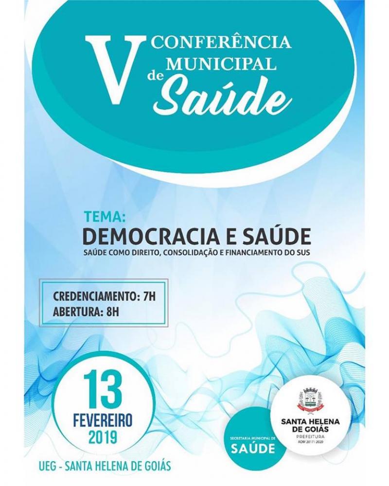 A Prefeitura Municipal de Santa Helena de Goiás, por meio da Secretaria de Saúde, realiza a 5ª Conferência Municipal de Saúde, no dia 13 de fevereiro, no Auditório da Universidade Estadual de Goiás – UEGSH.